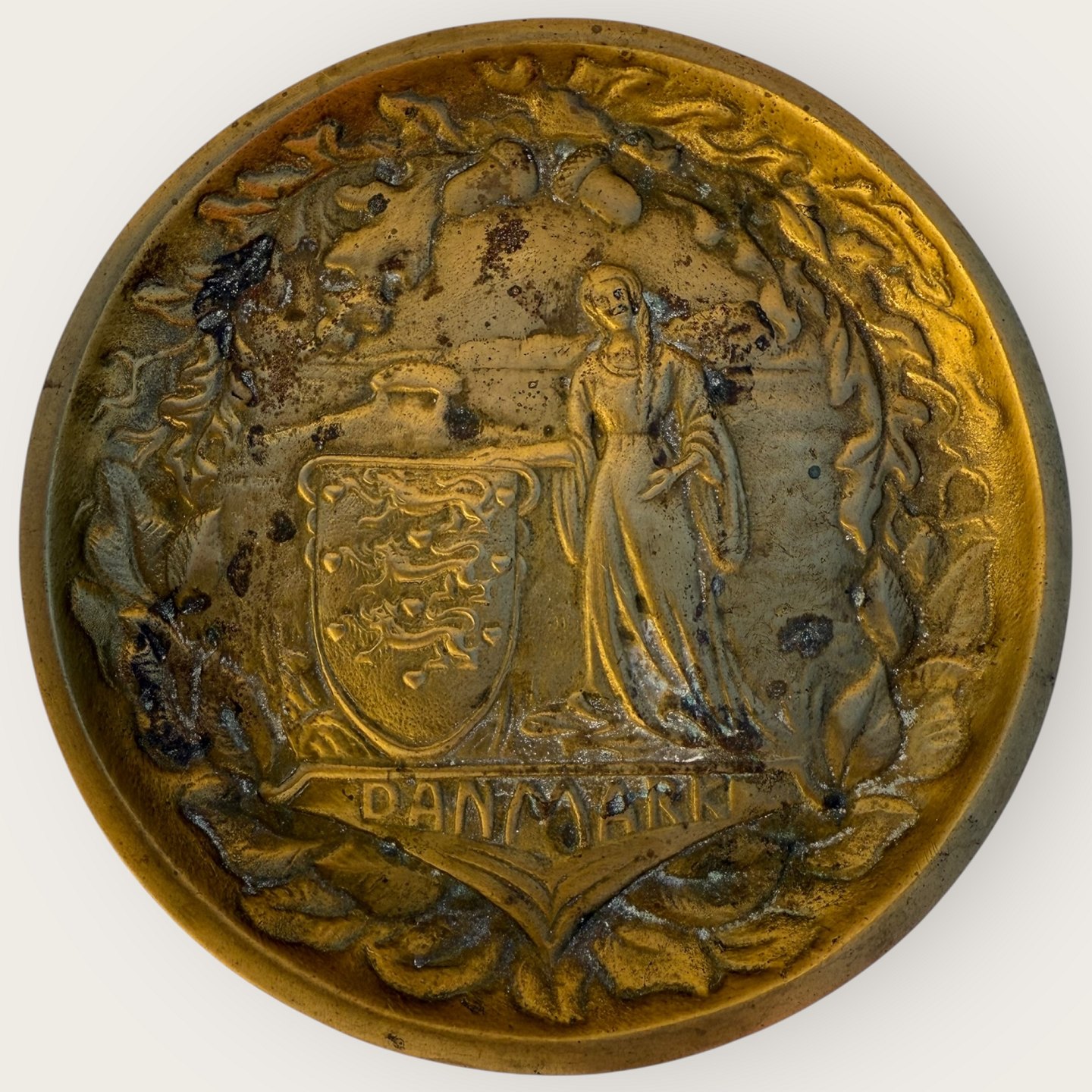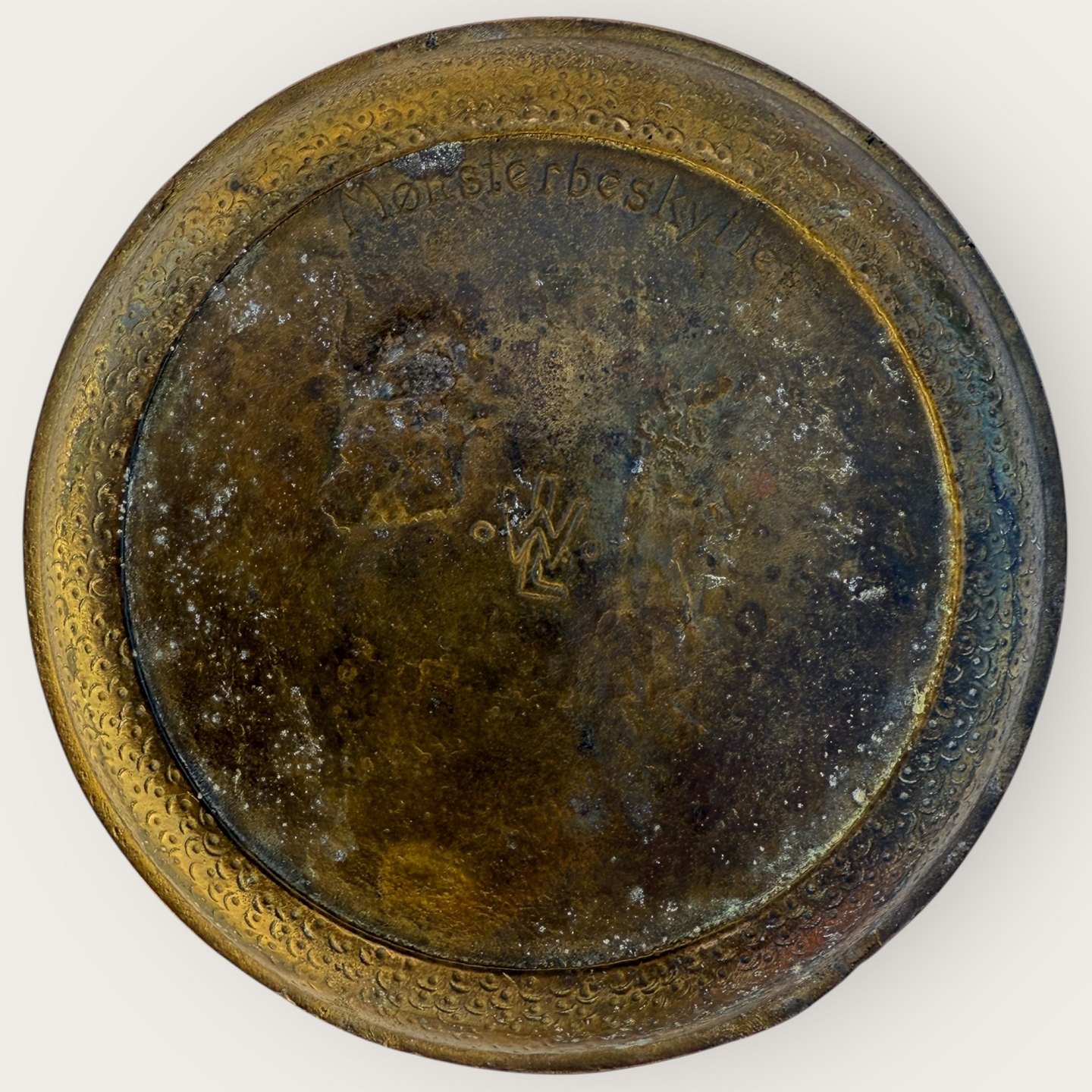 Moder Danmark messing platte, Mærket: LW Mønsterbeskyttet, diameter 16,7cm, *patineret stand*