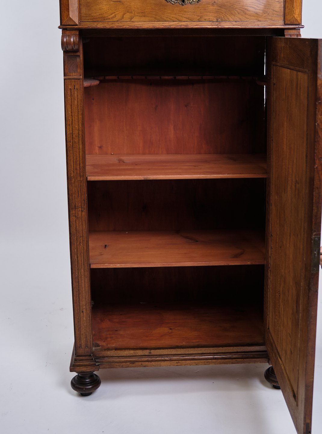 Antikt mahogniskab fra ca. 1880 med udsmykning og runde ben. H: 187,5 cm, B: 73 cm, D: 49 cm. Klassisk dansk snedkerhåndværk.