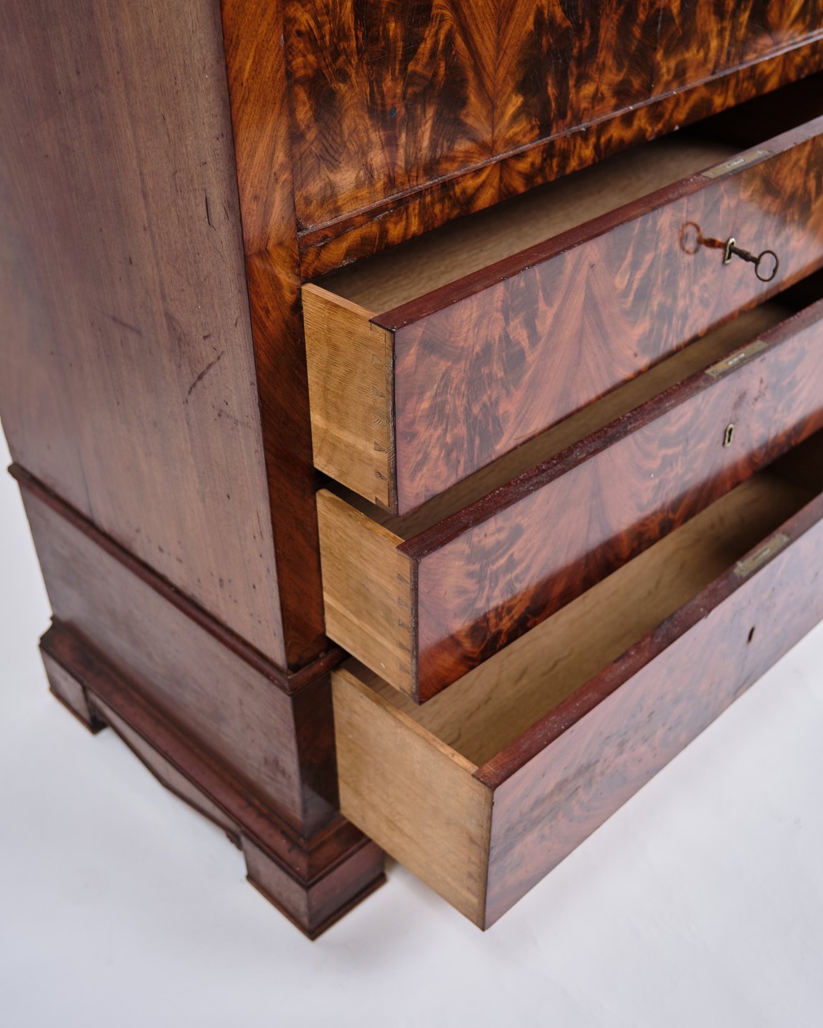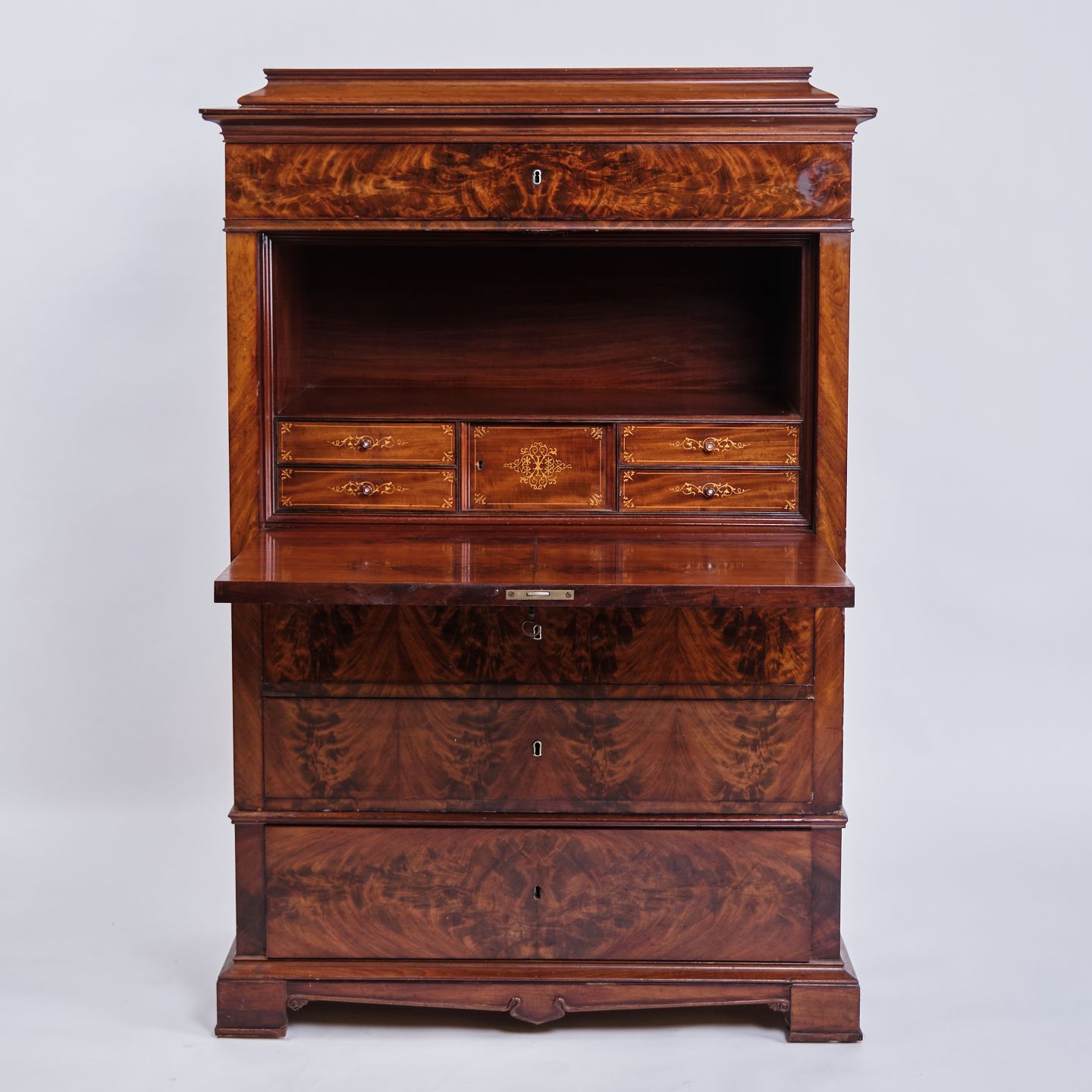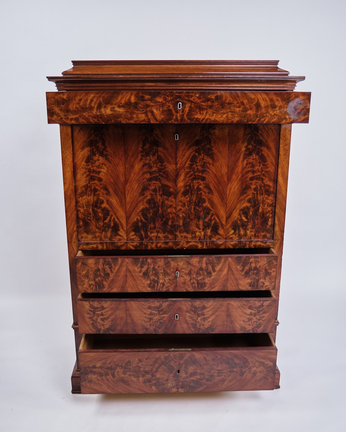 Antik chiffonier fra 1840’erne. Mahogni med intarsia, flamme struktur og 4 skuffer. H: 150 cm, B: 101 cm, D: 52 cm. Klassisk snedkerhåndværk.