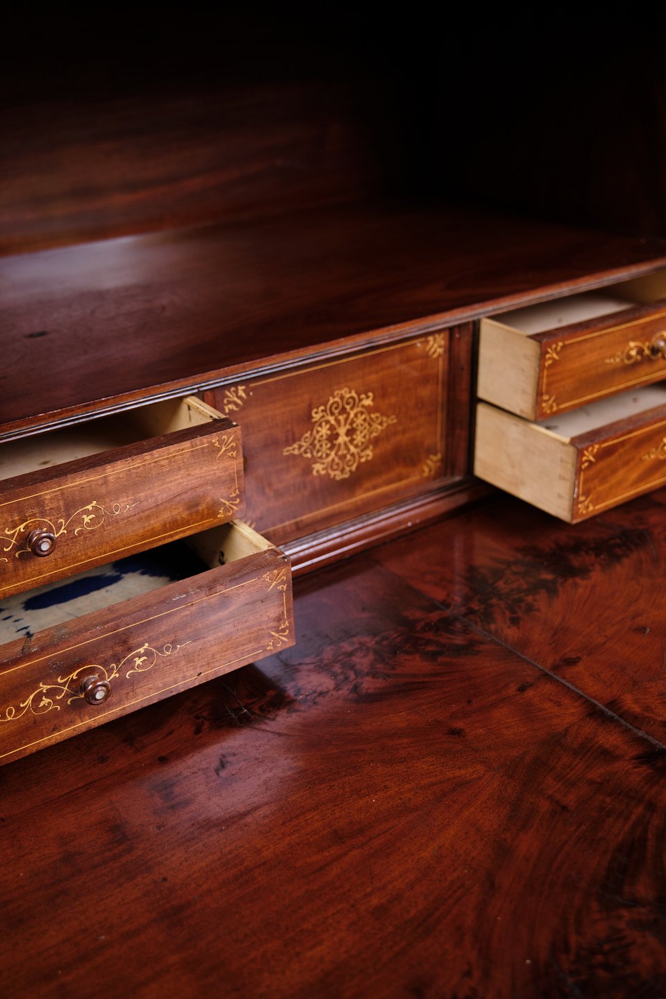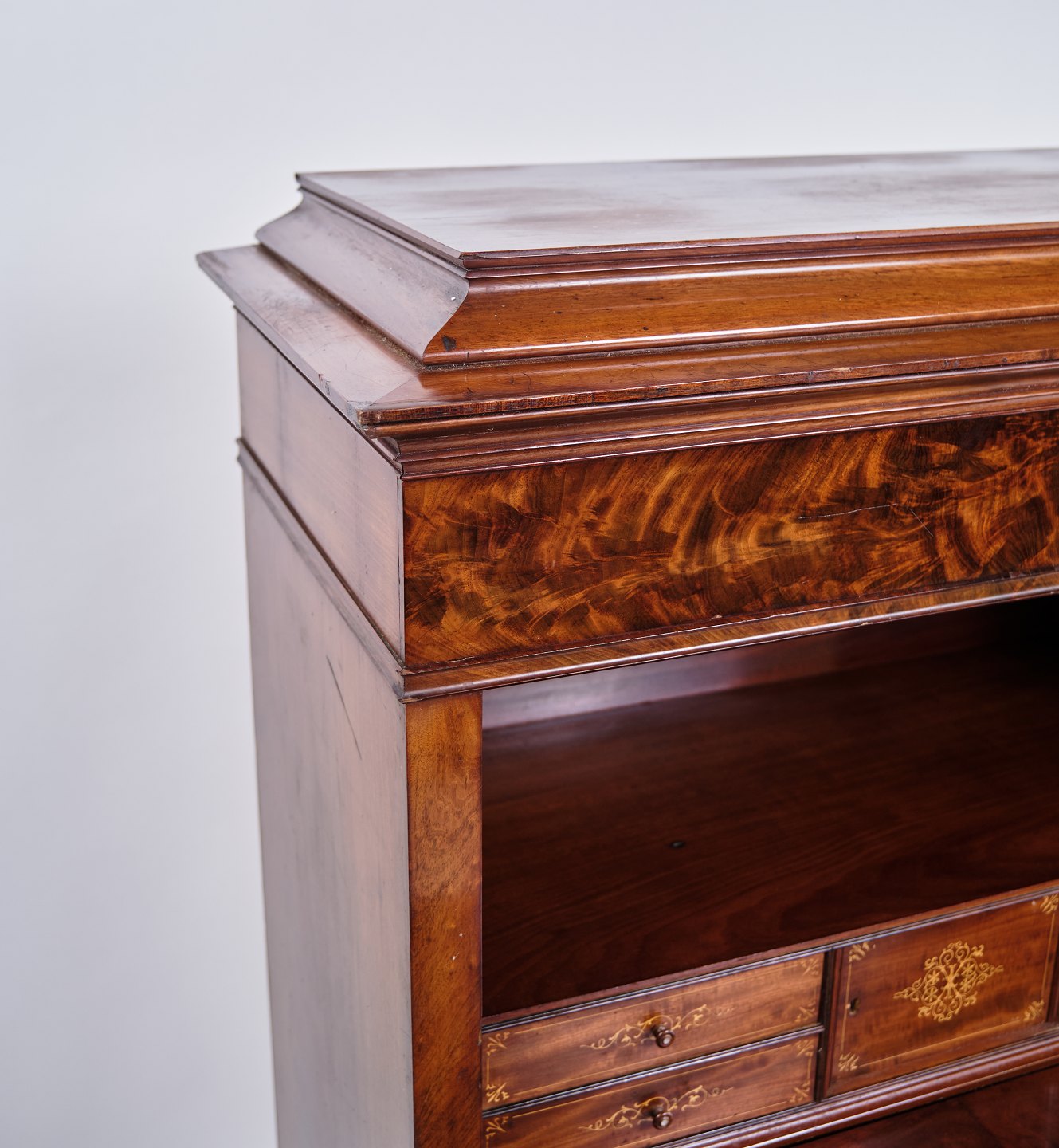 — Materiale: Mahogni med flamme struktur og intarsia