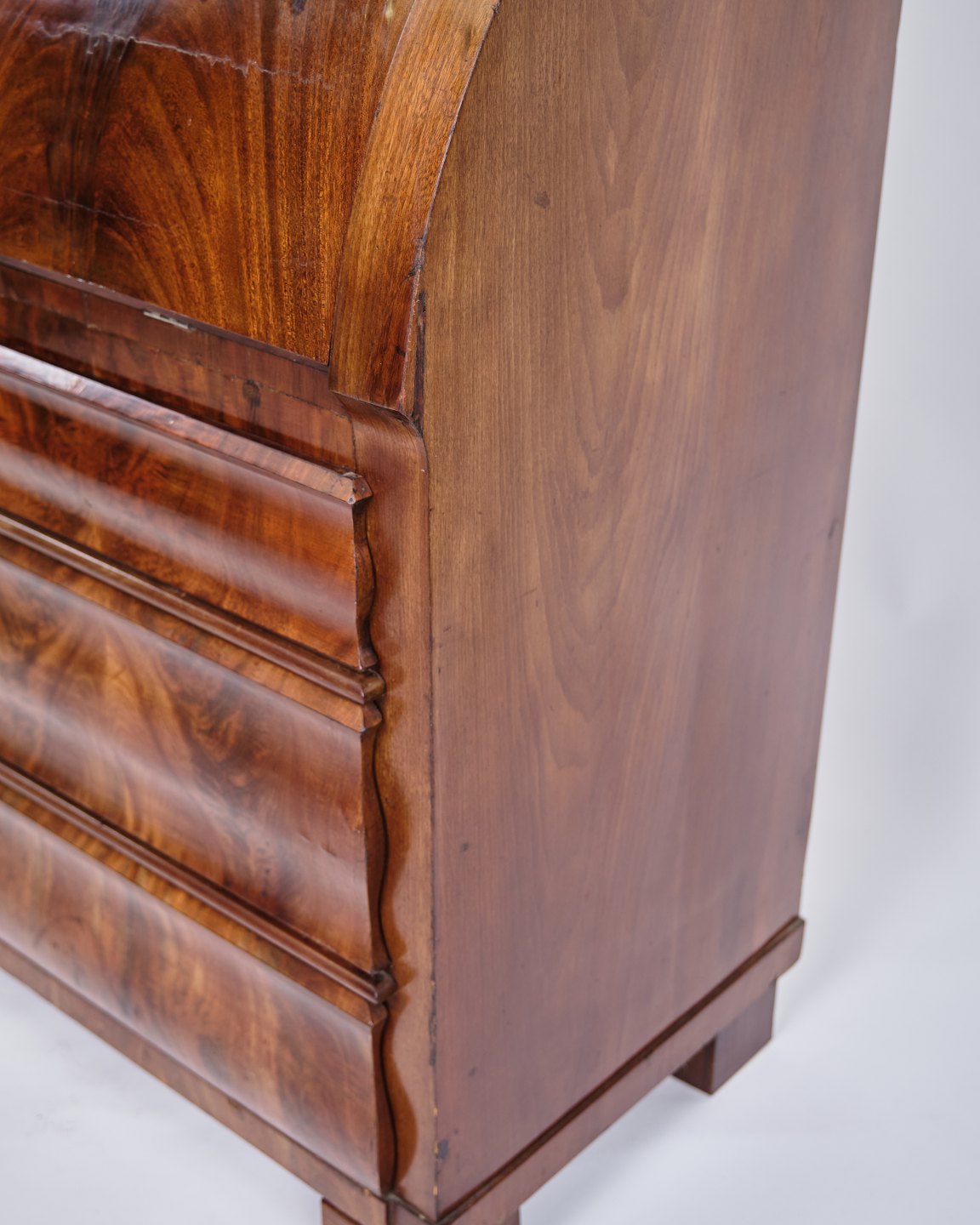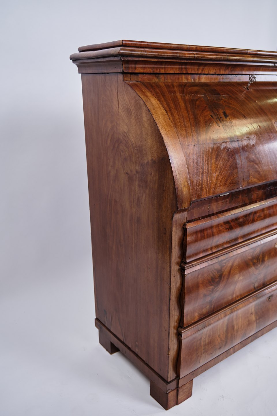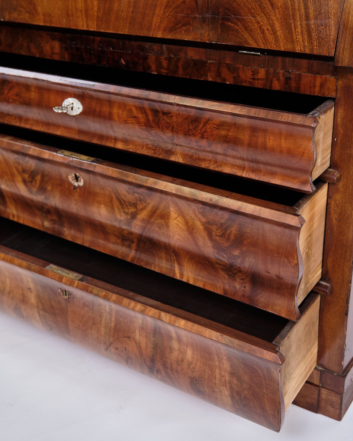 Text zugänglich auf Dänische: Dansk chatol fra 1820’erne. Håndpoleret mahogni med 3 skuffer. H: 118 cm, B: 107 cm, D: 50 cm. Klassisk dansk snedkerhåndværk.