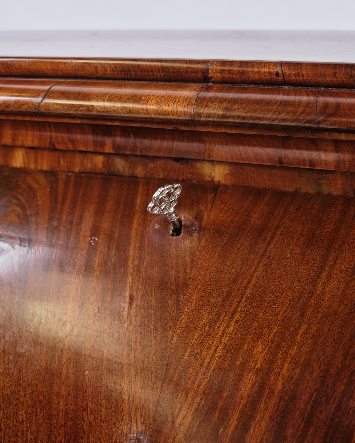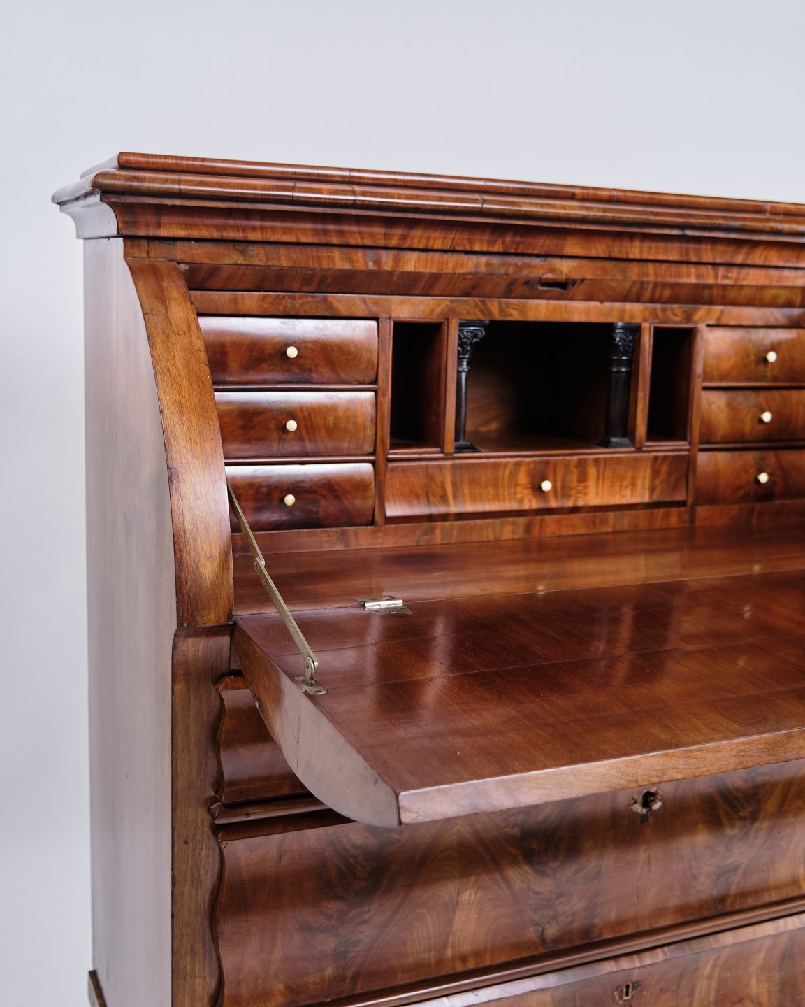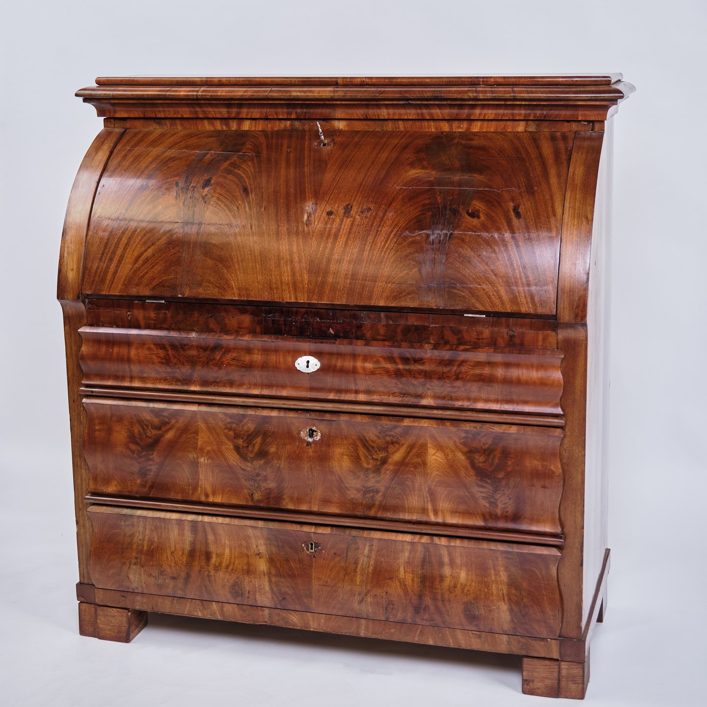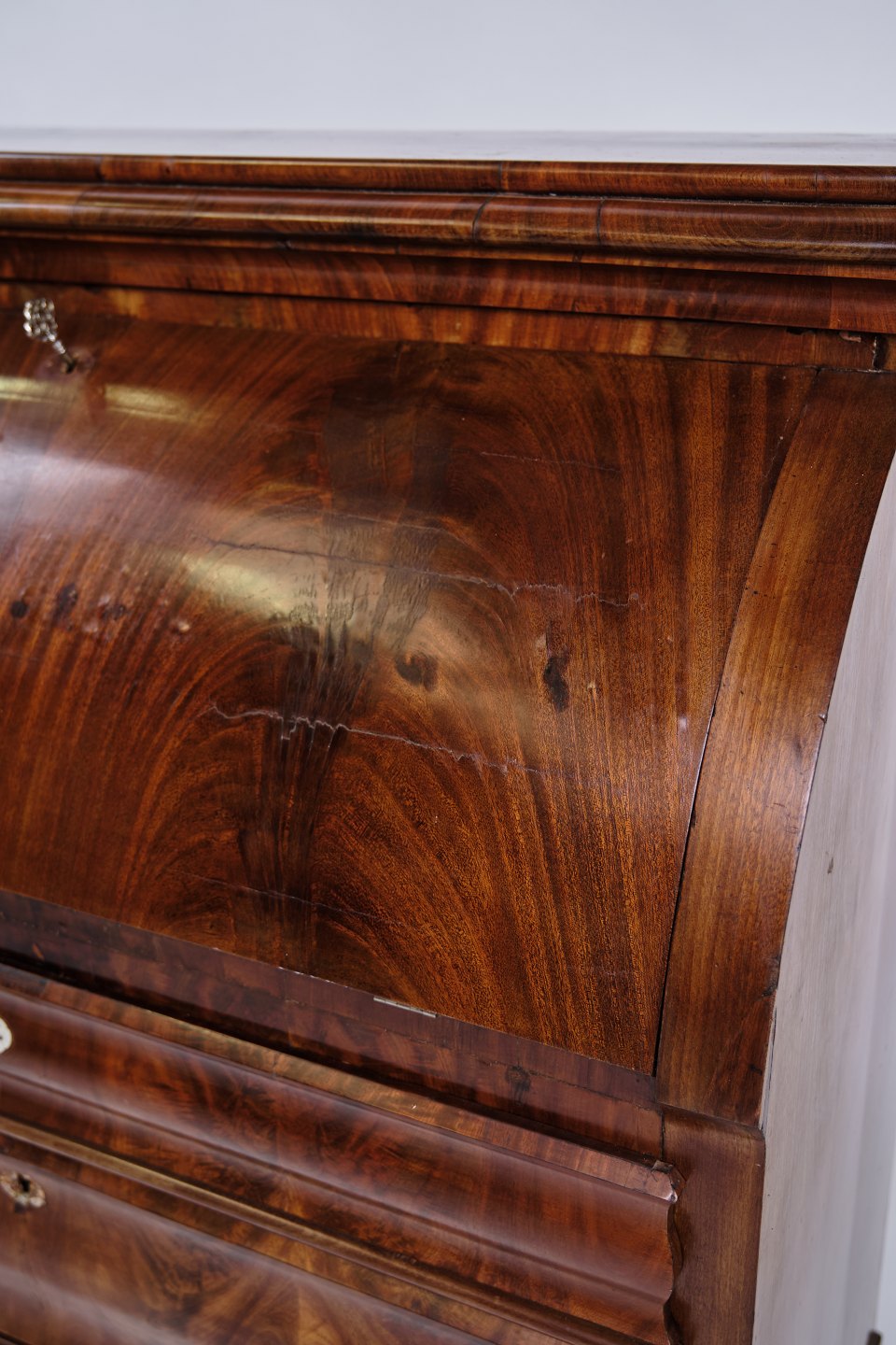 Text zugänglich auf Dänische: Dansk chatol fra 1820’erne. Håndpoleret mahogni med 3 skuffer. H: 118 cm, B: 107 cm, D: 50 cm. Klassisk dansk snedkerhåndværk.