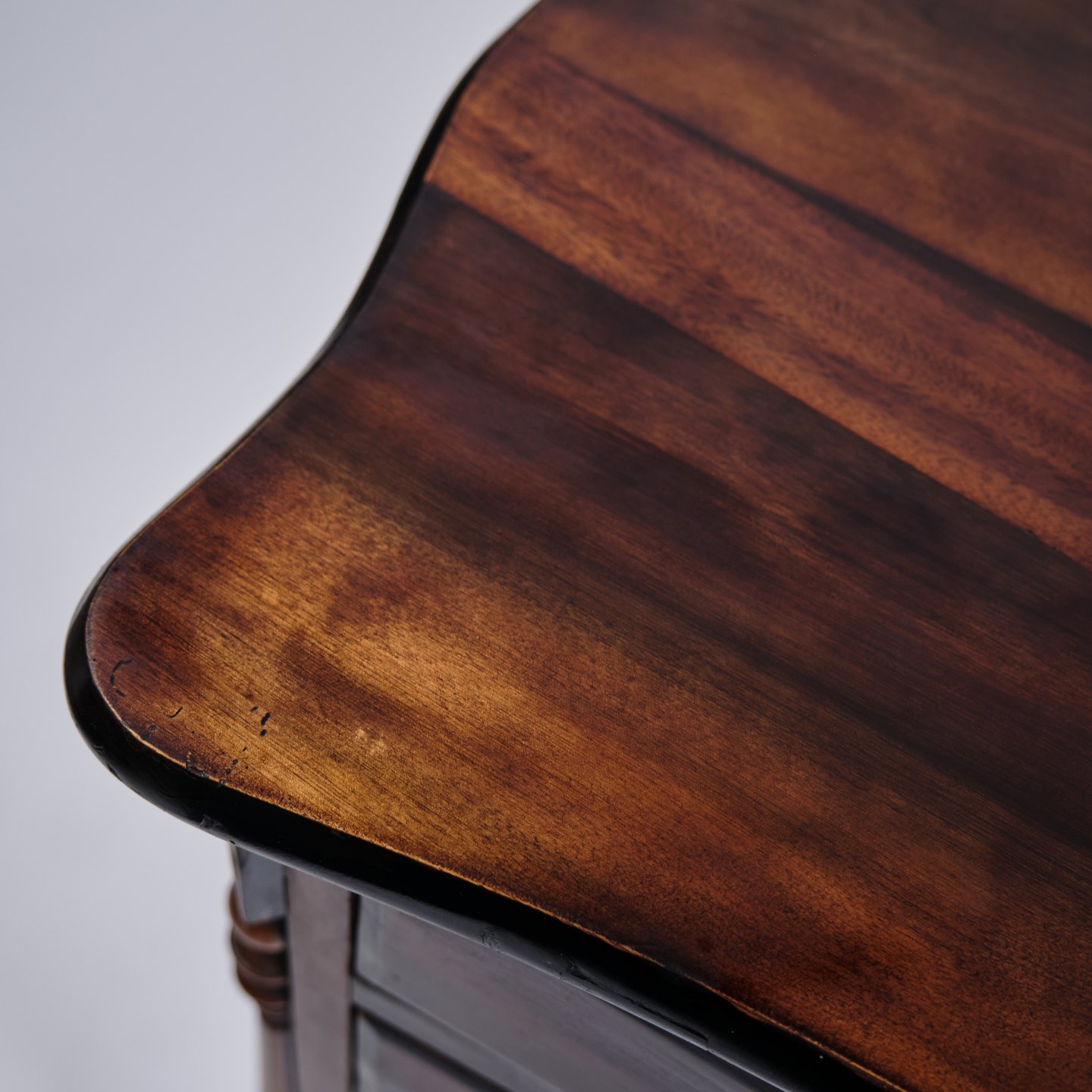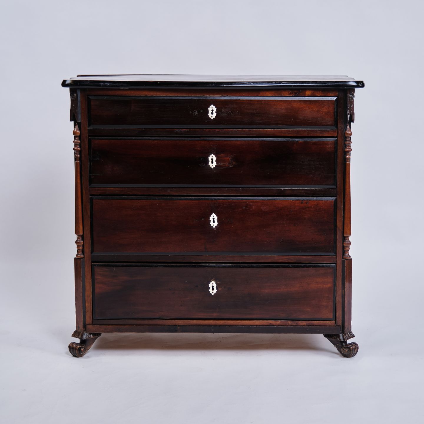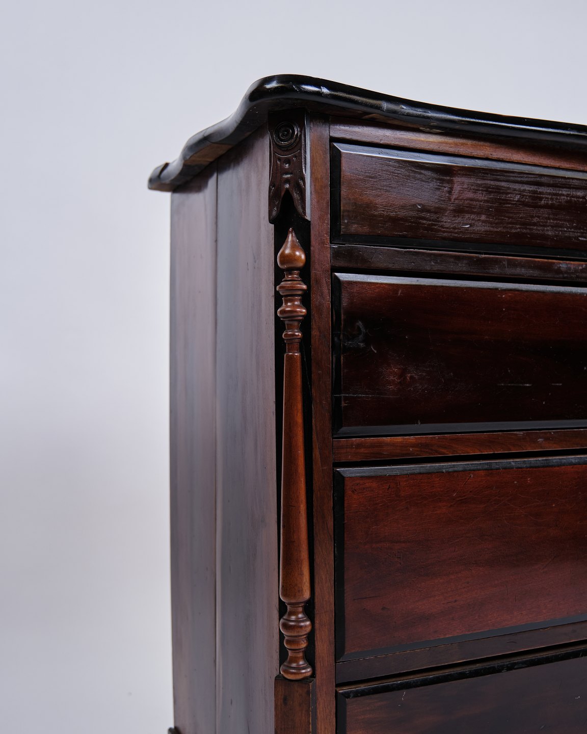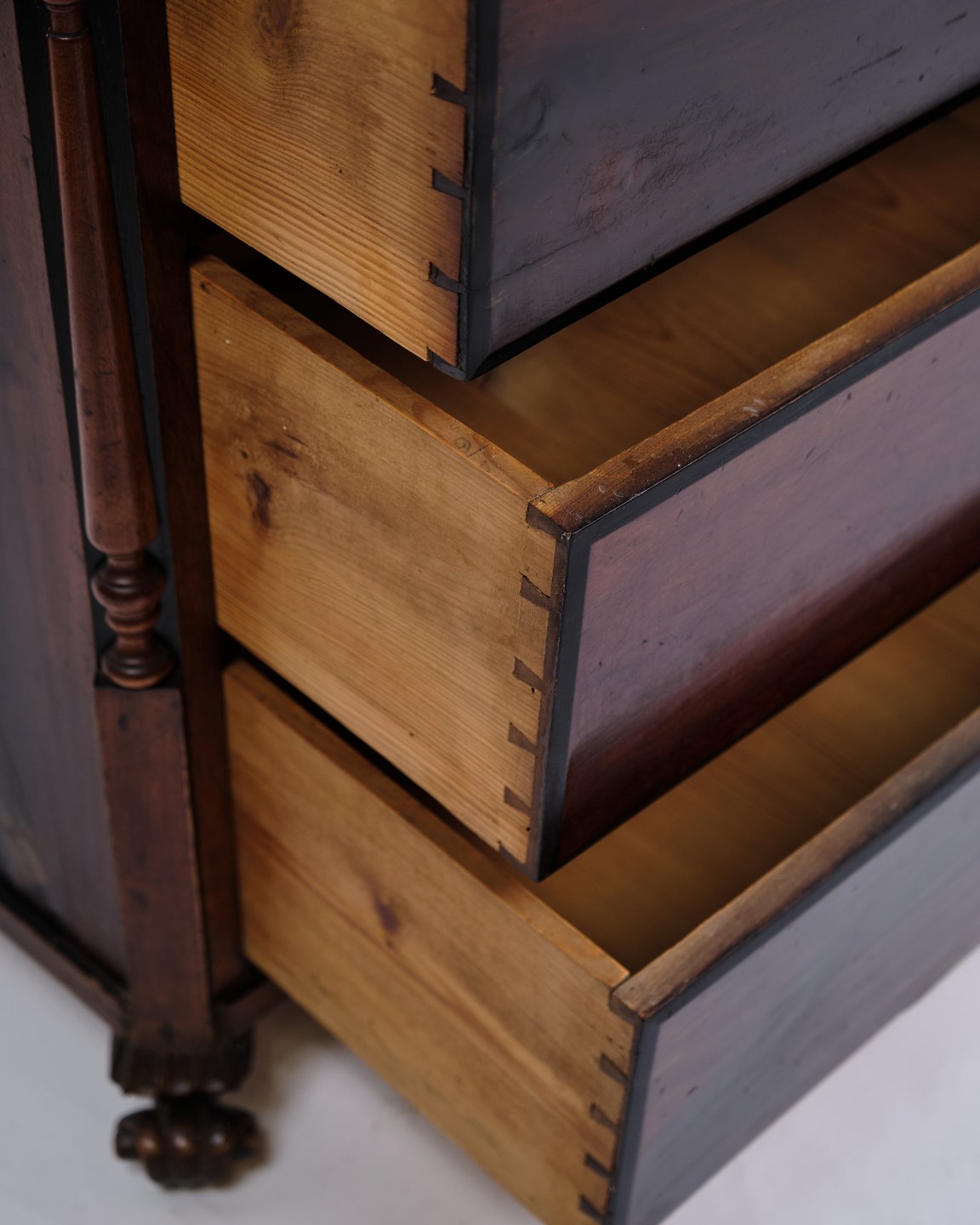 Antik kommode i mahogni fra 1840’erne. Med løvefødder og buet top. H: 85 cm, B: 90 cm, D: 43 cm. Klassisk 1800-tals møbel.