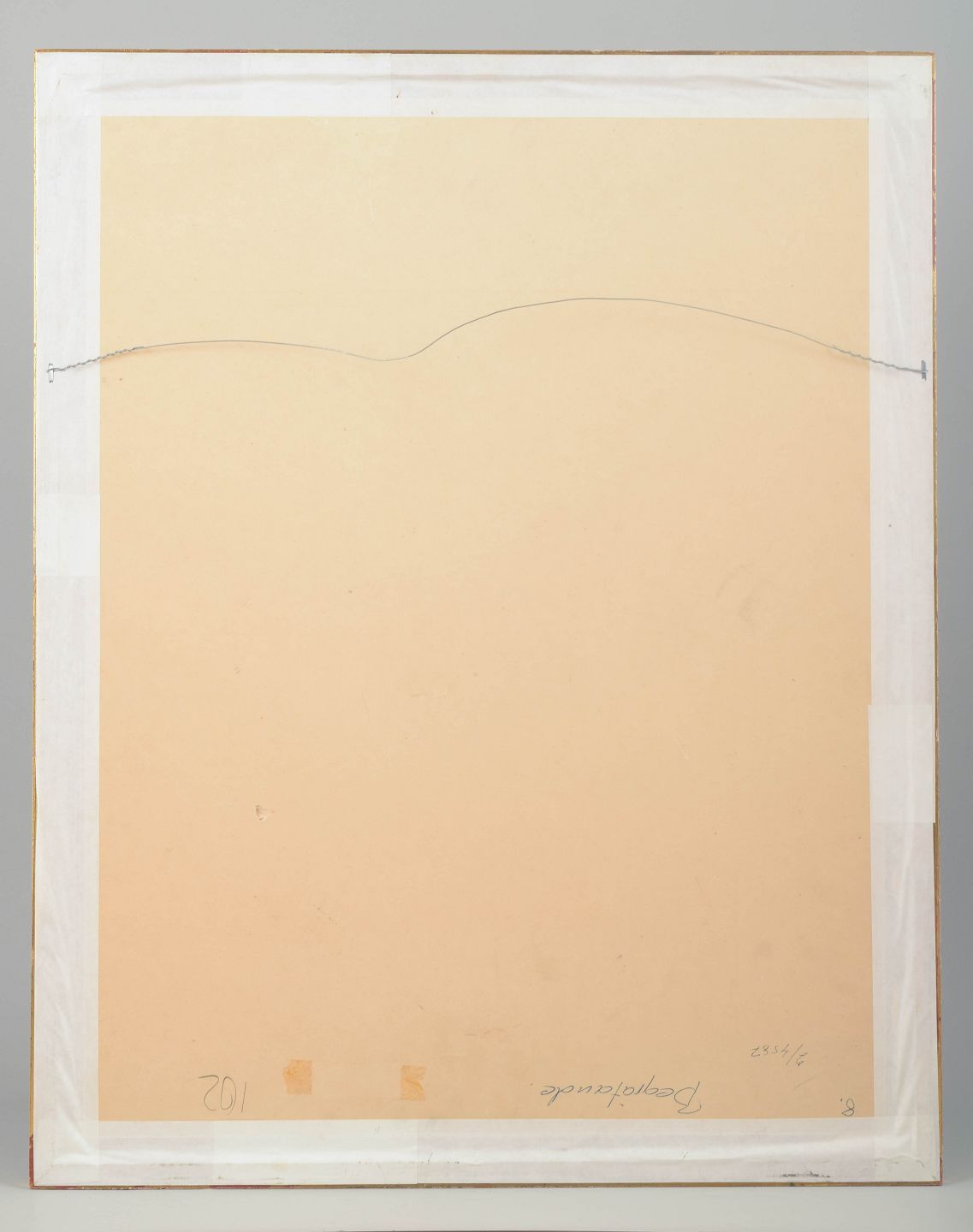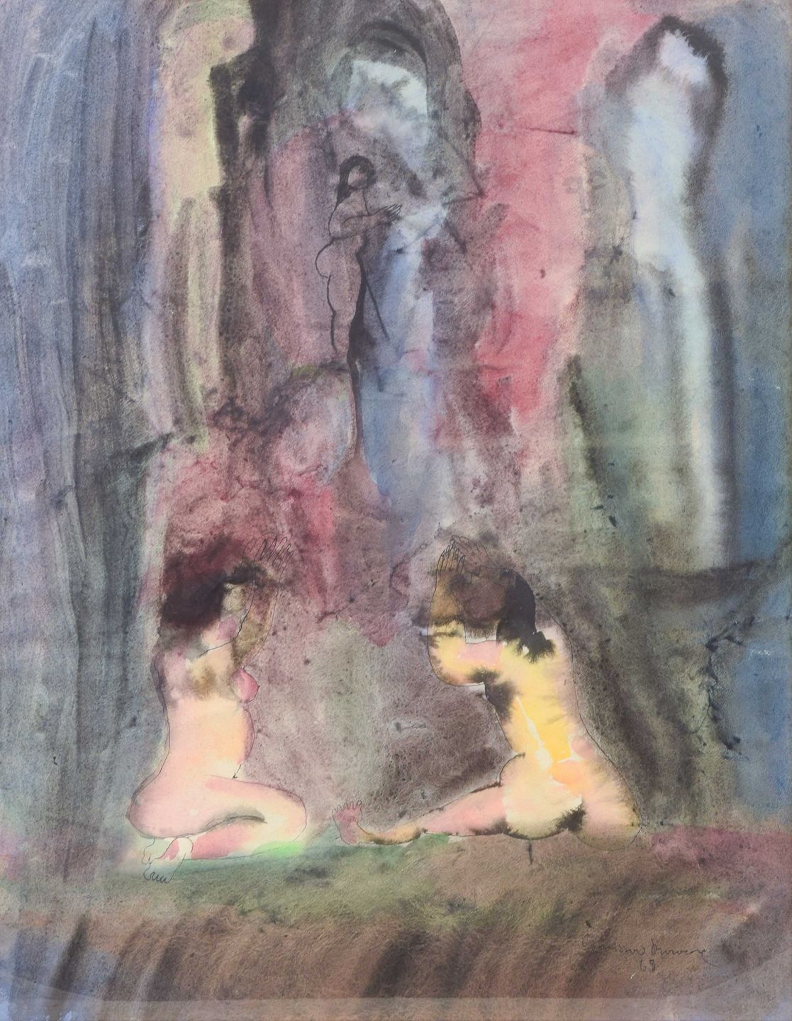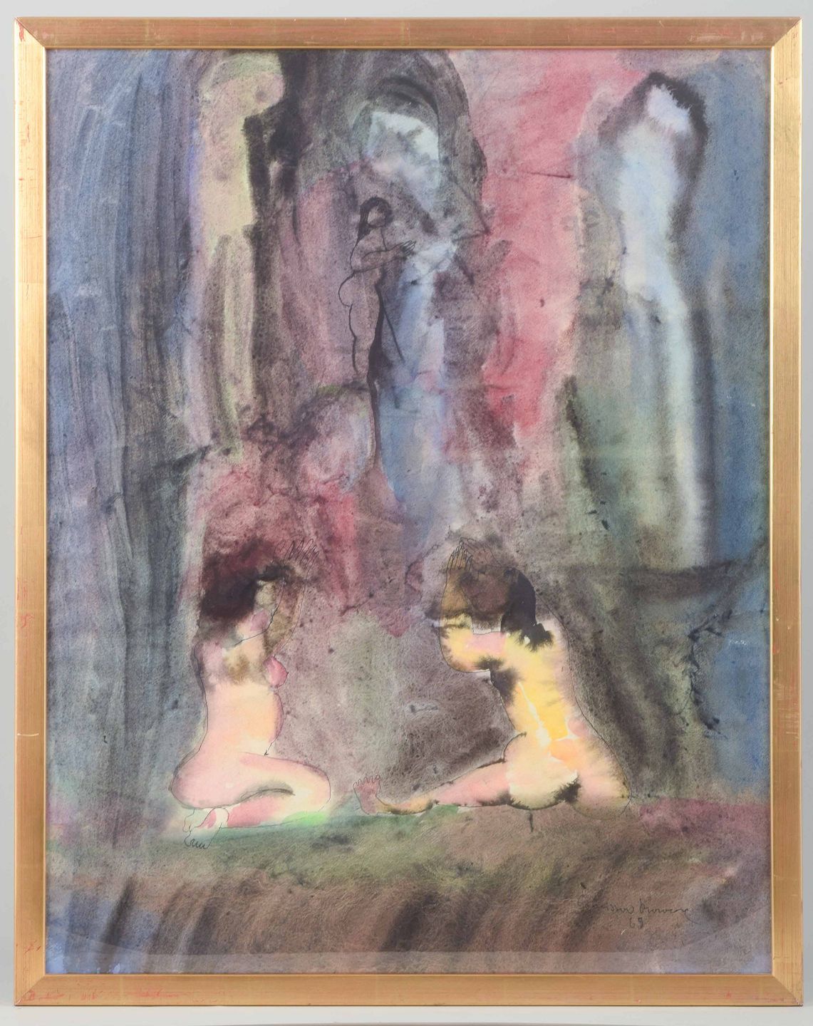 Et ekspressivt værk udført i blandteknik, hvor to nøgne kvinder i siddende stilling – nærmest i en yoga- eller gymnastisk positur – er placeret i forgrunden foran en drømmeagtig, farvemættet baggrund. Arbejdet bærer titlen “Begråtande” og fremstår med en utydelig signatur.