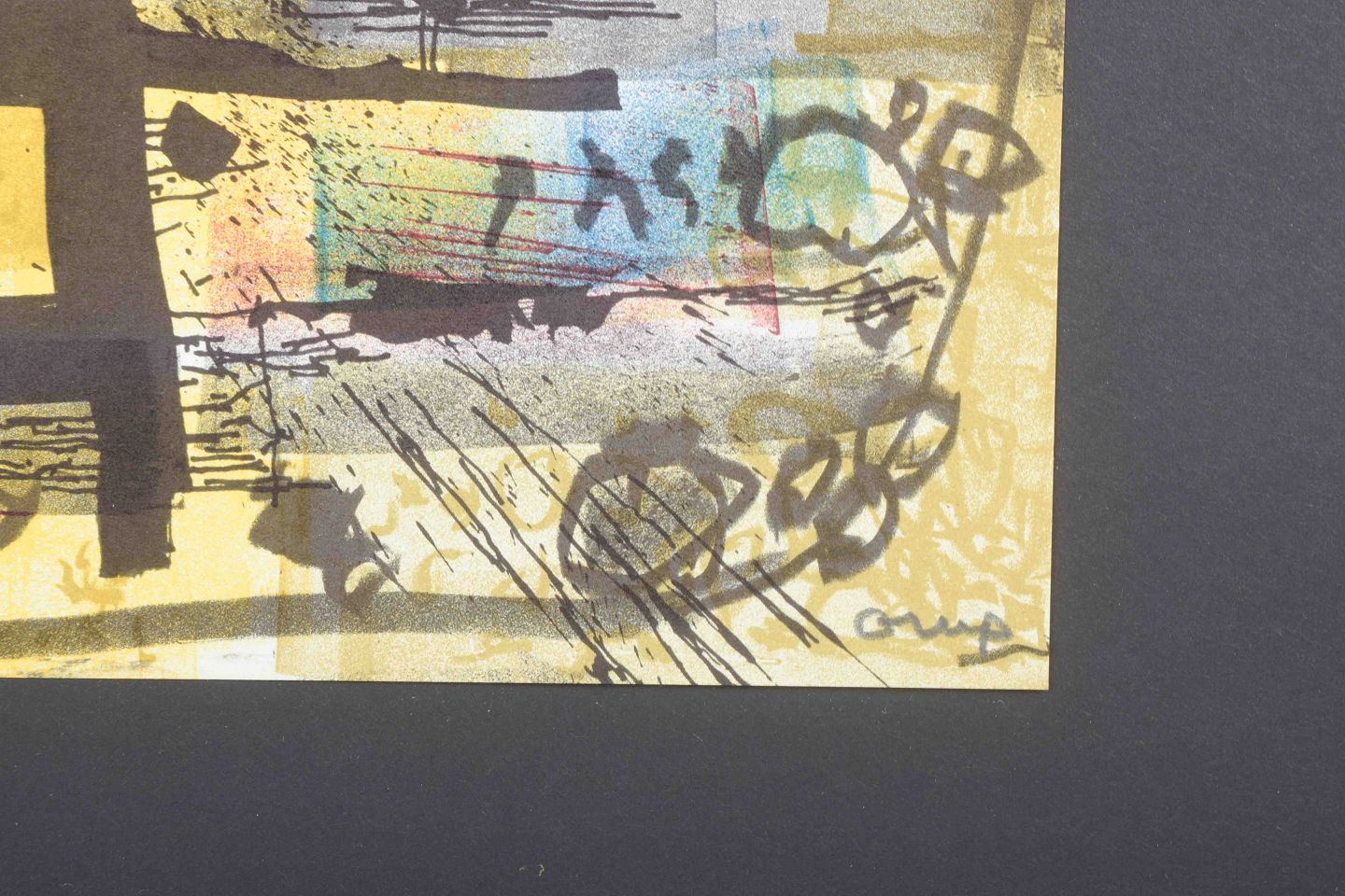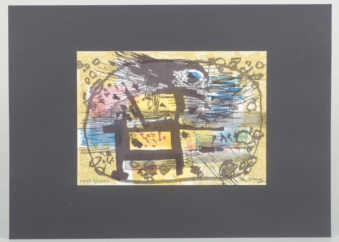 Et karakteristisk abstrakt værk af den svenske kunstner og designer Bengt Orup, kendt for sine modernistiske glasarbejder hos Johansfors Glasbruk samt grafiske kompositioner.