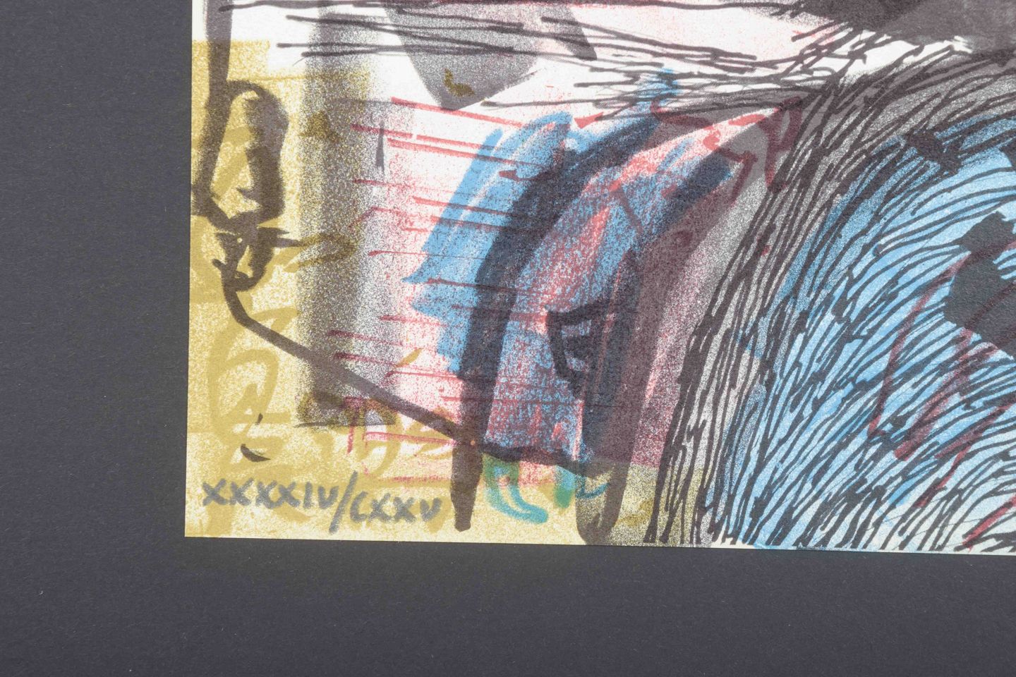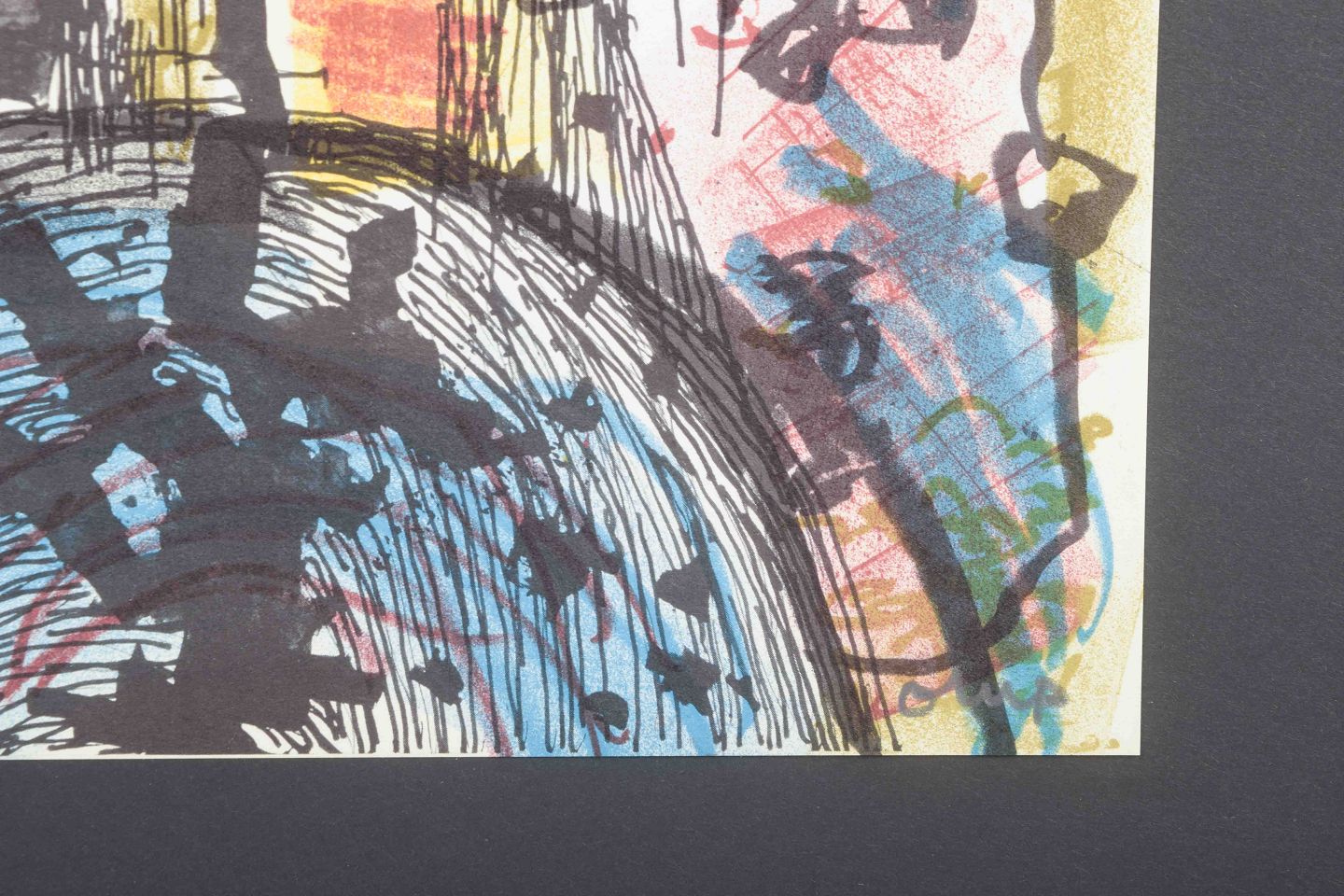 Et karakteristisk abstrakt værk af den svenske kunstner og designer Bengt Orup, kendt for sine modernistiske glasarbejder hos Johansfors Glasbruk samt grafiske kompositioner.