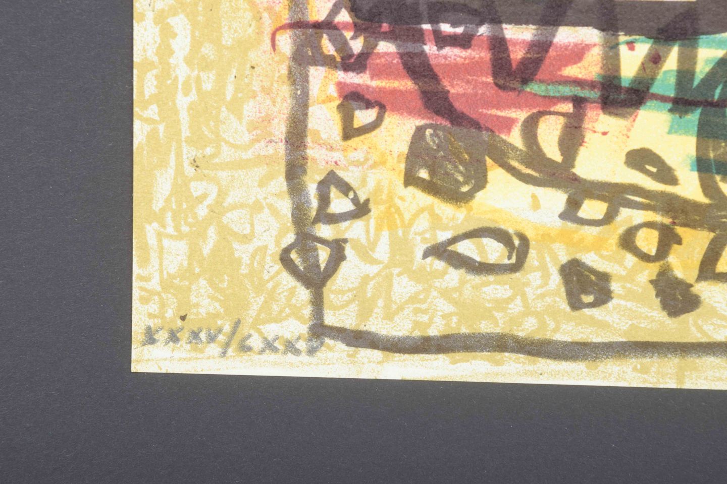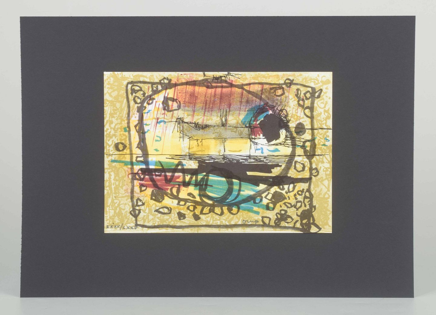 Et karakteristisk abstrakt værk af den svenske kunstner og designer Bengt Orup, kendt for sine modernistiske glasarbejder hos Johansfors Glasbruk samt grafiske kompositioner.