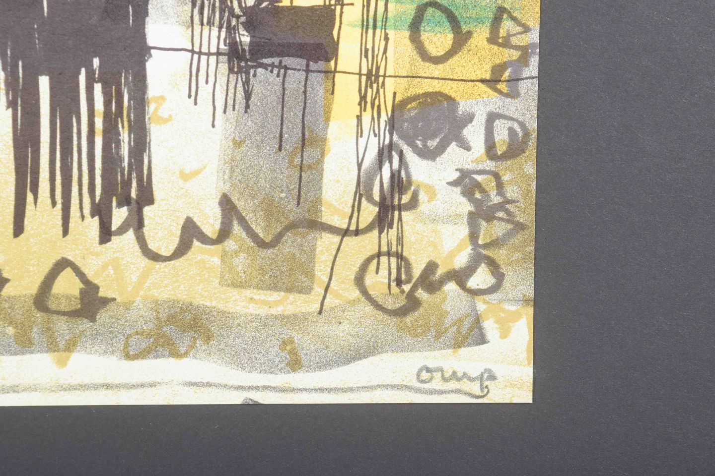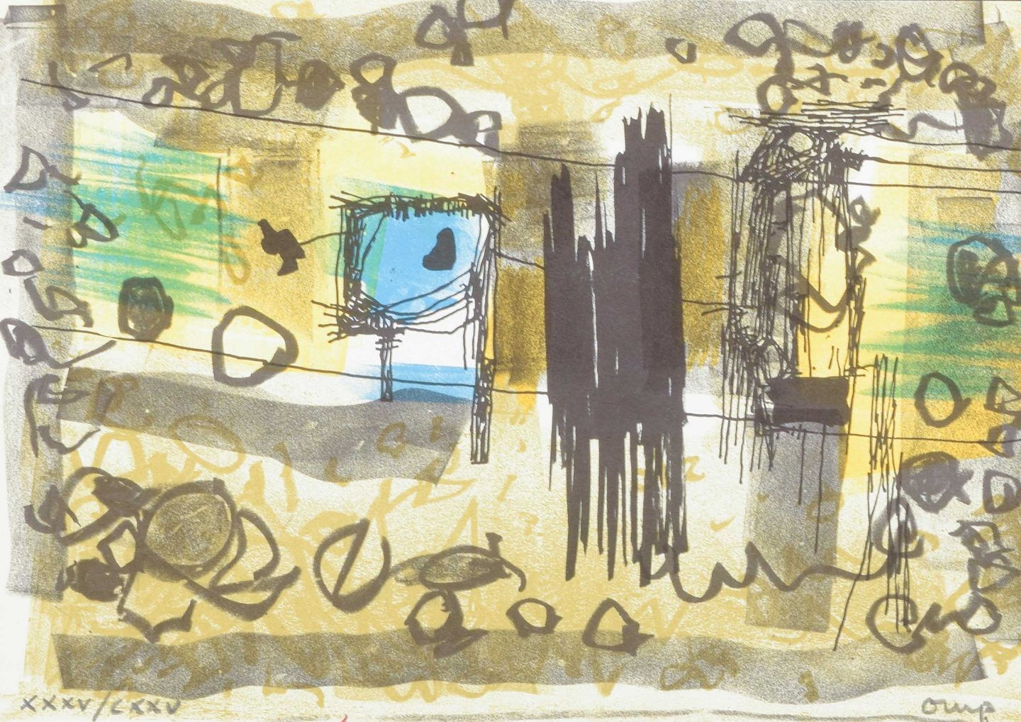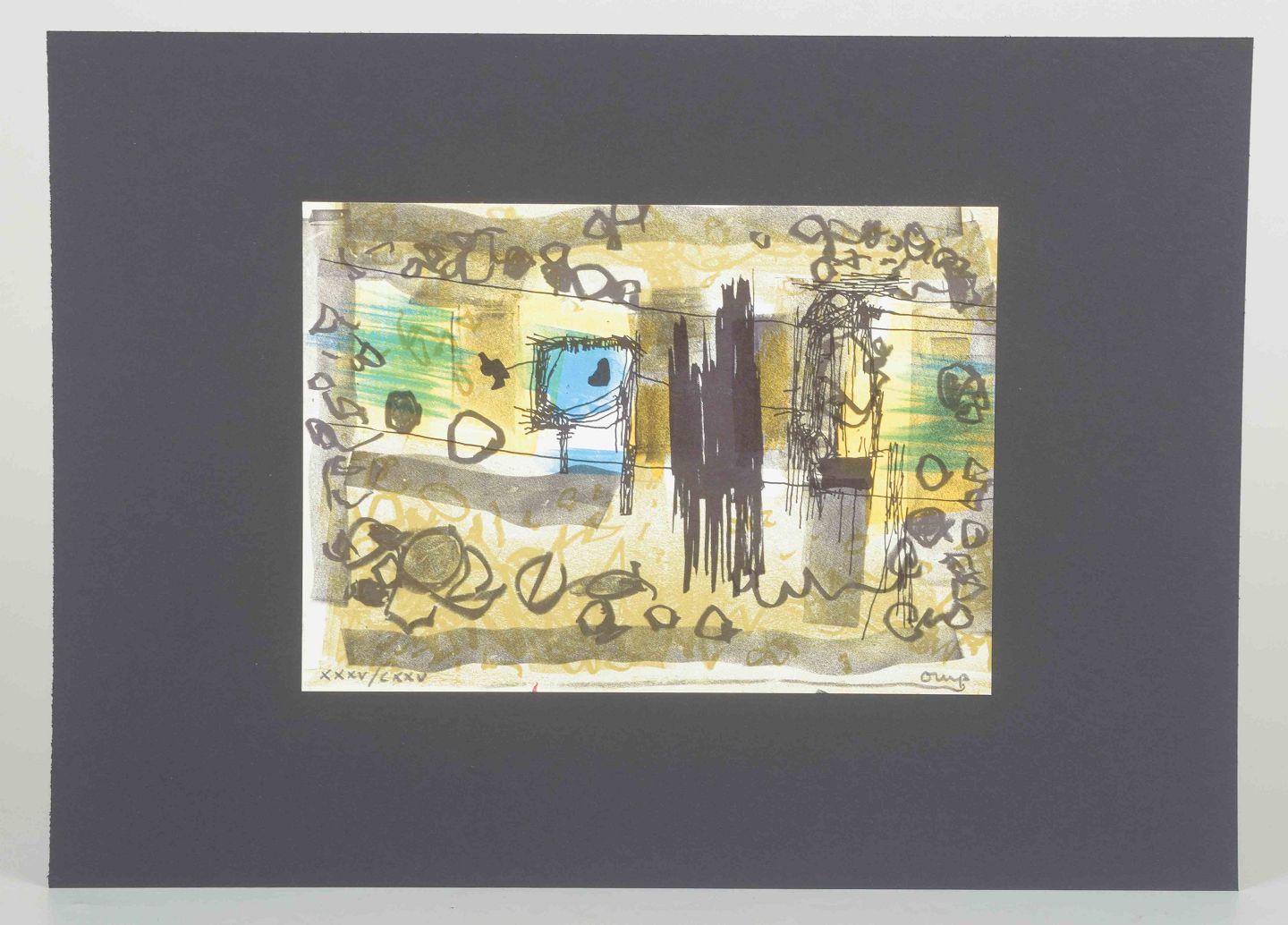 Et karakteristisk abstrakt værk af den svenske kunstner og designer Bengt Orup, kendt for sine modernistiske glasarbejder hos Johansfors Glasbruk samt grafiske kompositioner.