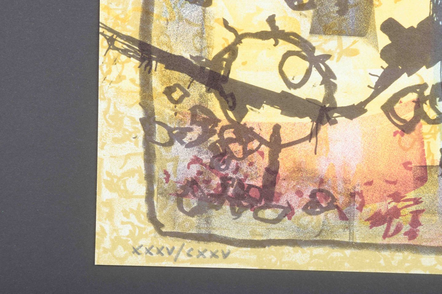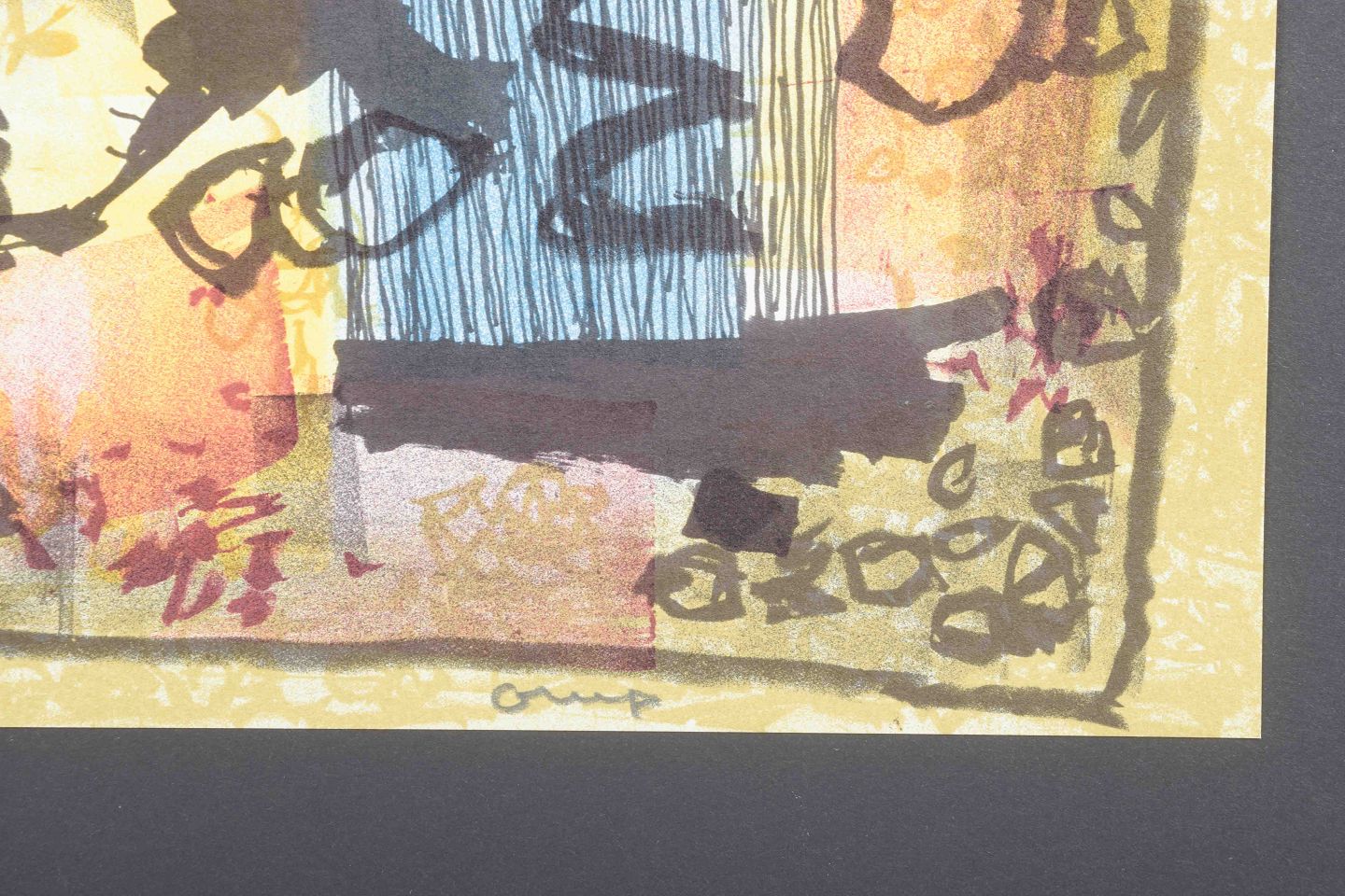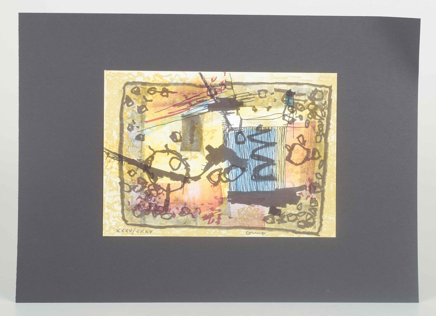 Et karakteristisk abstrakt værk af den svenske kunstner og designer Bengt Orup, kendt for sine modernistiske glasarbejder hos Johansfors Glasbruk samt grafiske kompositioner.