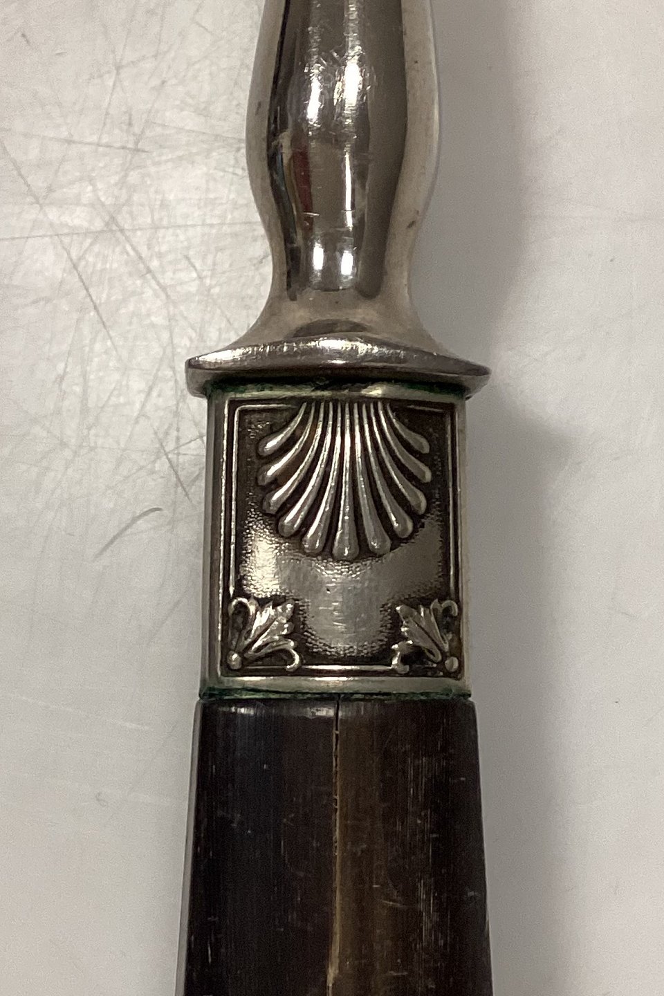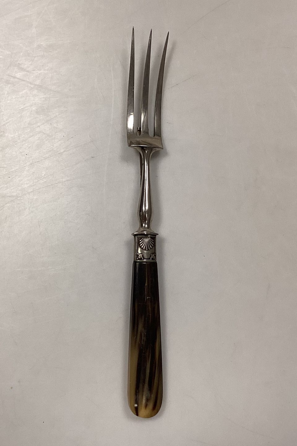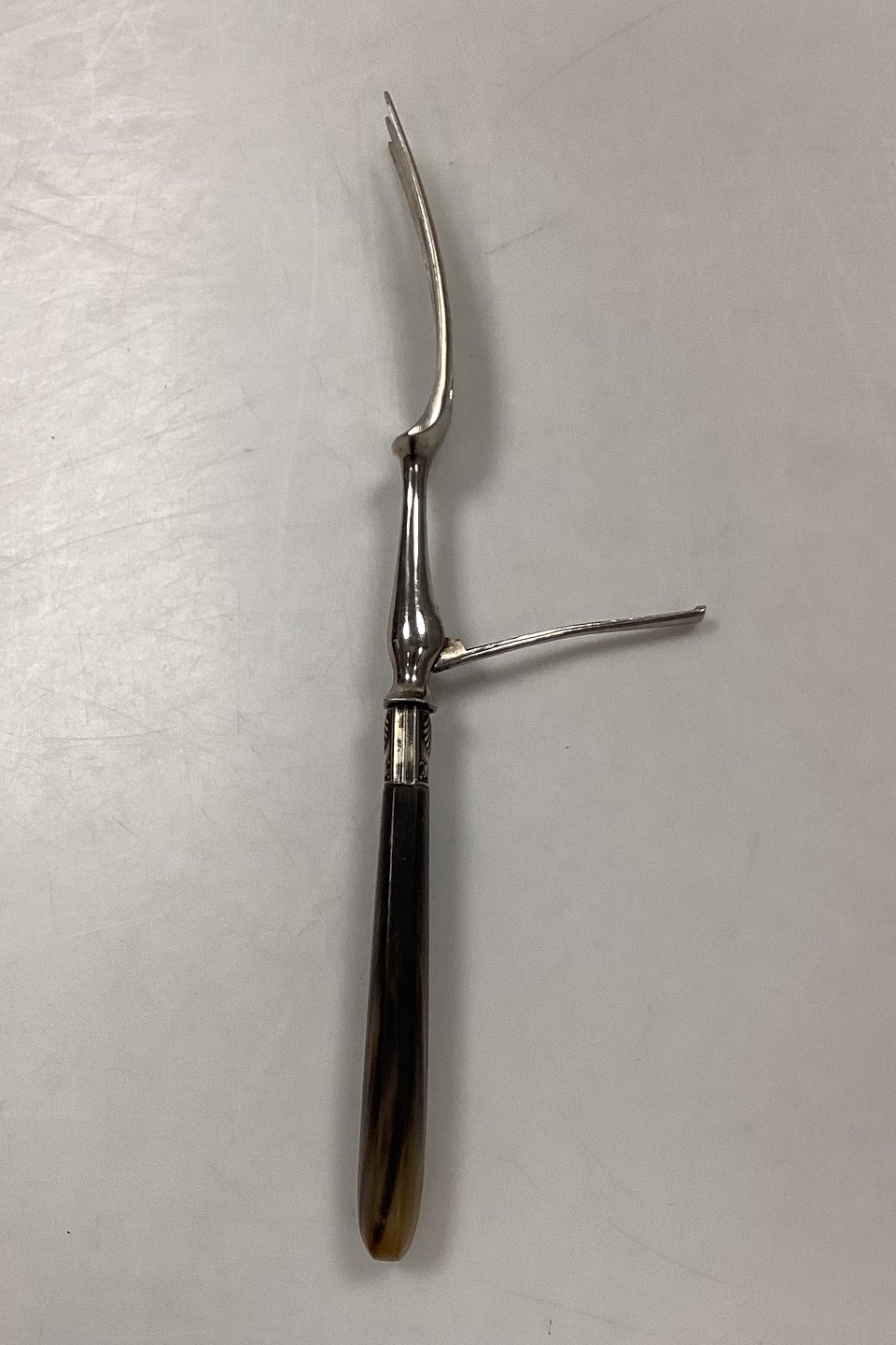 Tilquin-Anvers Rustfri Kødgaffel med lyst/brunt bakelit/plasthåndtag og muslinge motiv.Har en foldbar attrap på bagsiden. I god stand.