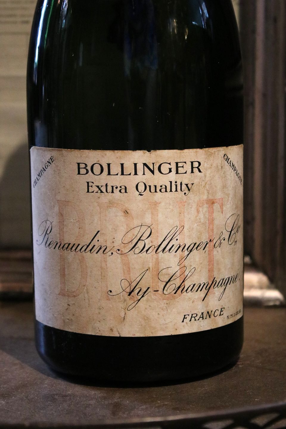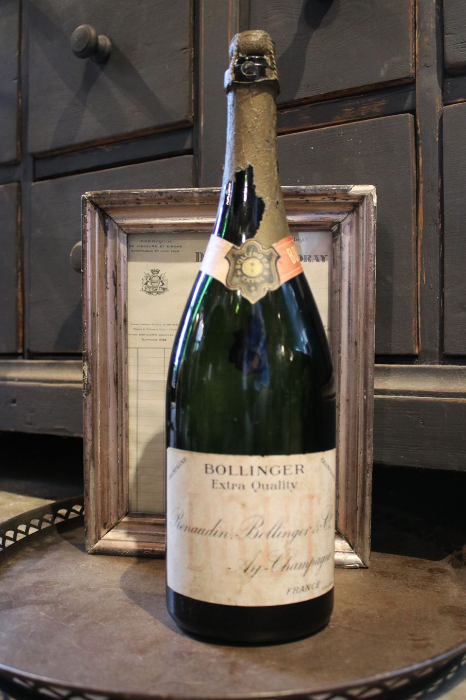 Dekorativ , gammel fransk reklame Bollinger champagneflaske med en rigtig fin patina...