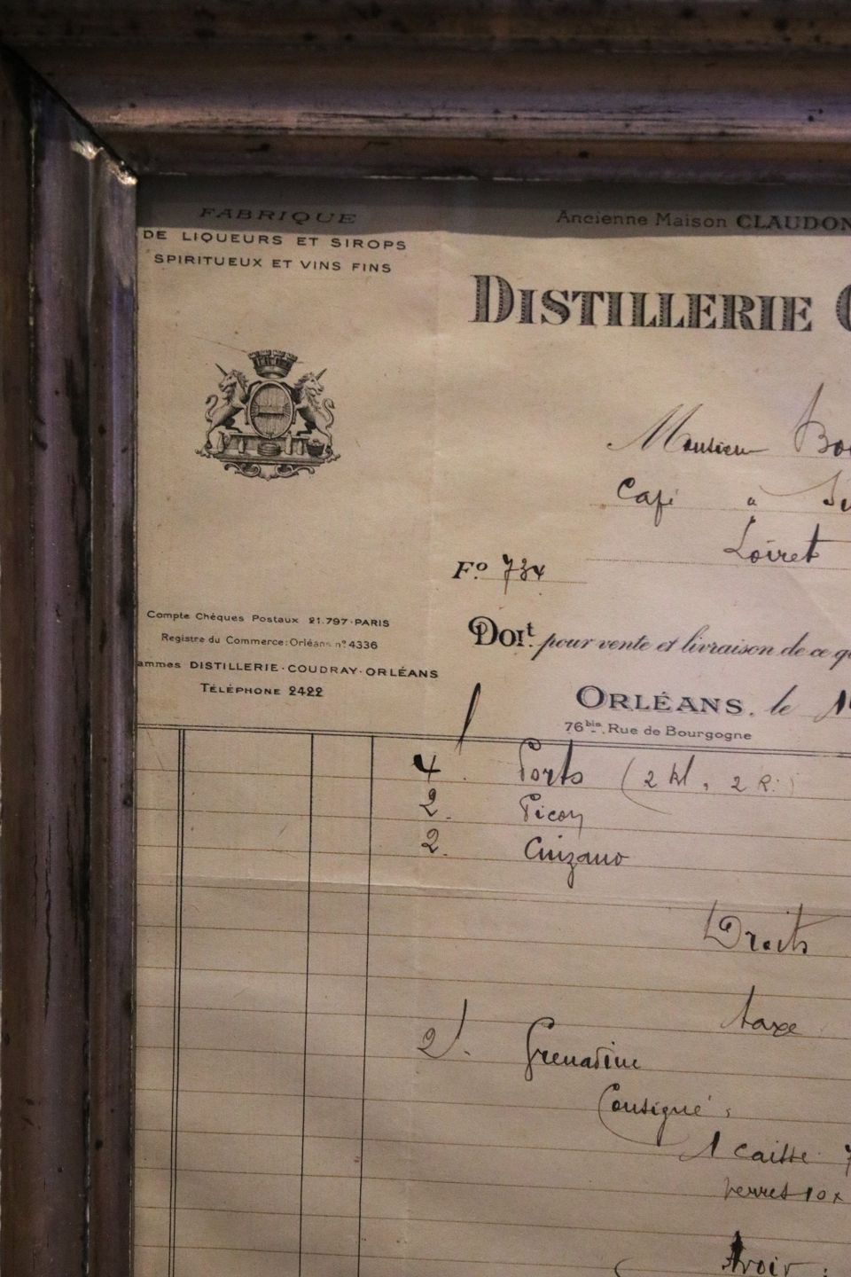 Gammel fransk håndskrevet spiritus regning indrammet i gammel sølvramme med patina.
