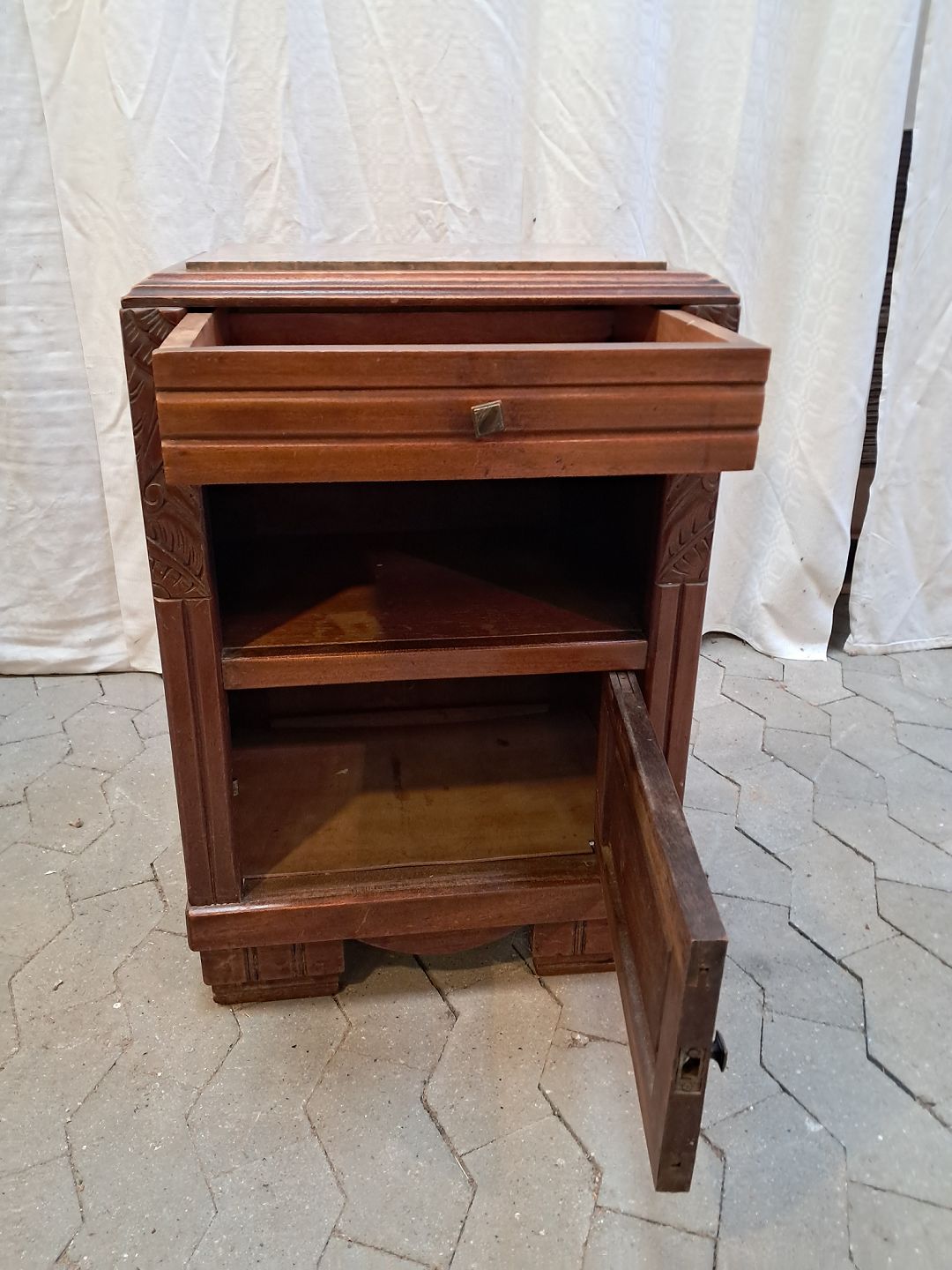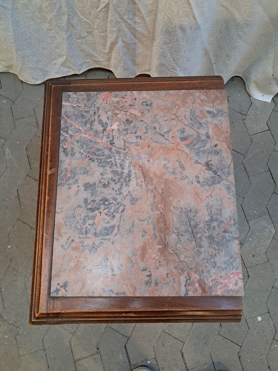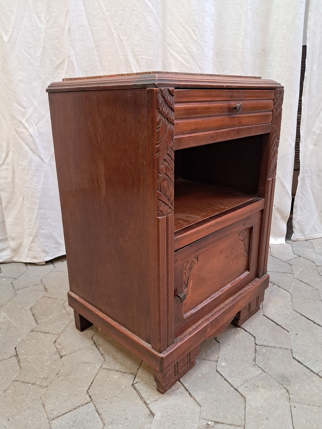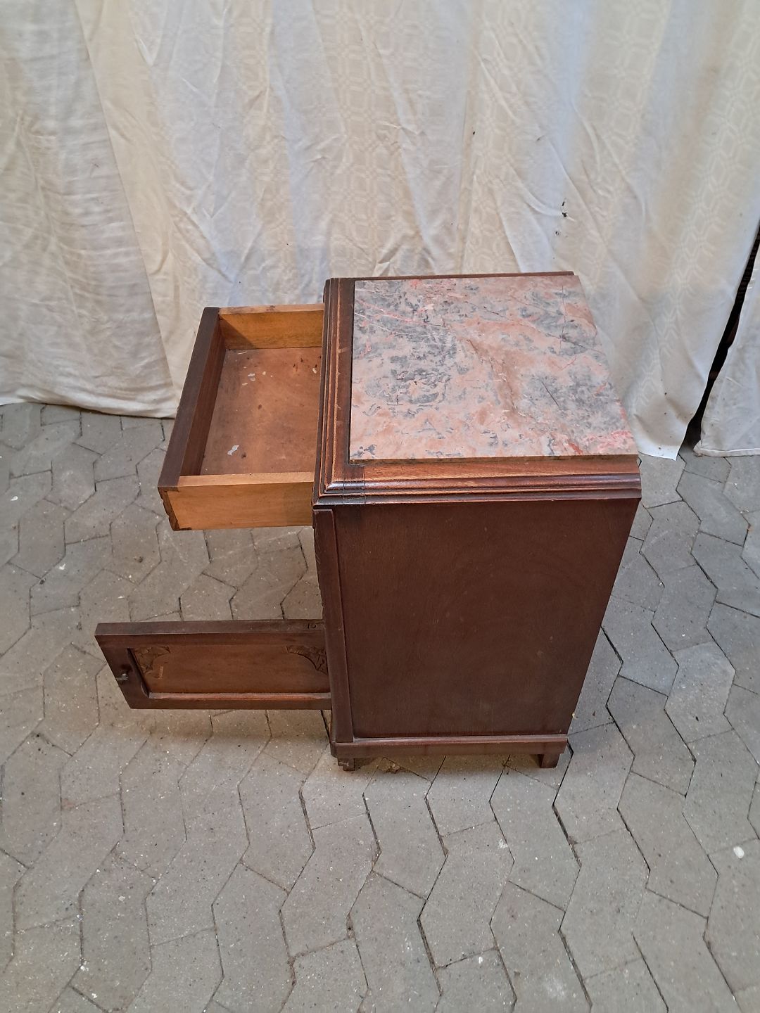 Lille skab i mahogni med marmorplade, fra 1910erne.