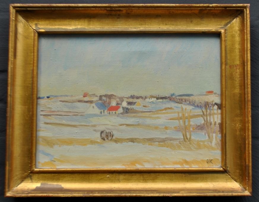 Kielberg, Ole (1911 - 1985) Danmark: Vinter landskab, 1954. Olie på lærred. Signeret: OK og bagpå: Ole Kielberg 1954 Daugløkke. H: 31 cm. B: 41 cm.