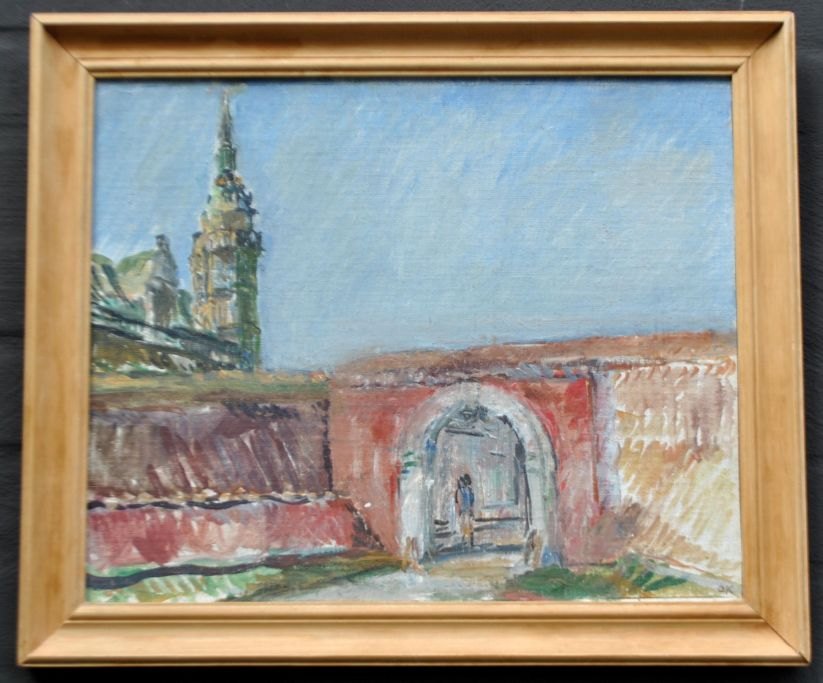 Kielberg, Ole (1911 - 1985) Denmark: Red gate. Kronborg, 1966-68. Oil on masonite. Signed: OK and on the back: Ole Kielberg. Kronborg. 1966-68. H: 35 cm. W: 42.5 cm.