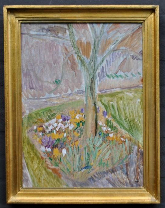 Kielberg, Ole (1911 - 1985) Denmark: Crocusbed, 1954-60. Oil on masonite. Signed: OK and on the back: Ole Kielberg Daugløkke 1954-60. H: 48 cm. W: 36 cm.