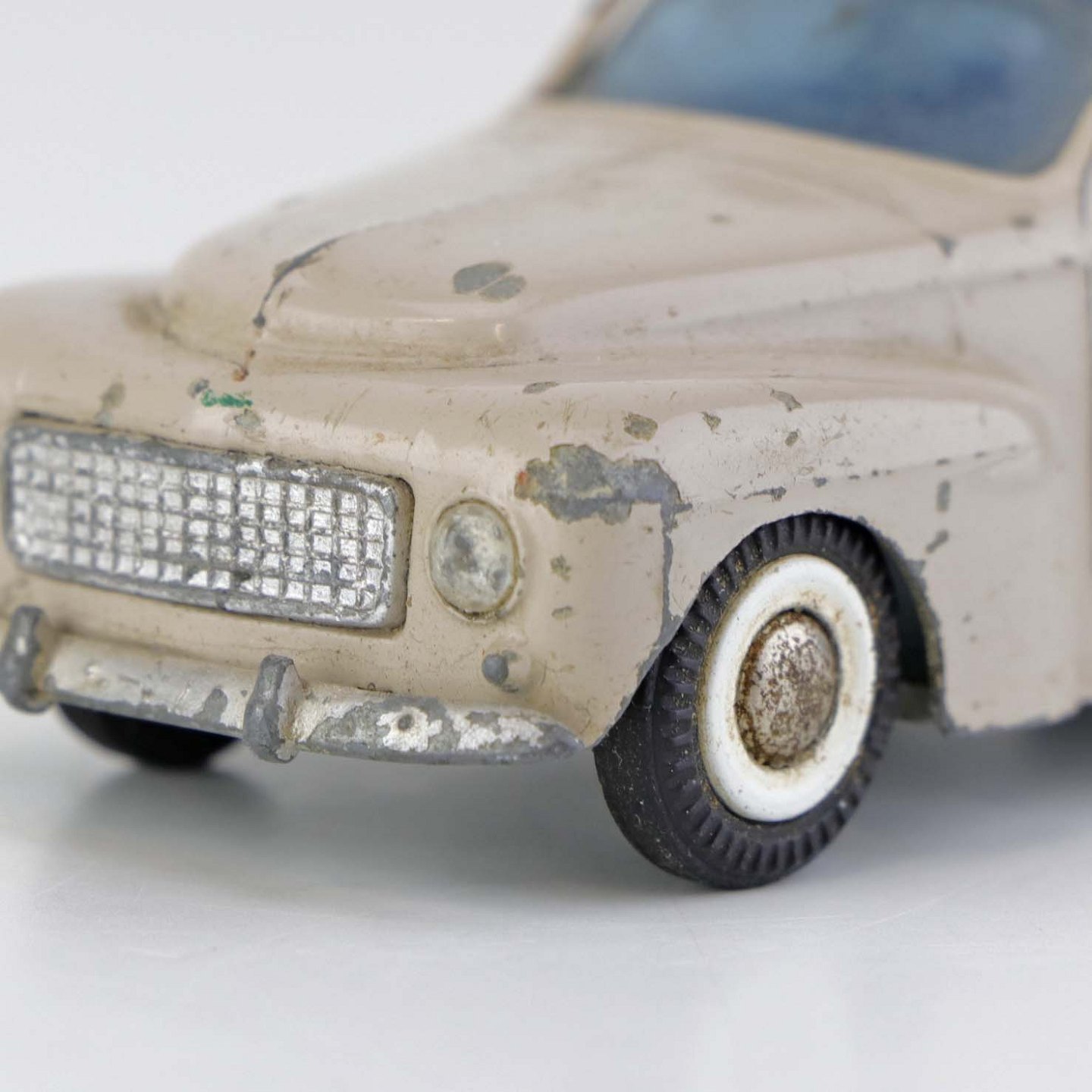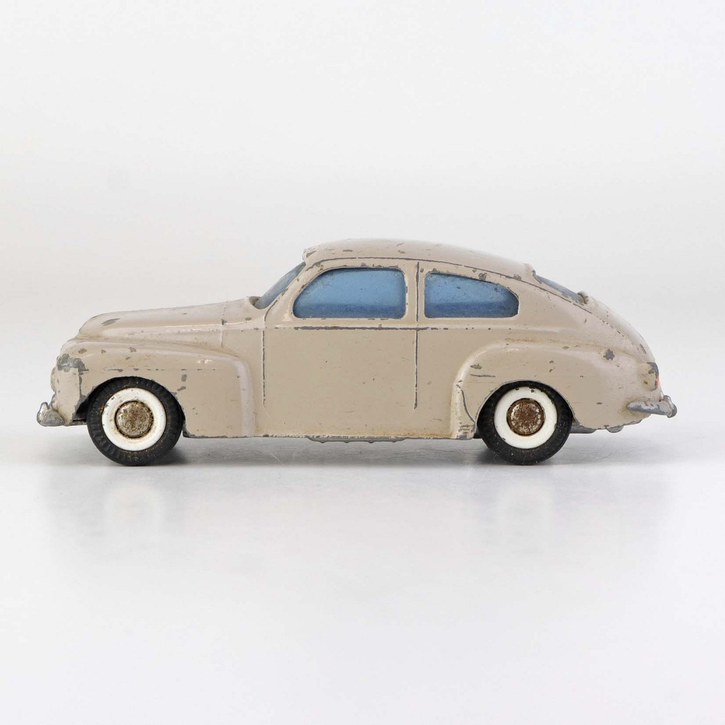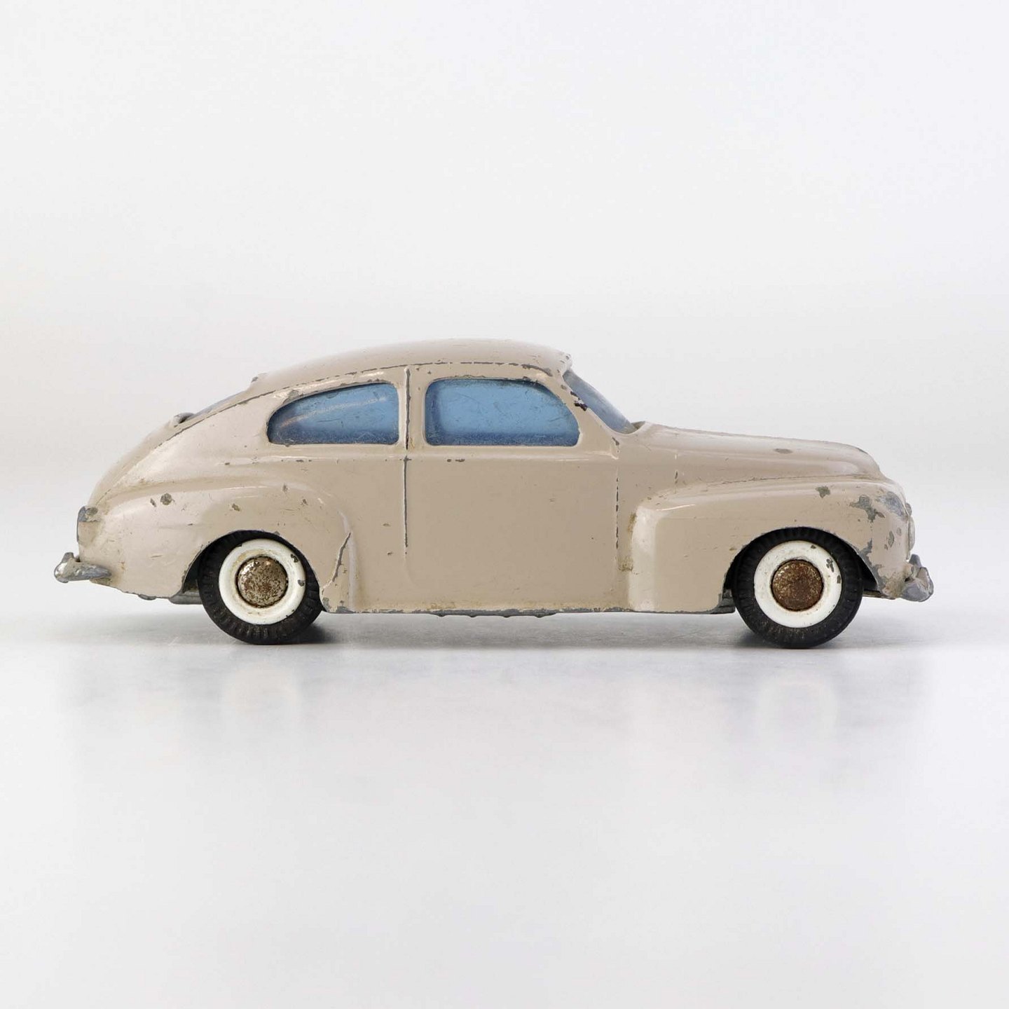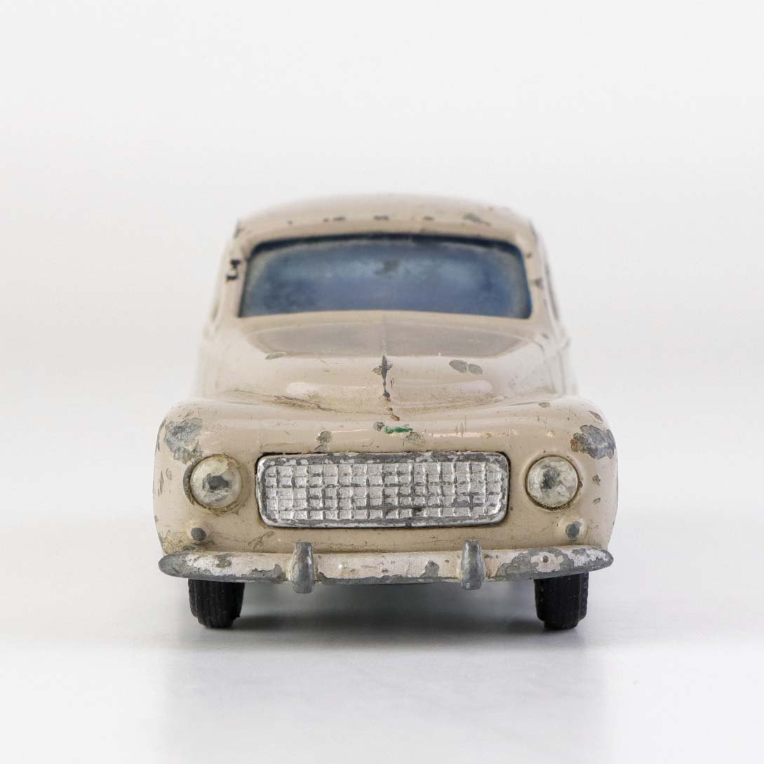 Beigefarvet Volvo PV 544 legetøjsbil i lakeret metal med gummi hjul. Nr. 822