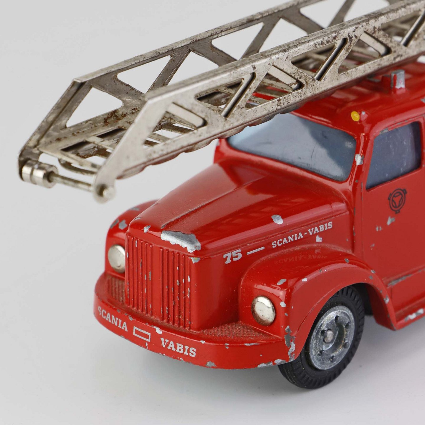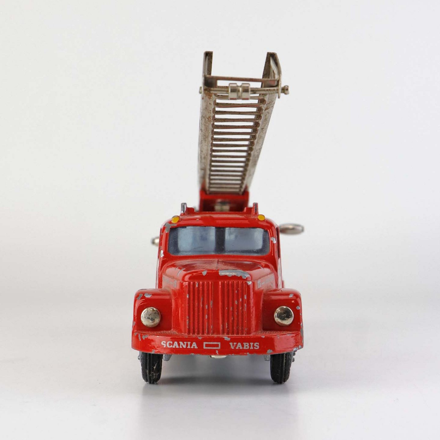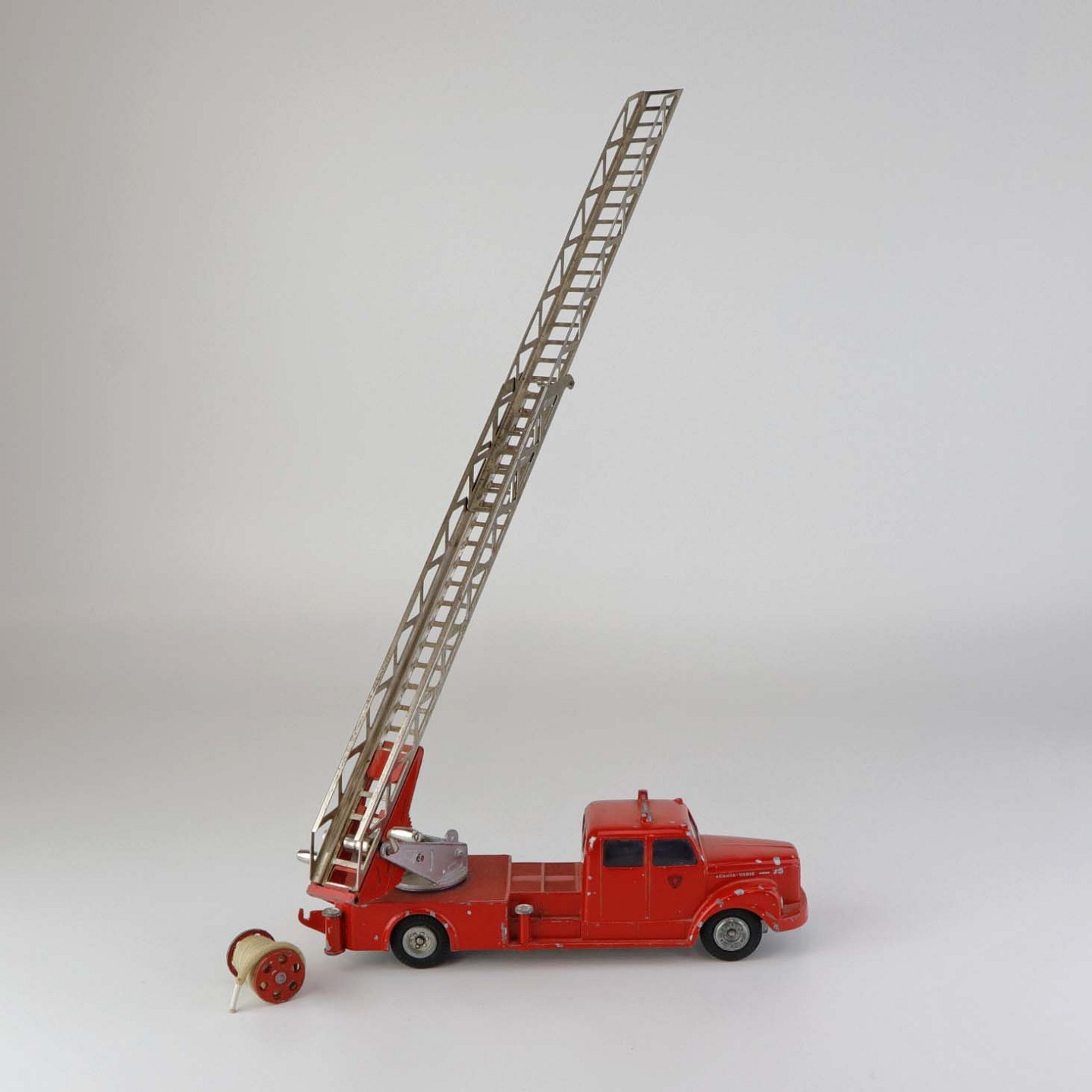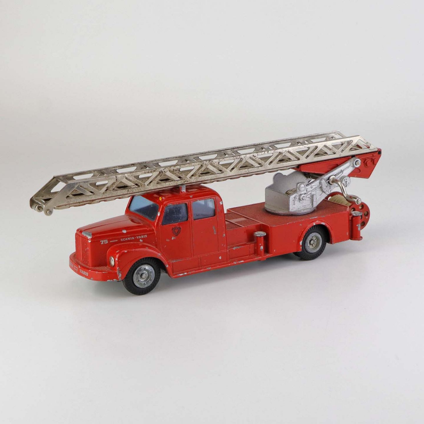 Legetøjsbil. Scania vabis brandbil stigevogn i rødlakeret metal med gummi hjul og drejbar stige med ekstra udtrækstige samt aftagelig oprullet brandslange.