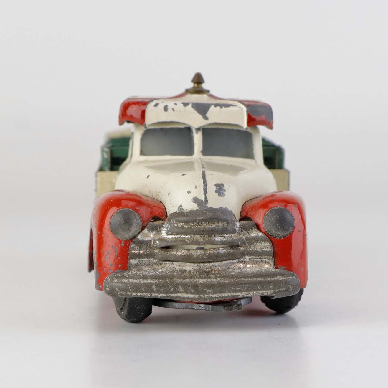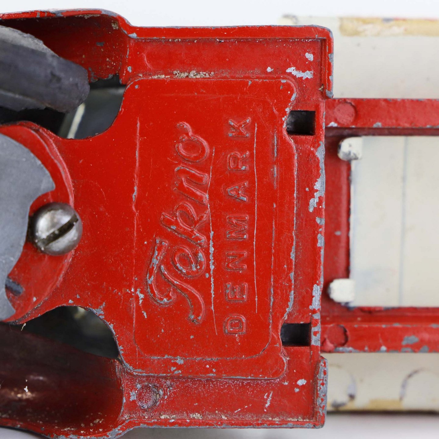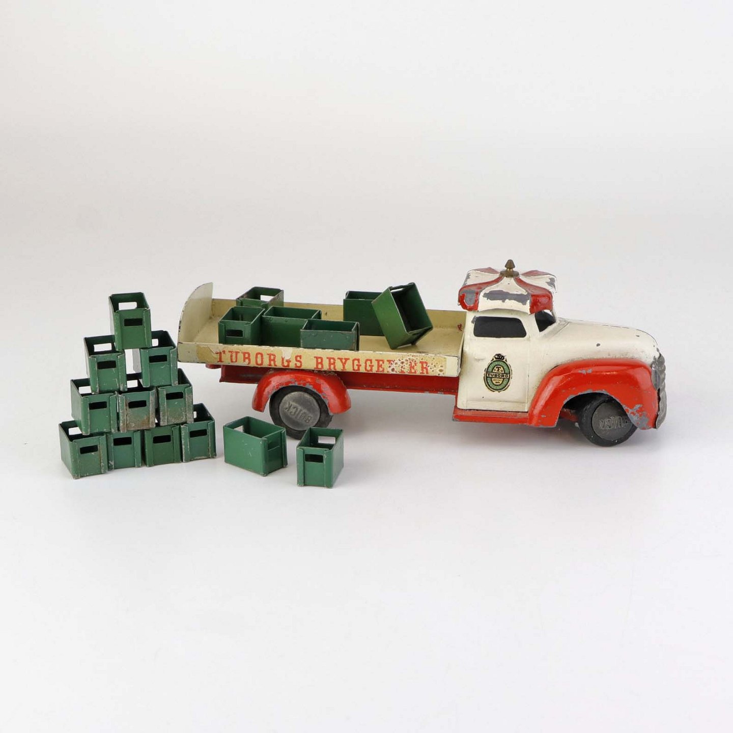 Legetøjsbil Tuborg ølbil med teksten Tuborg bryggerier samt 18 løse ølkasser i grøn metal. Bilen er i hvidlakeret metal med gummi hjul.