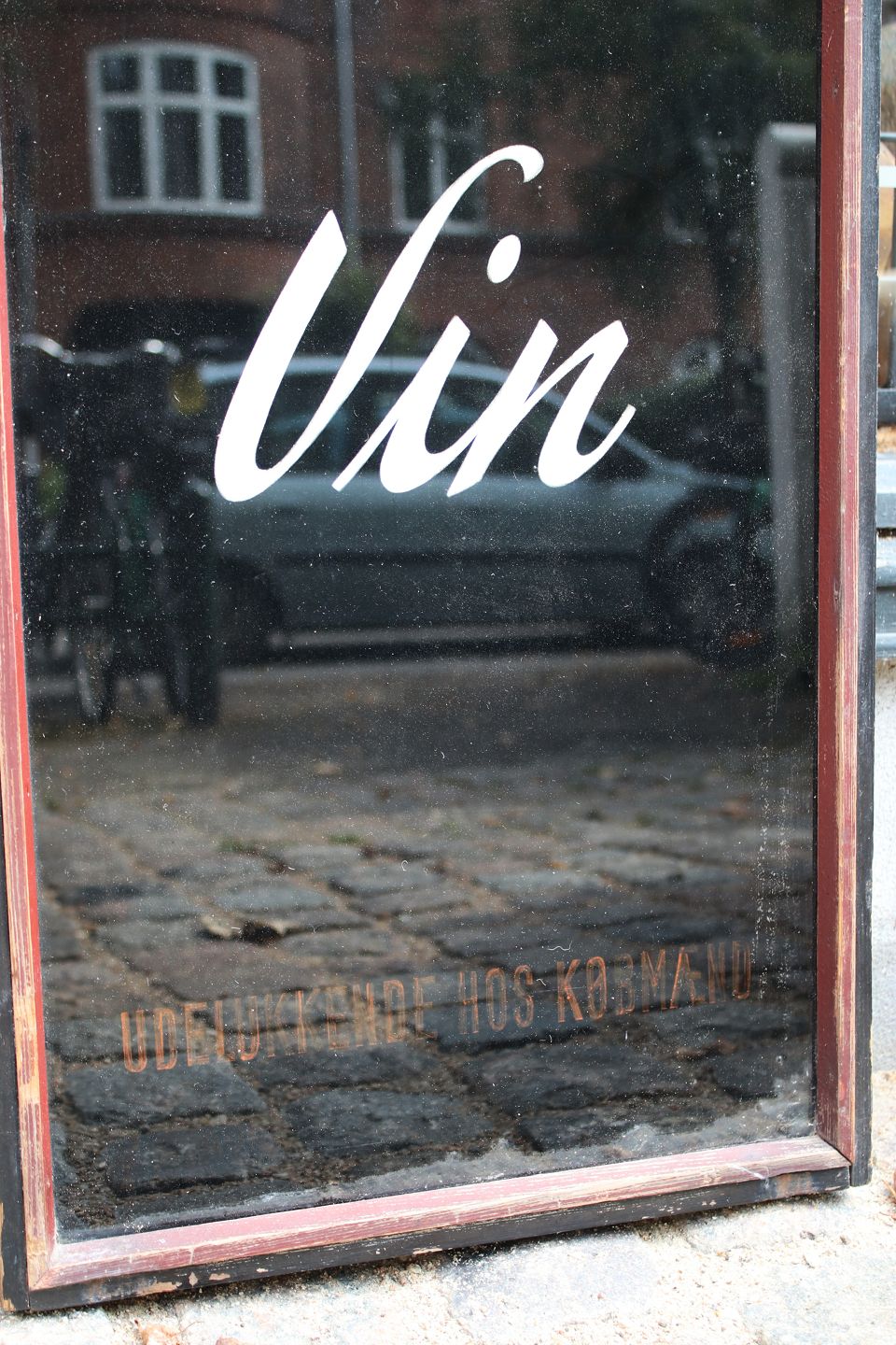 Dekorativt , gammelt reklameskilt (Teilmann vin) malet på glas ,