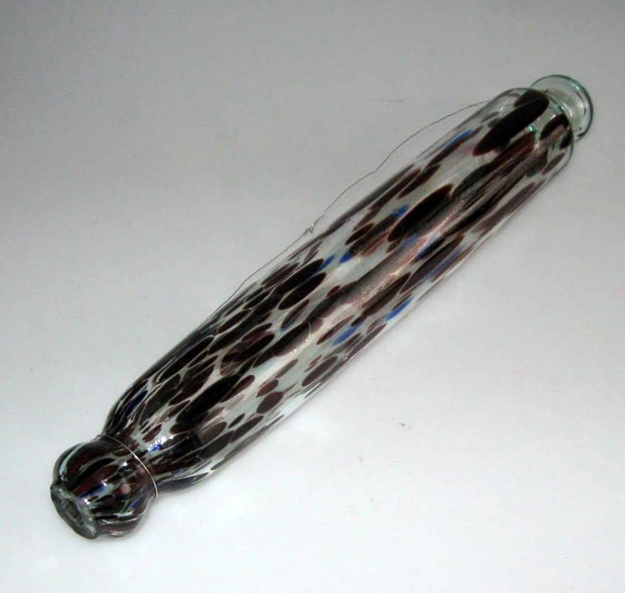 Engelsk kagerulle i farvet glas, 19. årh. Grønlig glasmasse med rød og blåt. L.: 40 cm.