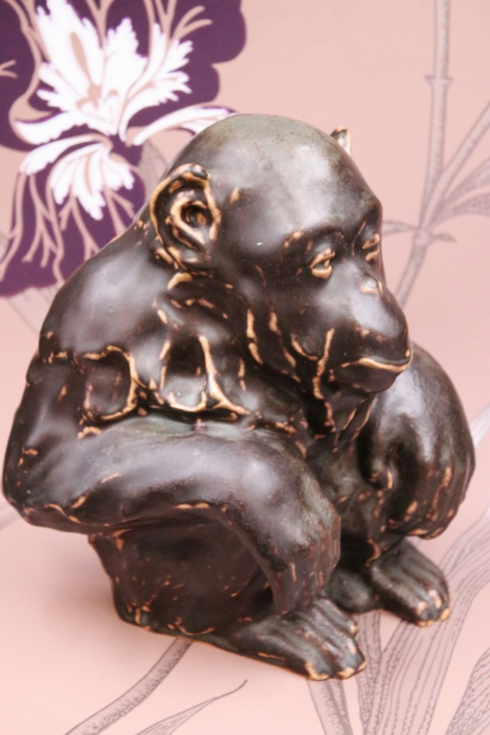 Bing & Grøndahl stentøjs figur af abe i sung glasur , design af Jean Rene Gauguin. H: 21,5cm. B: 20cm. D: 16cm.