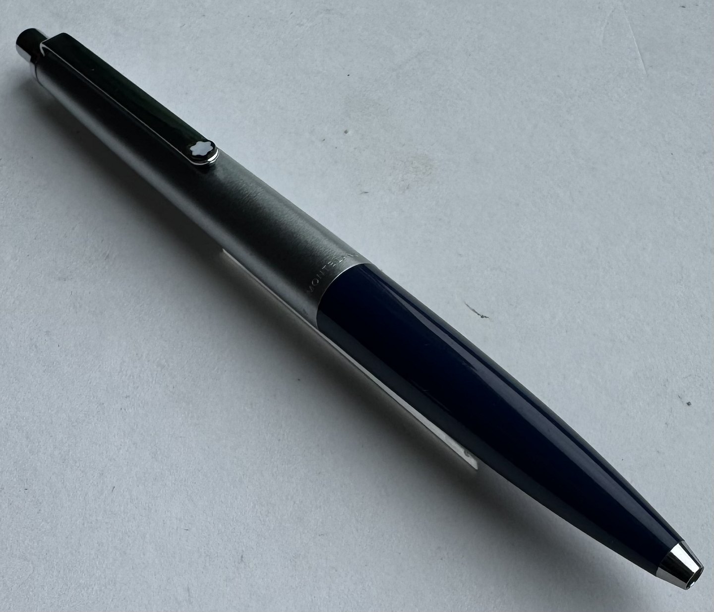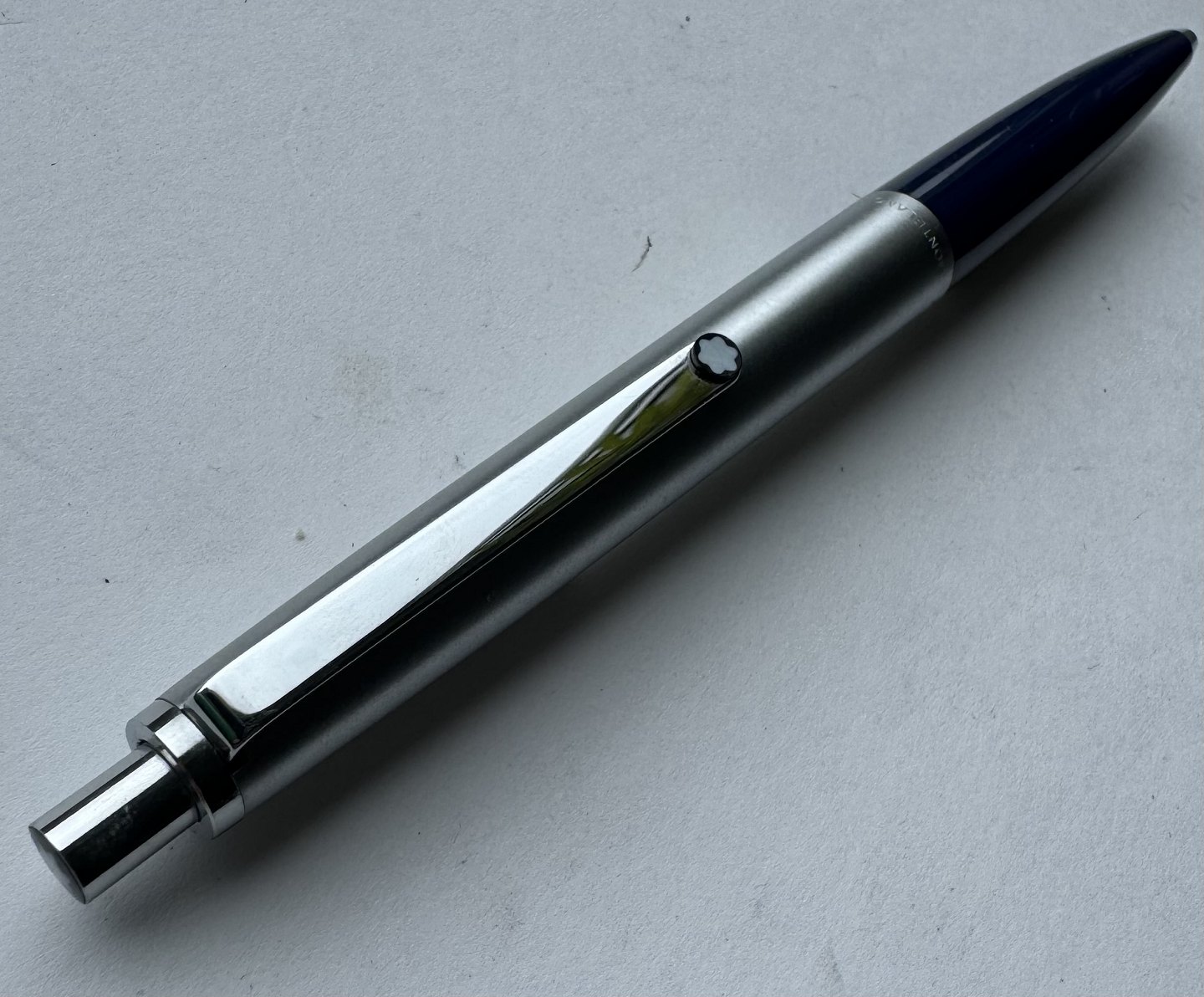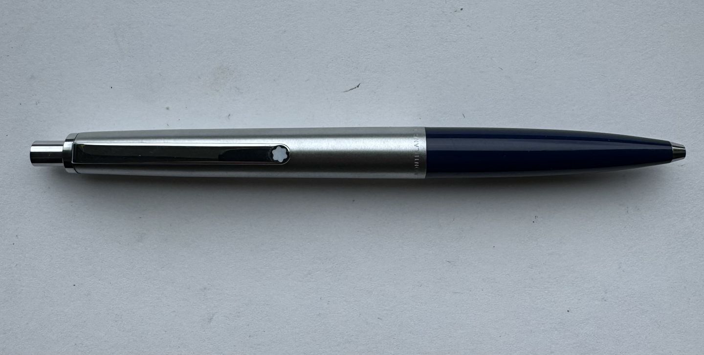 Montblanc Traveller 5201 kuglepen. Blå nederst med øverste del i børstet stål design. Fremstår i perfekt stand. Klar til brug ! Fungerer med original Montblanc refil.