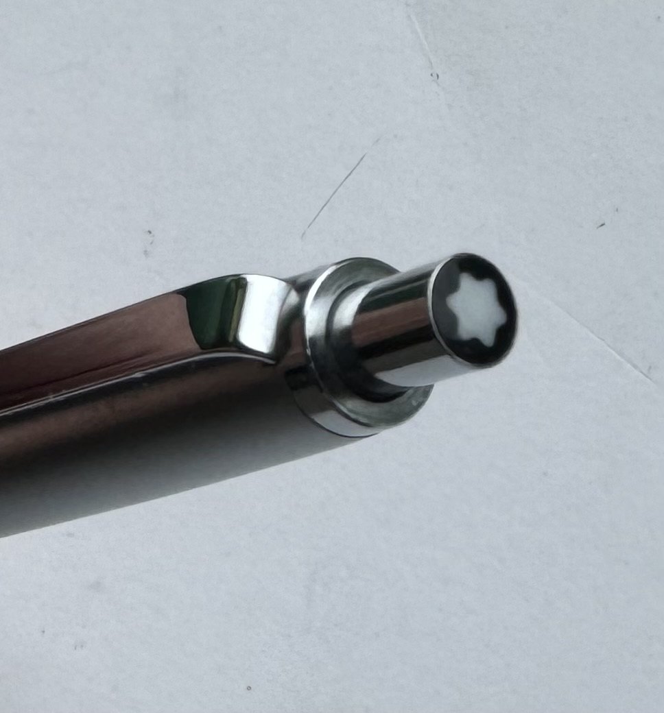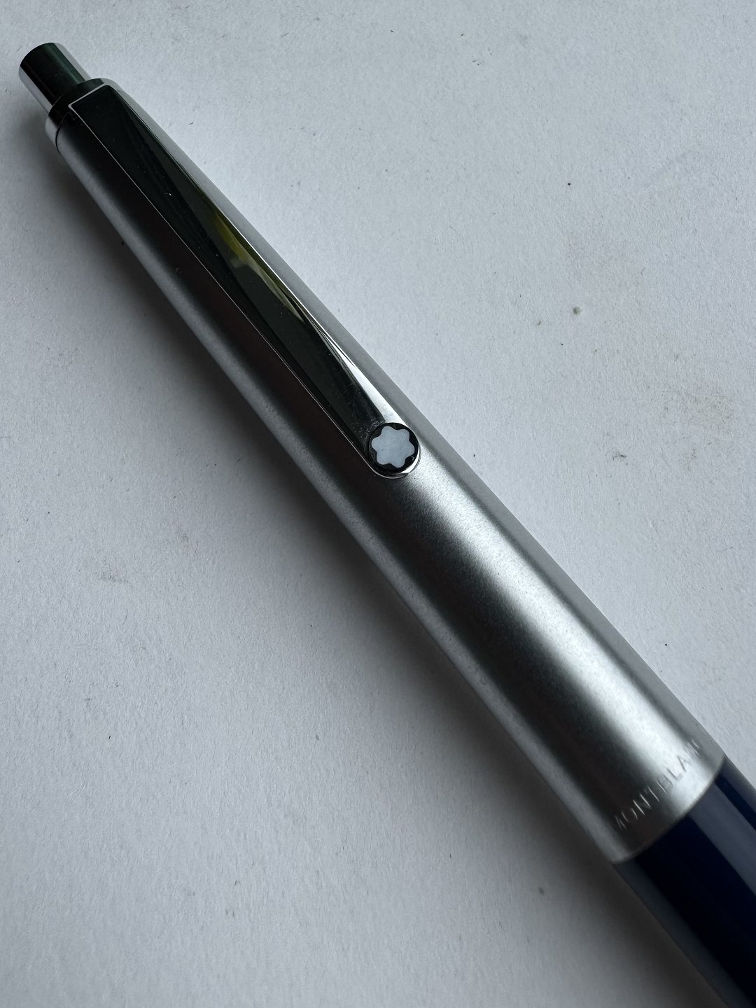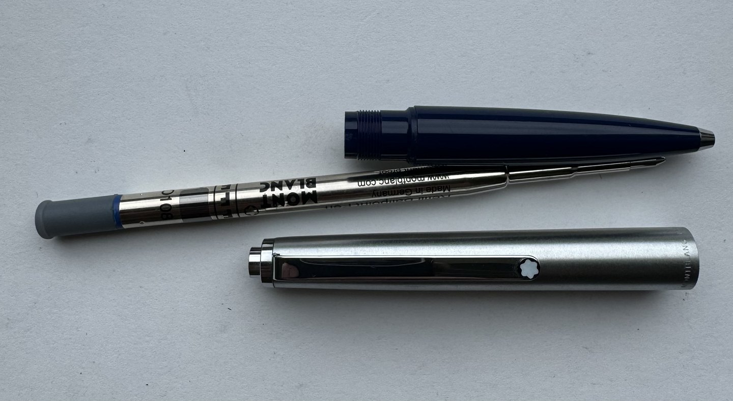 Montblanc Traveller 5201 kuglepen. Blå nederst med øverste del i børstet stål design. Fremstår i perfekt stand. Klar til brug ! Fungerer med original Montblanc refil.