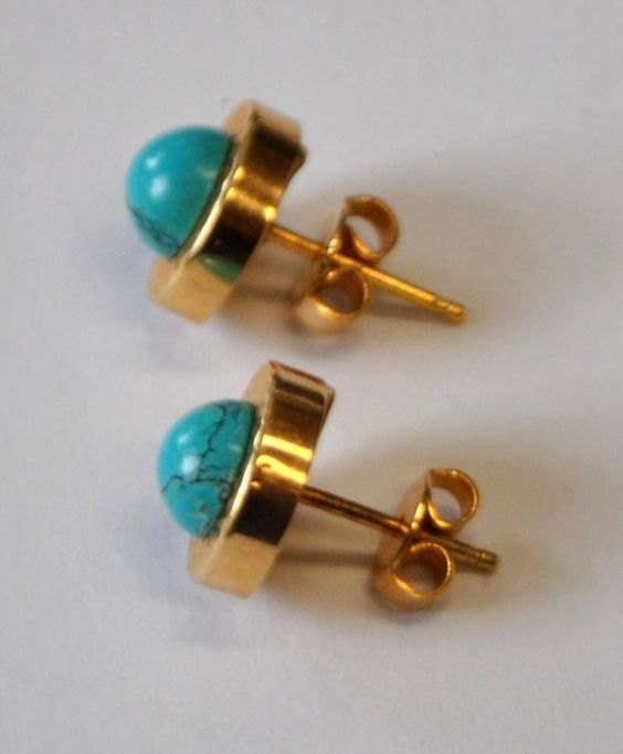 Pair of 18 karat red gold ear sticks with turquoises, 20th century.