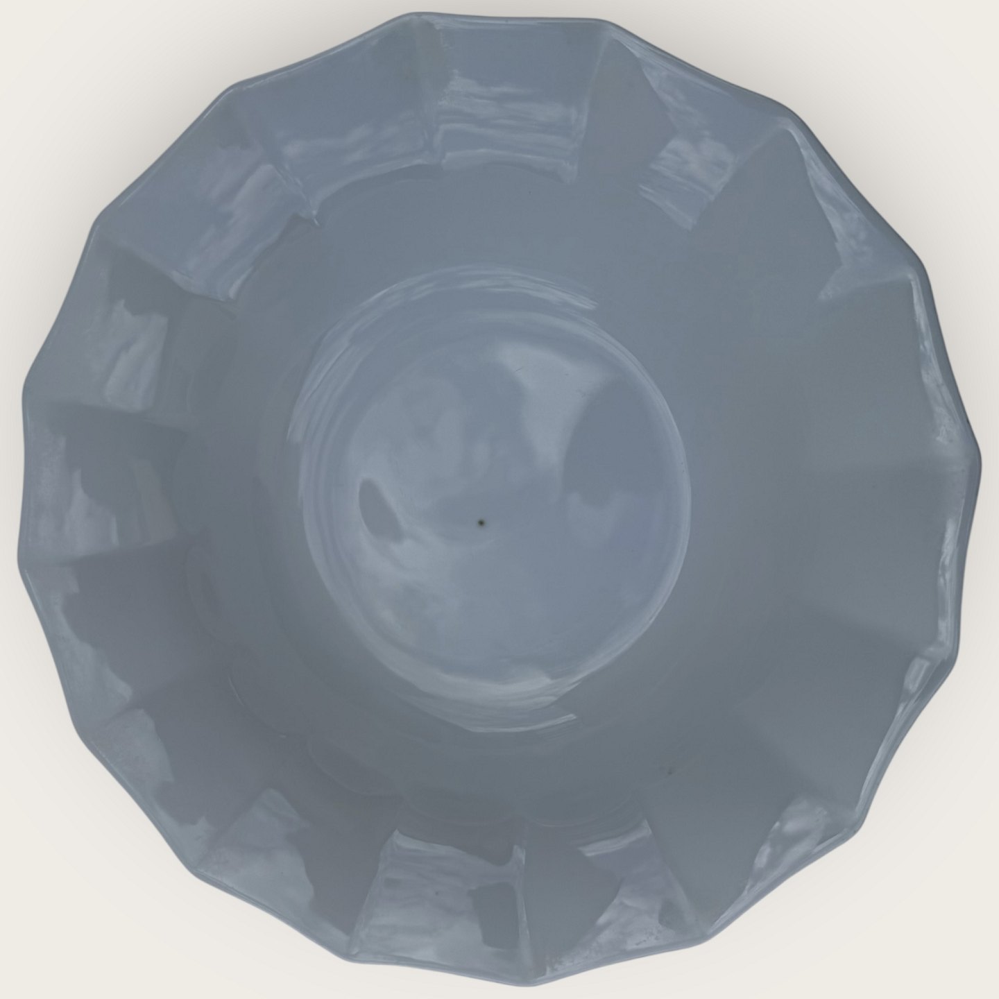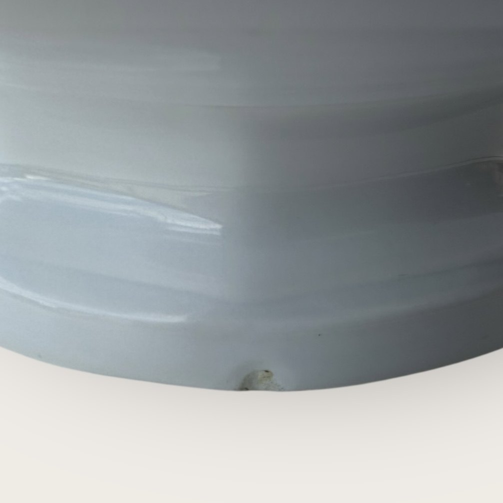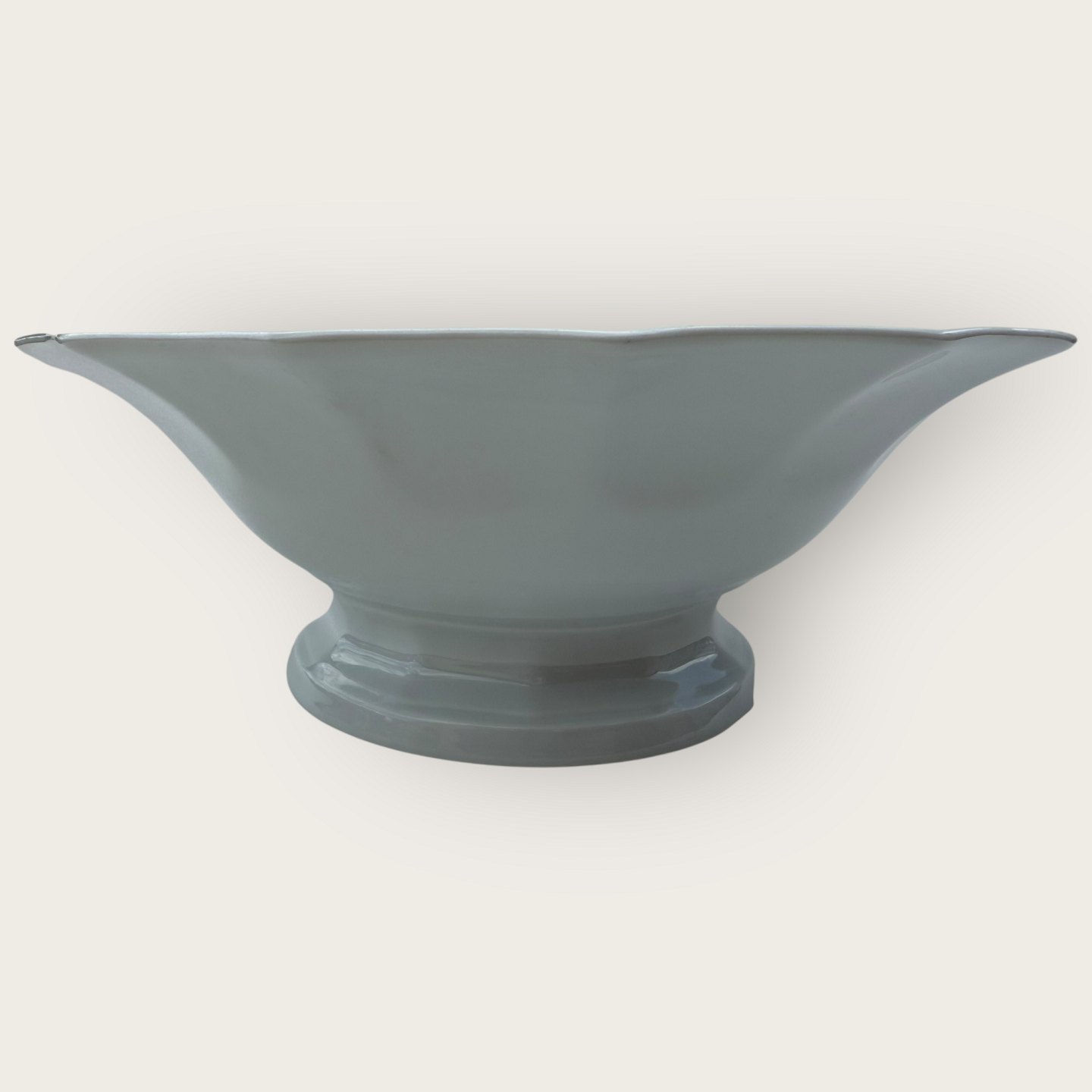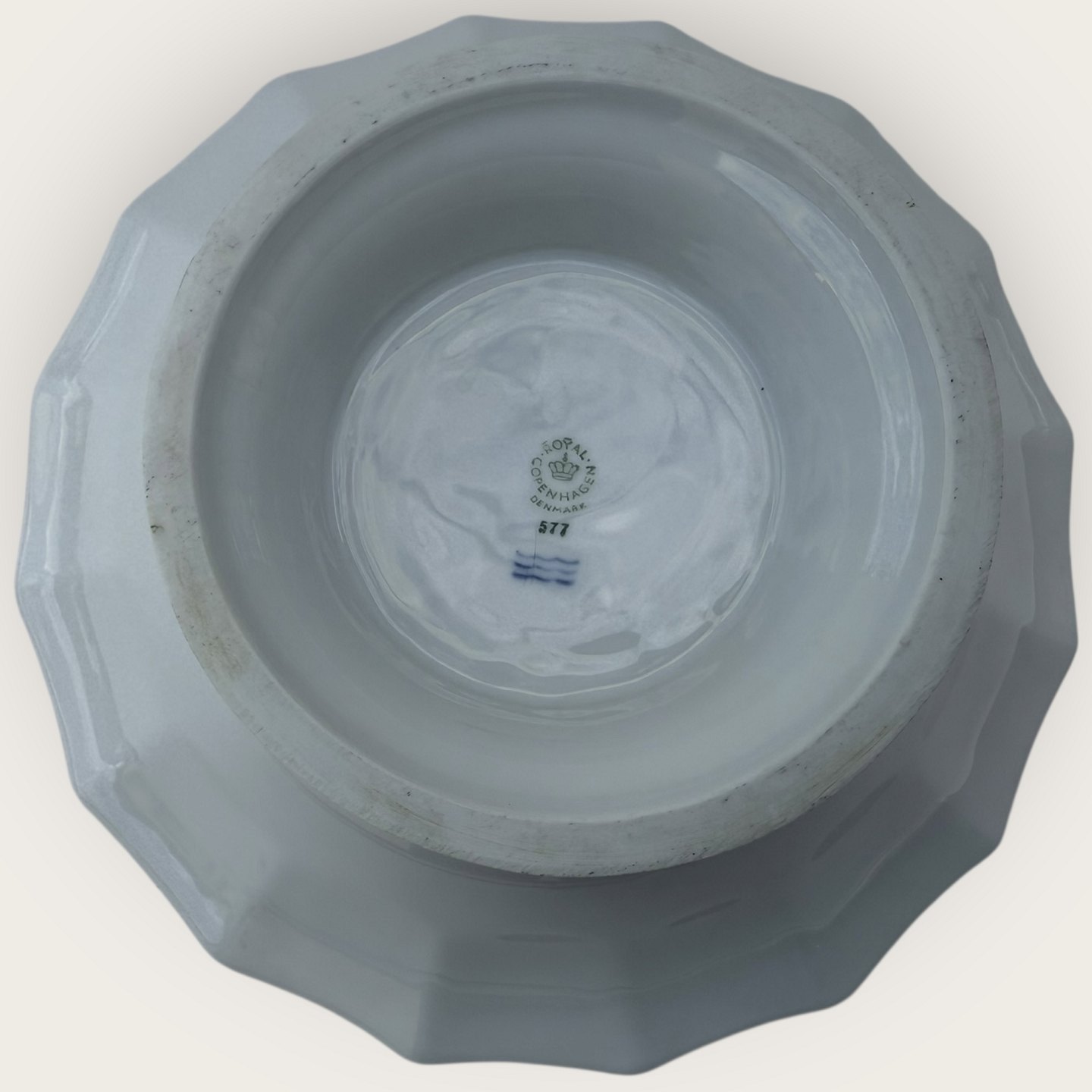 Royal Copenhagen, Hvid kantet / White edged without decoration, Round bowl on foot #577, 23.5cm in diameter, height 9cm, 3rd grade, A stain on the bottom and a small flaw on the foot (see photo).