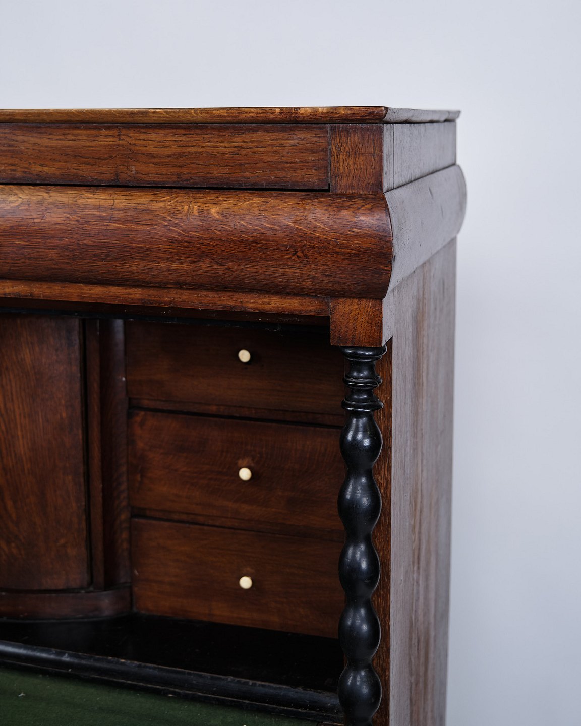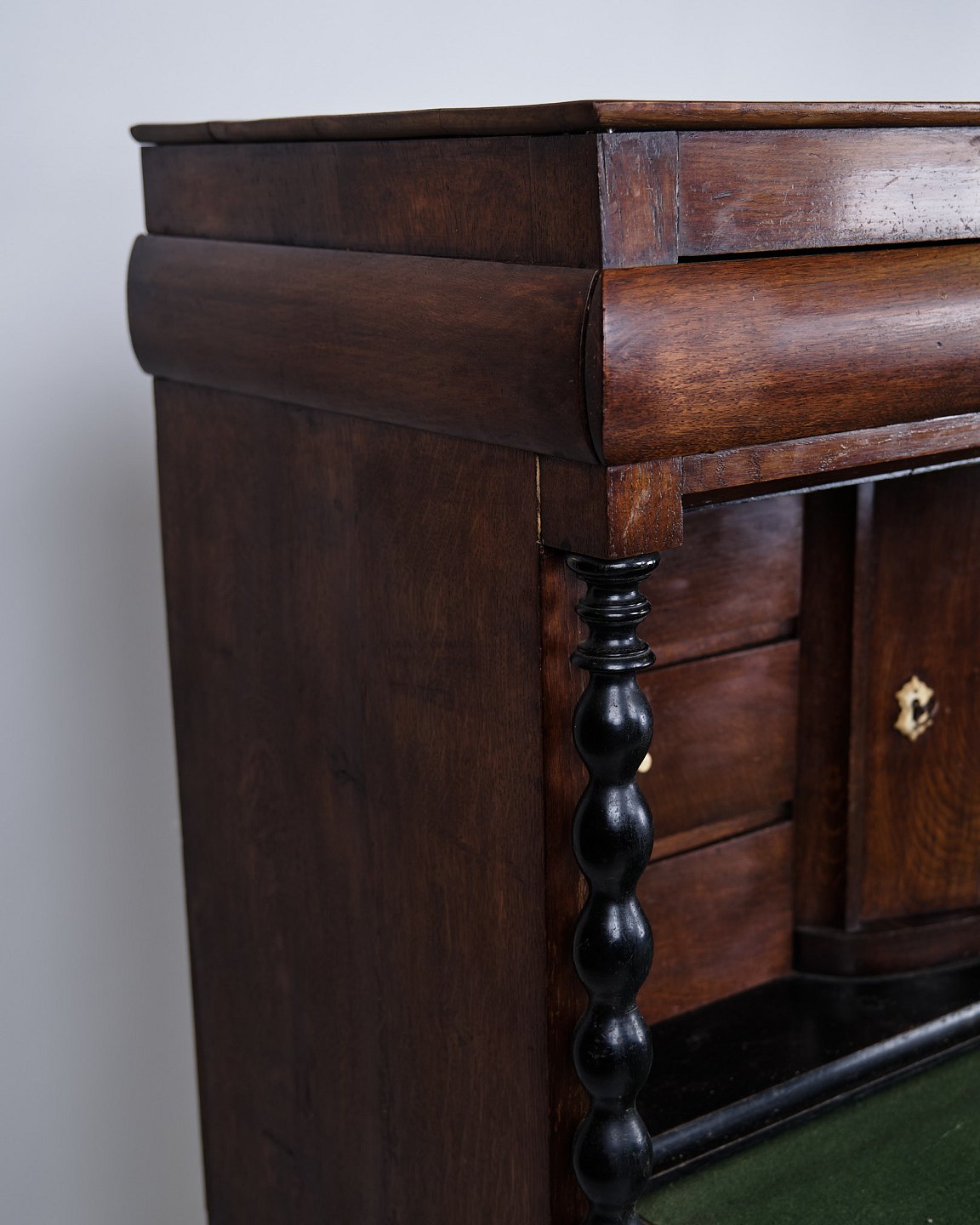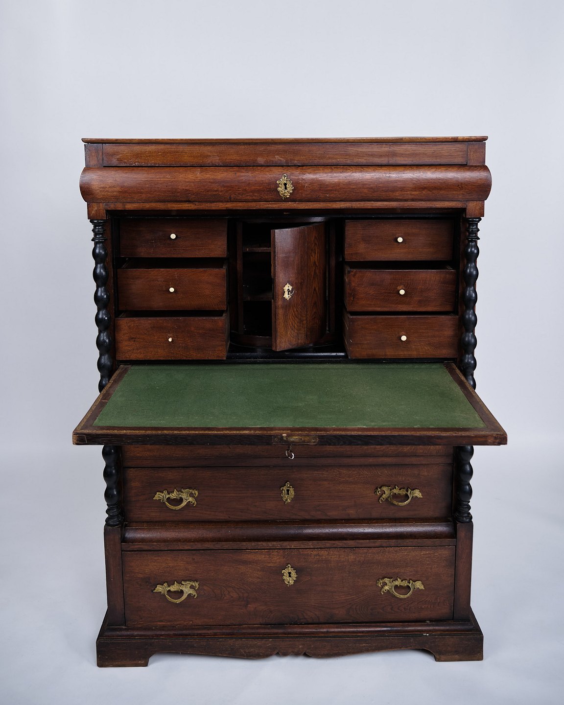 Text zugänglich auf Dänische: Antik sekretær fra 1820’erne. Egetræ med grøn filtdug og messinghåndtag. 4 skuffer.