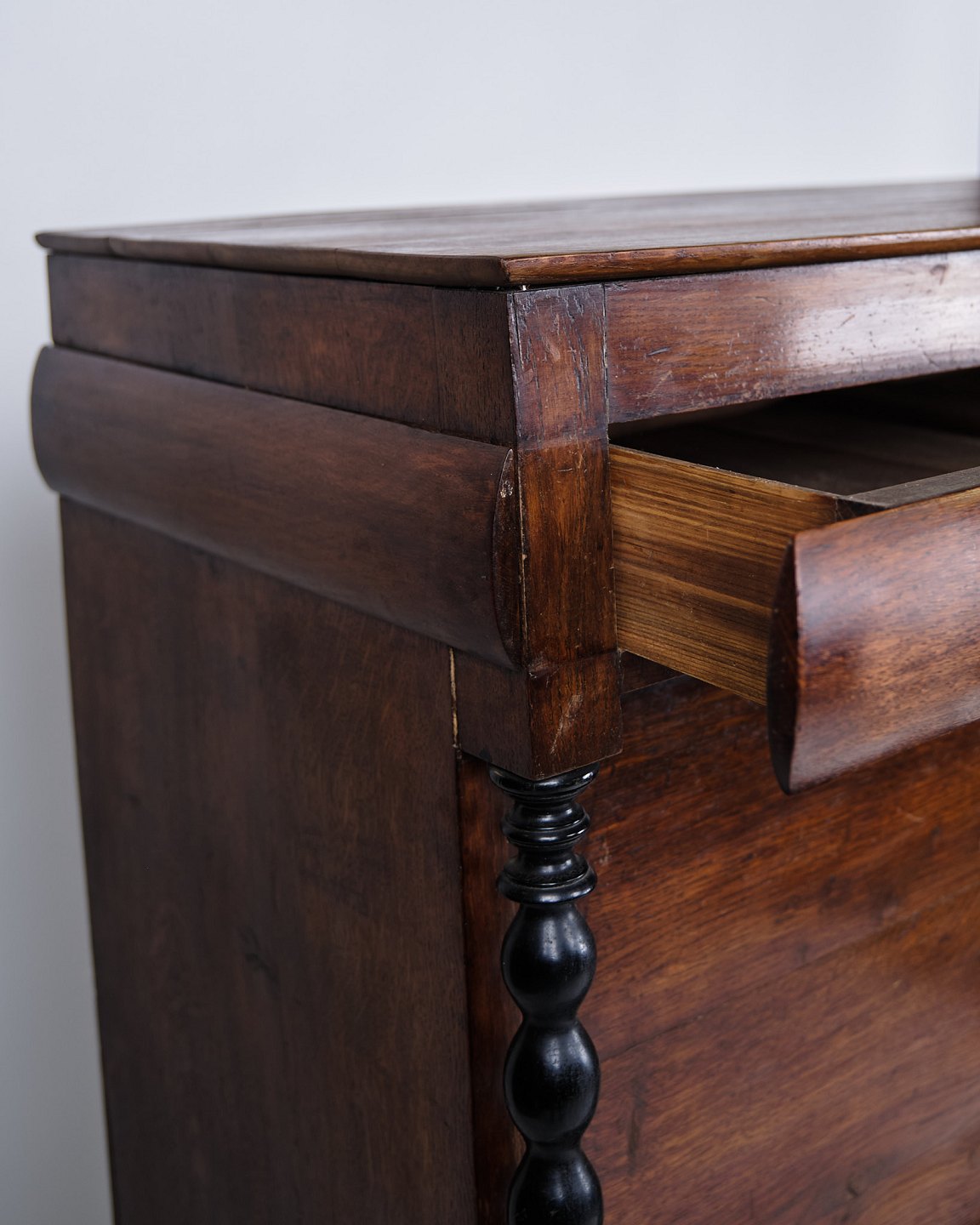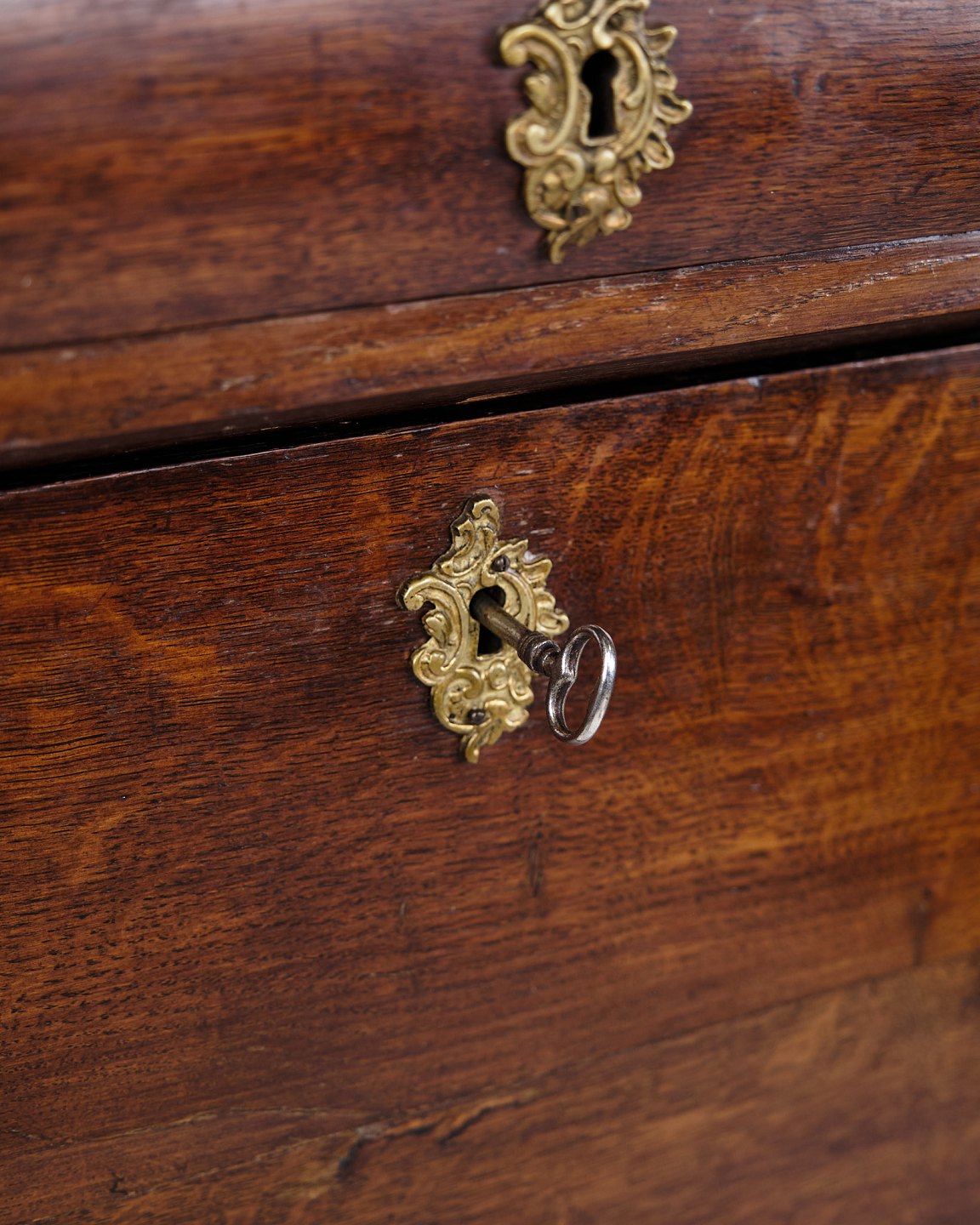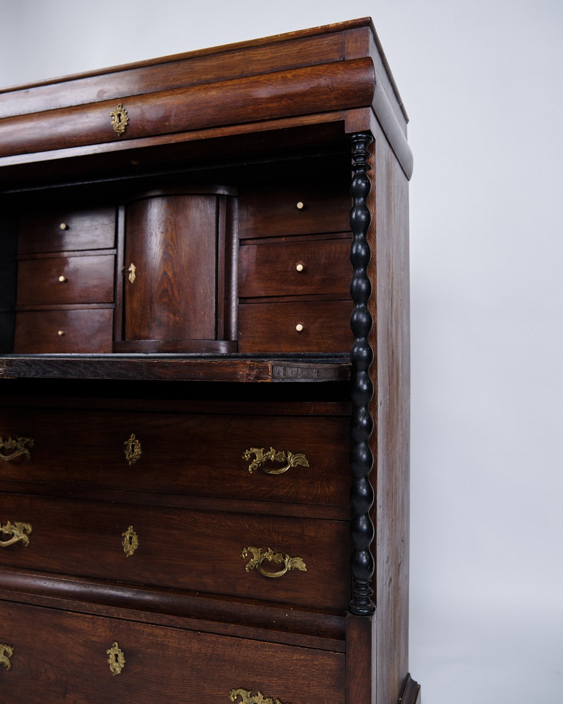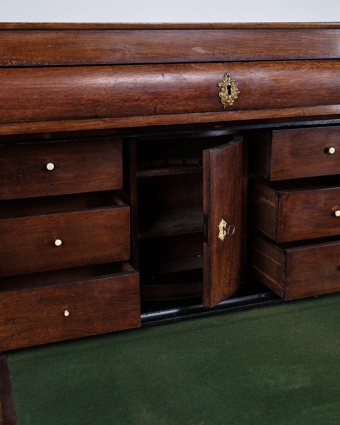 Text zugänglich auf Dänische: Antik sekretær fra 1820’erne. Egetræ med grøn filtdug og messinghåndtag. 4 skuffer.