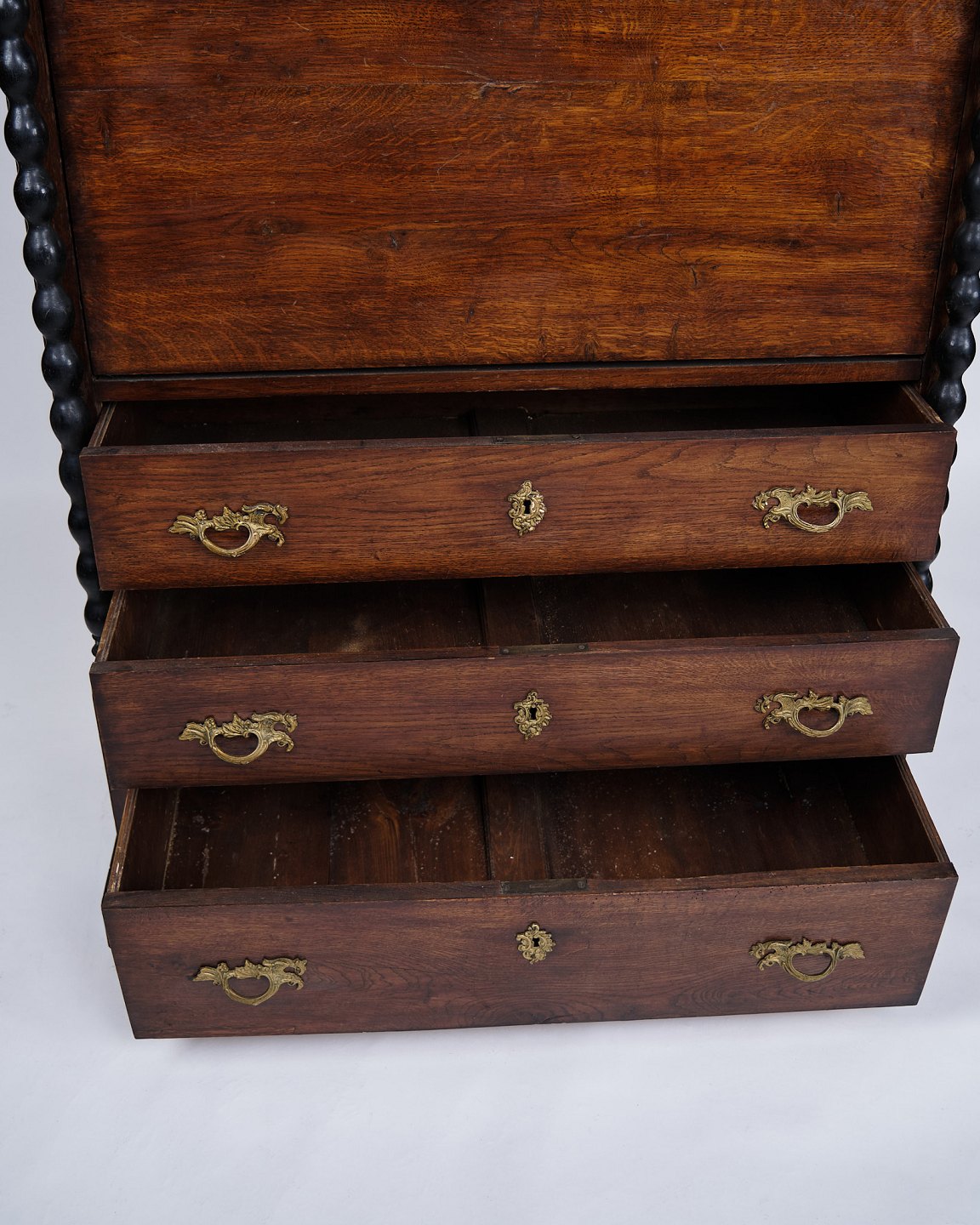 Text zugänglich auf Dänische: Sekretær – Poleret Egetræ – Grøn Filtdug & Messinghåndtag – 4 Skuffer – 1820’erne