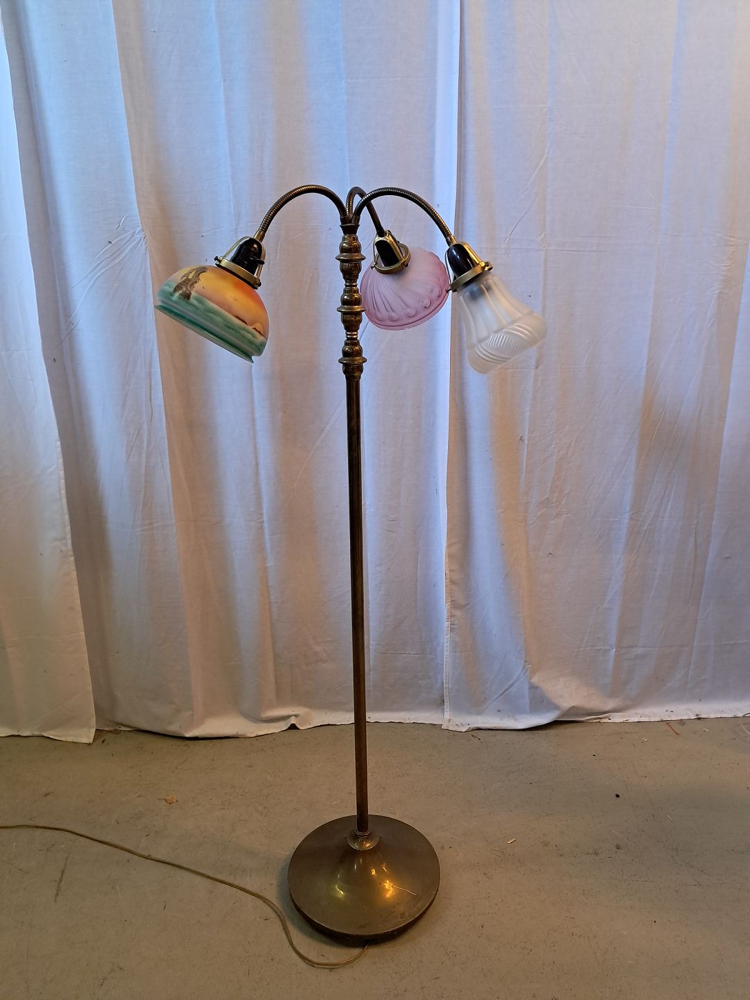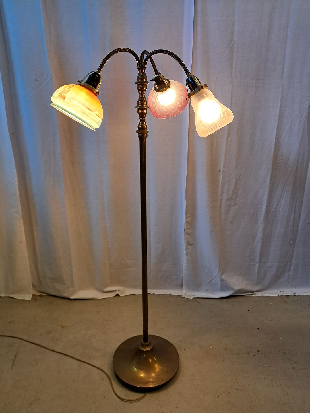 Gulvlampe i metal med 3 glasskærme, fra 1930erne.