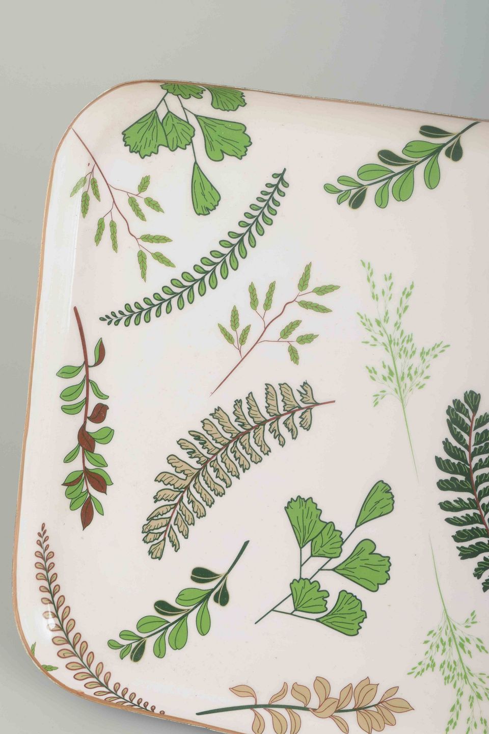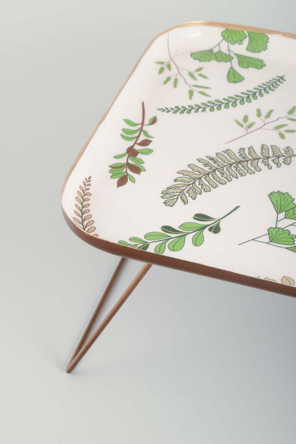 Rektangulært bakkebord med træramme og metalben. Bakken dekoreret med Josef Franks karakteristiske botaniske mønster med grønne blade og bregner på lys bund.