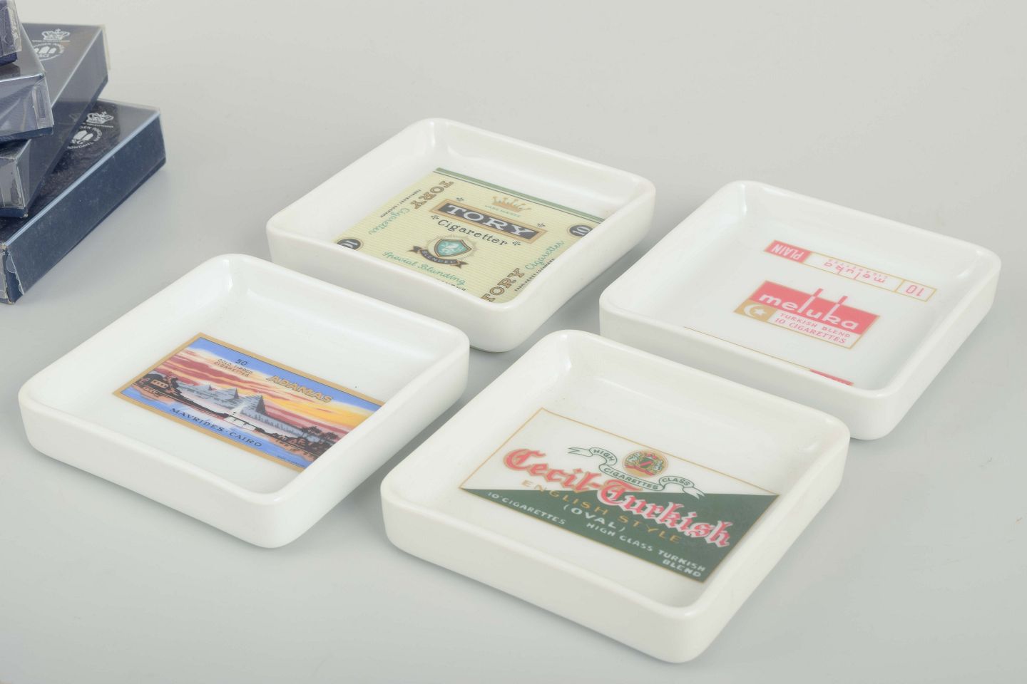 Sæt med fire kvadratiske porcelænsaskebægre, hver dekoreret med klassiske tobaks- og cigarmotiver. Leveres i originale æsker.