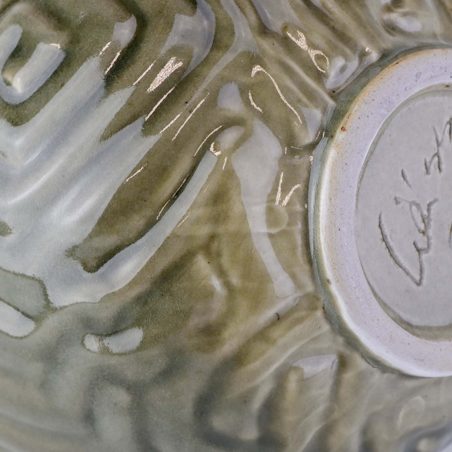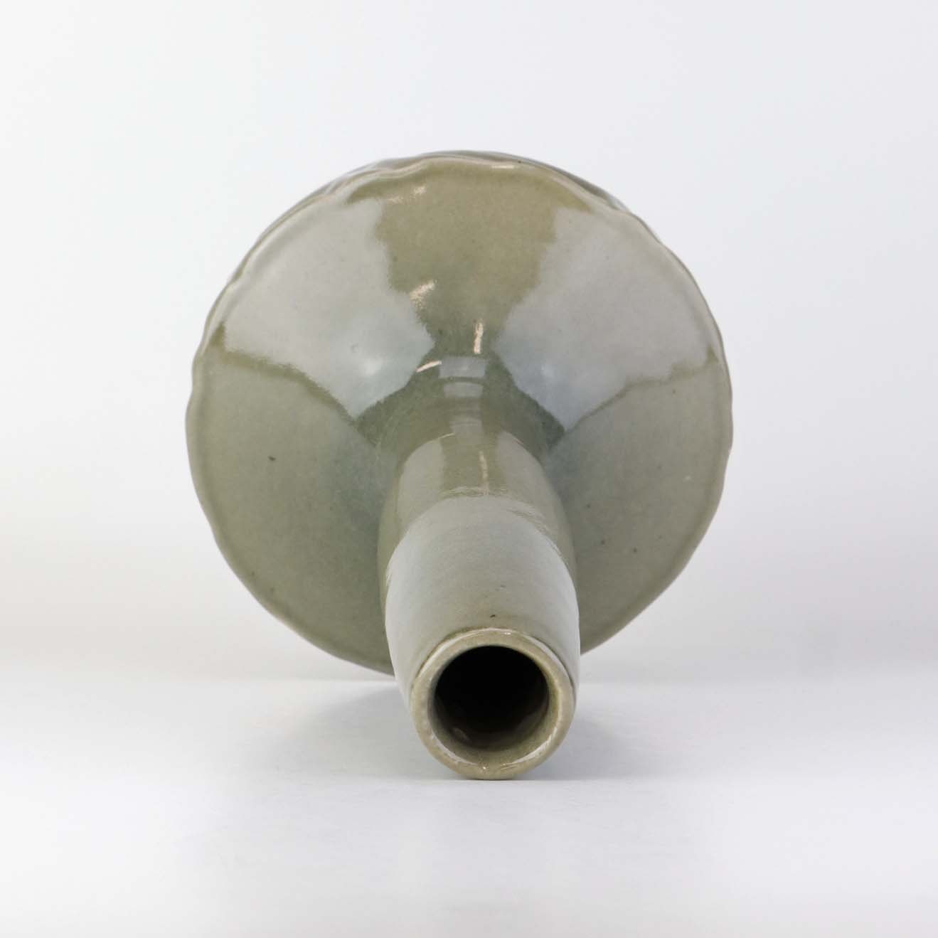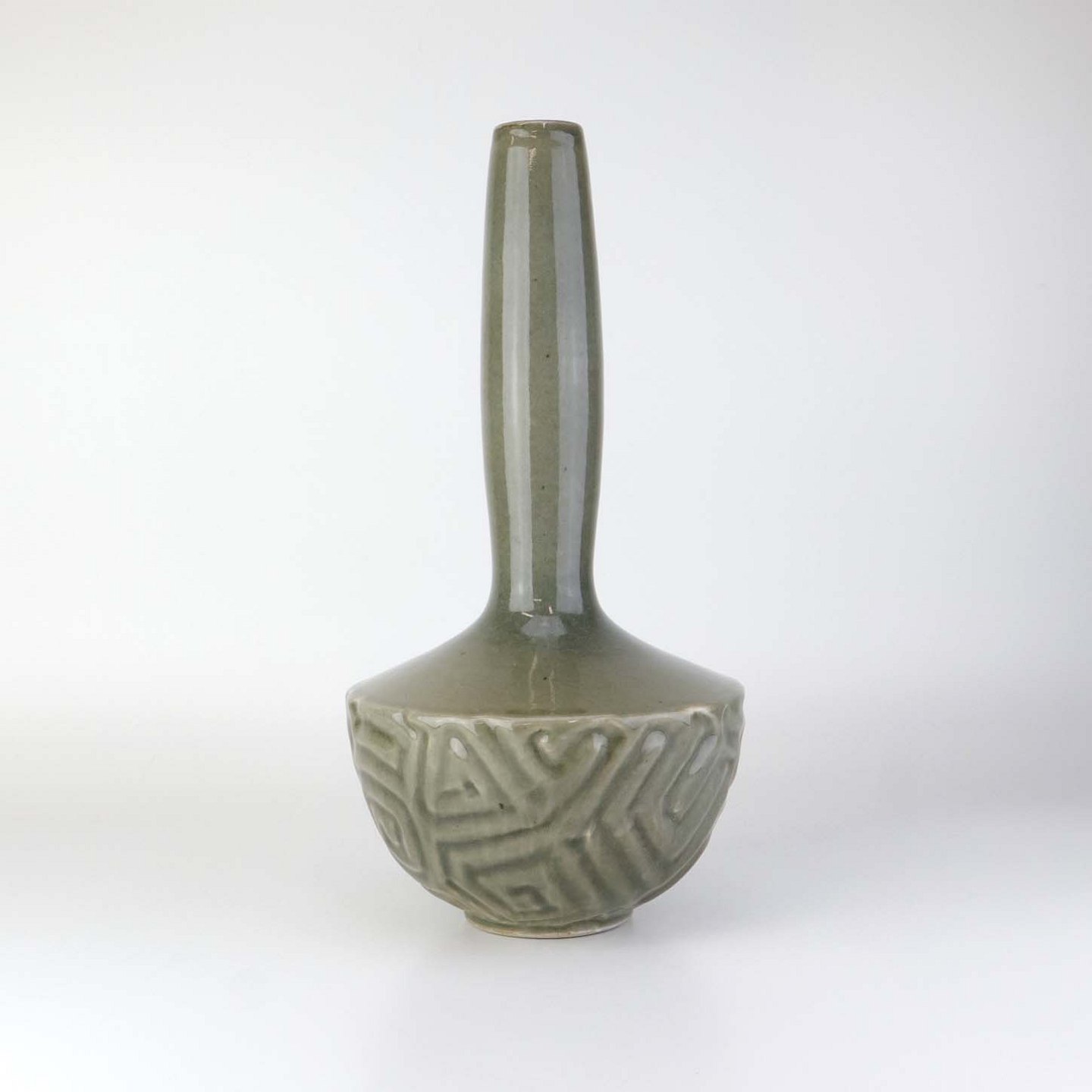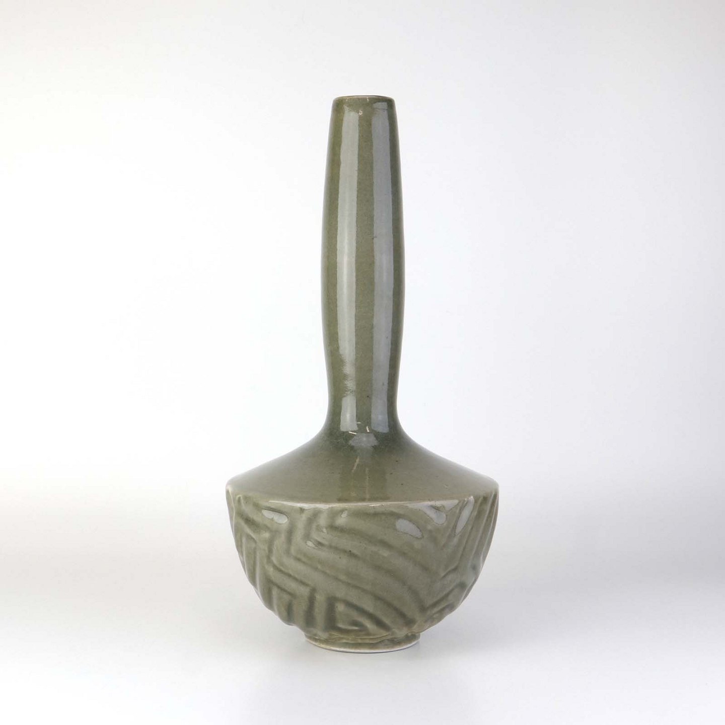 Unika vase i stentøj med celandonglasur og riflet geometrisk mønster.
