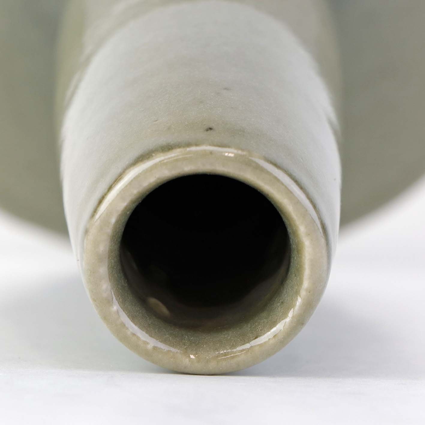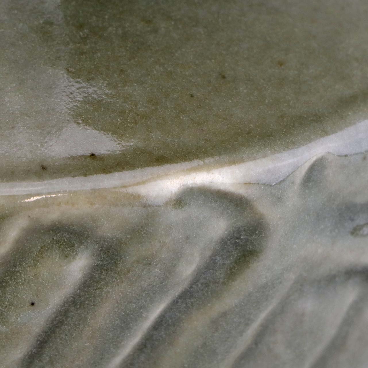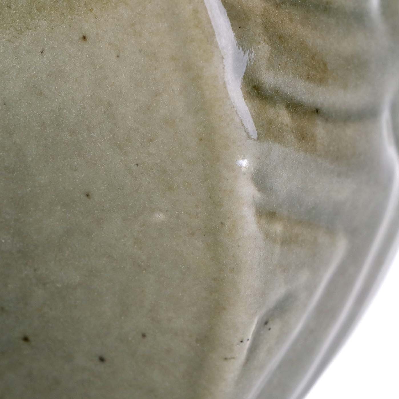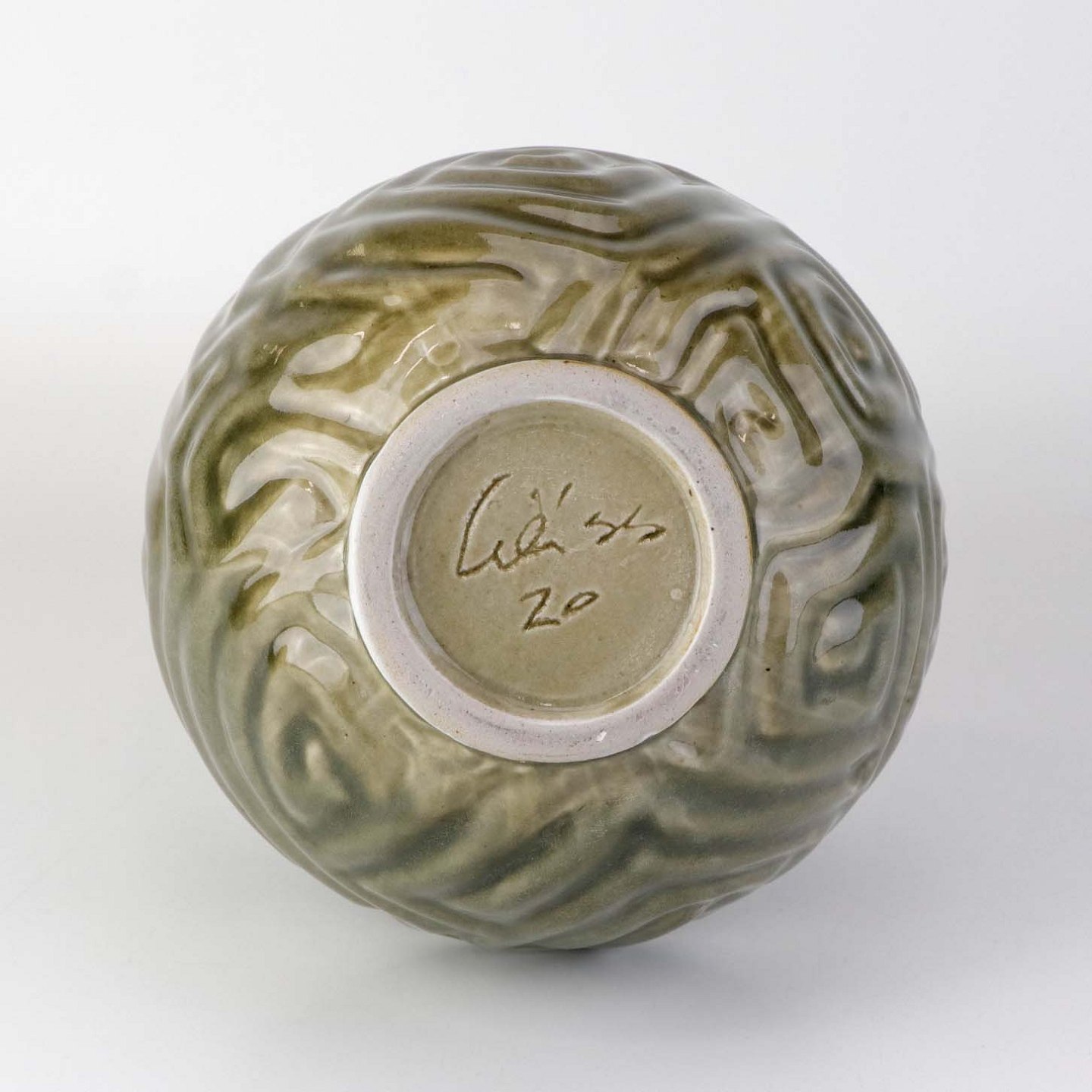 Unika vase i stentøj med celandonglasur og riflet geometrisk mønster.