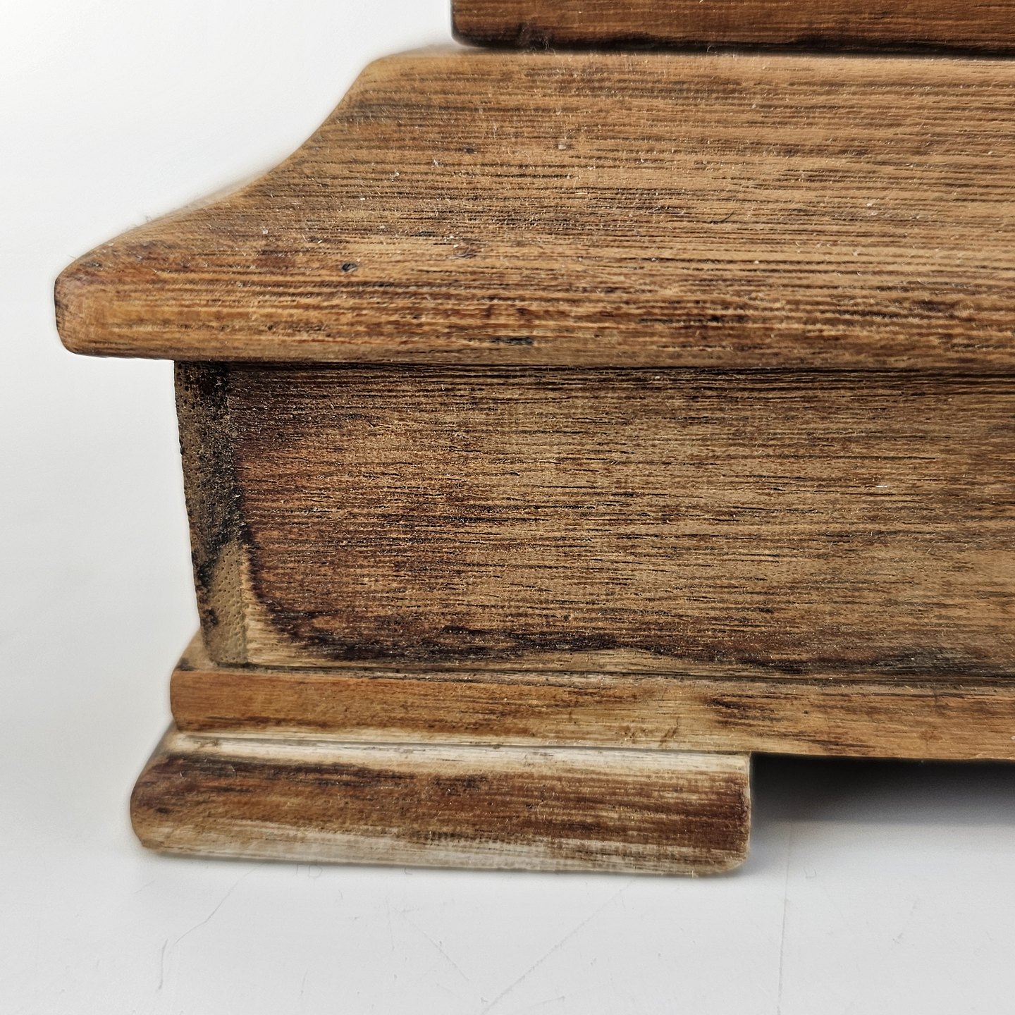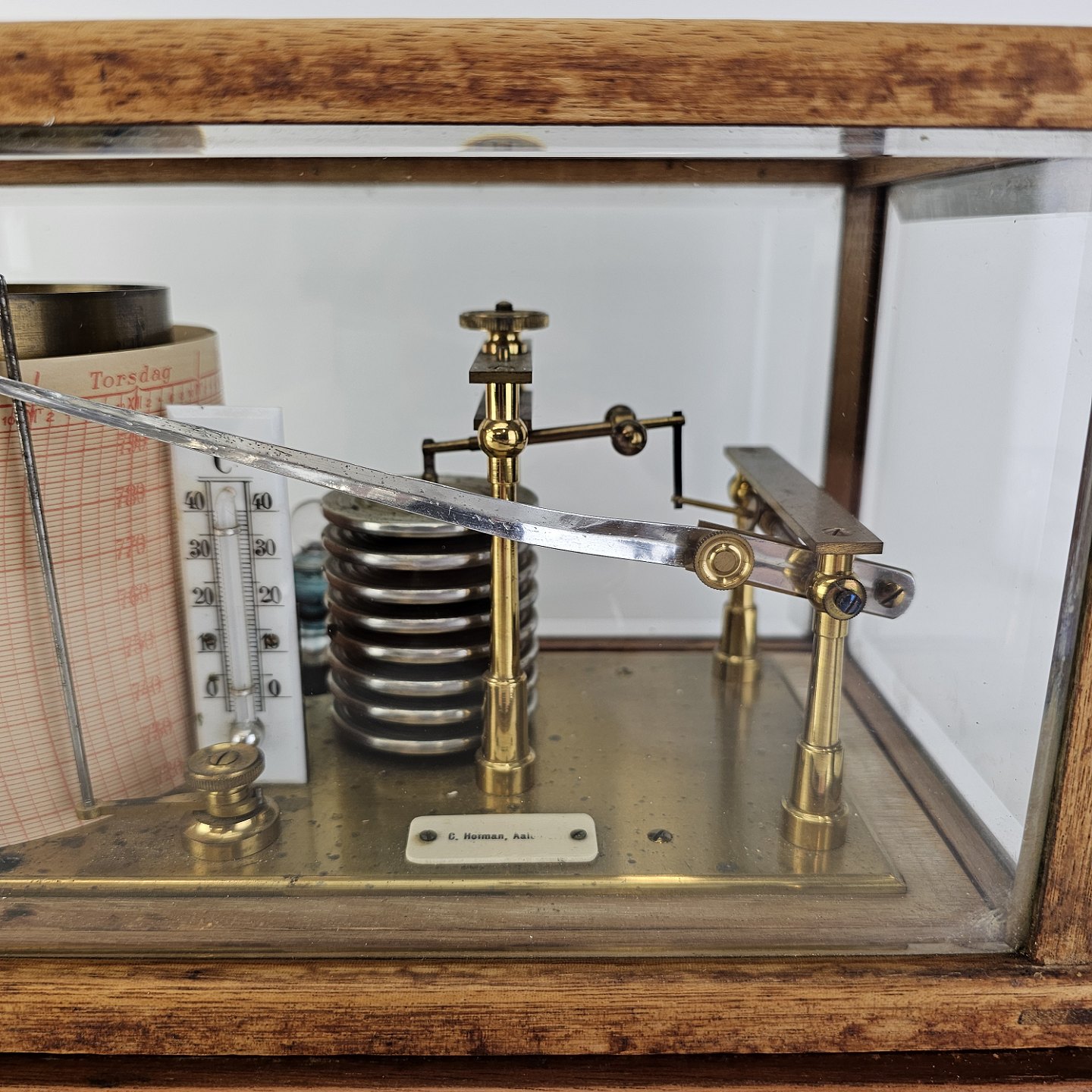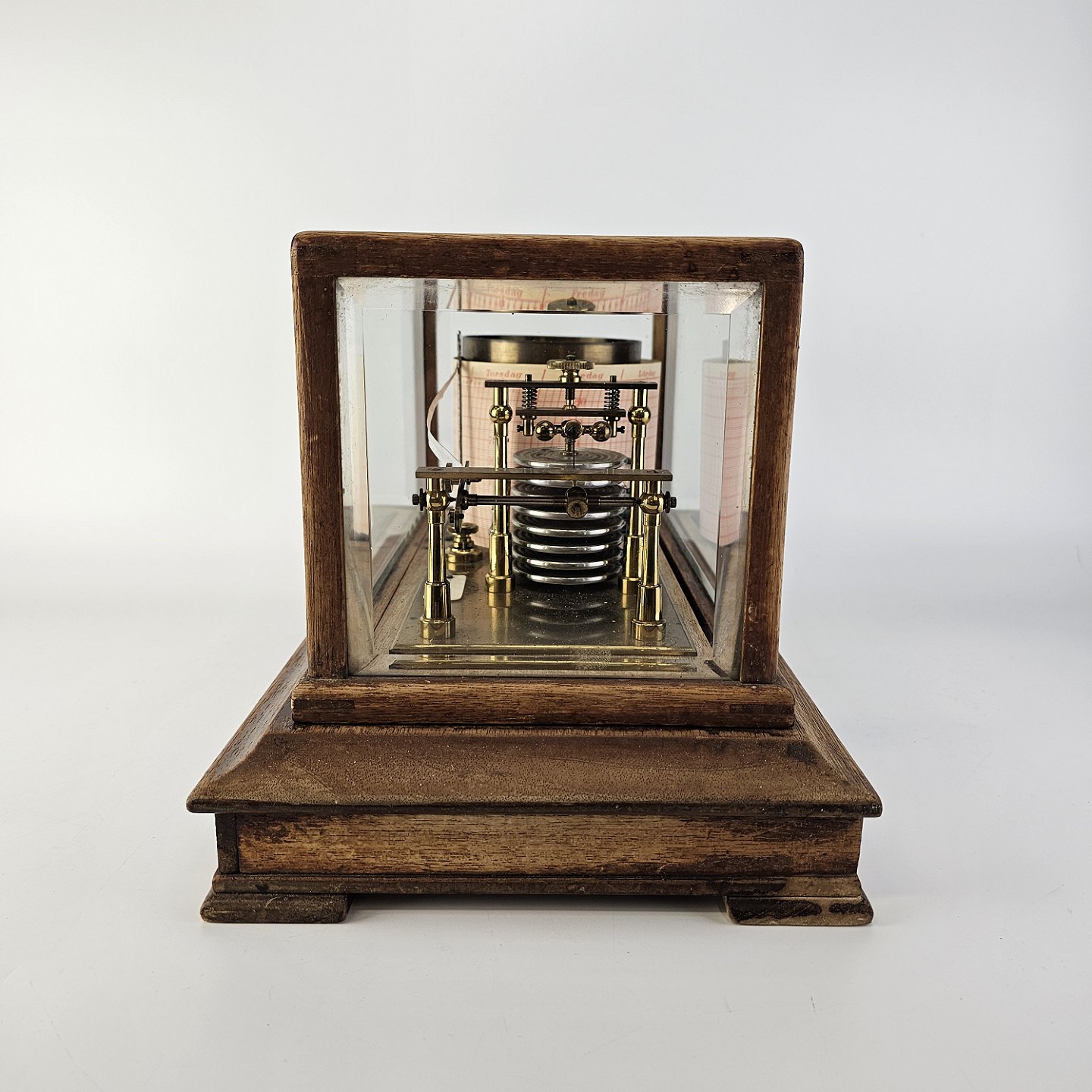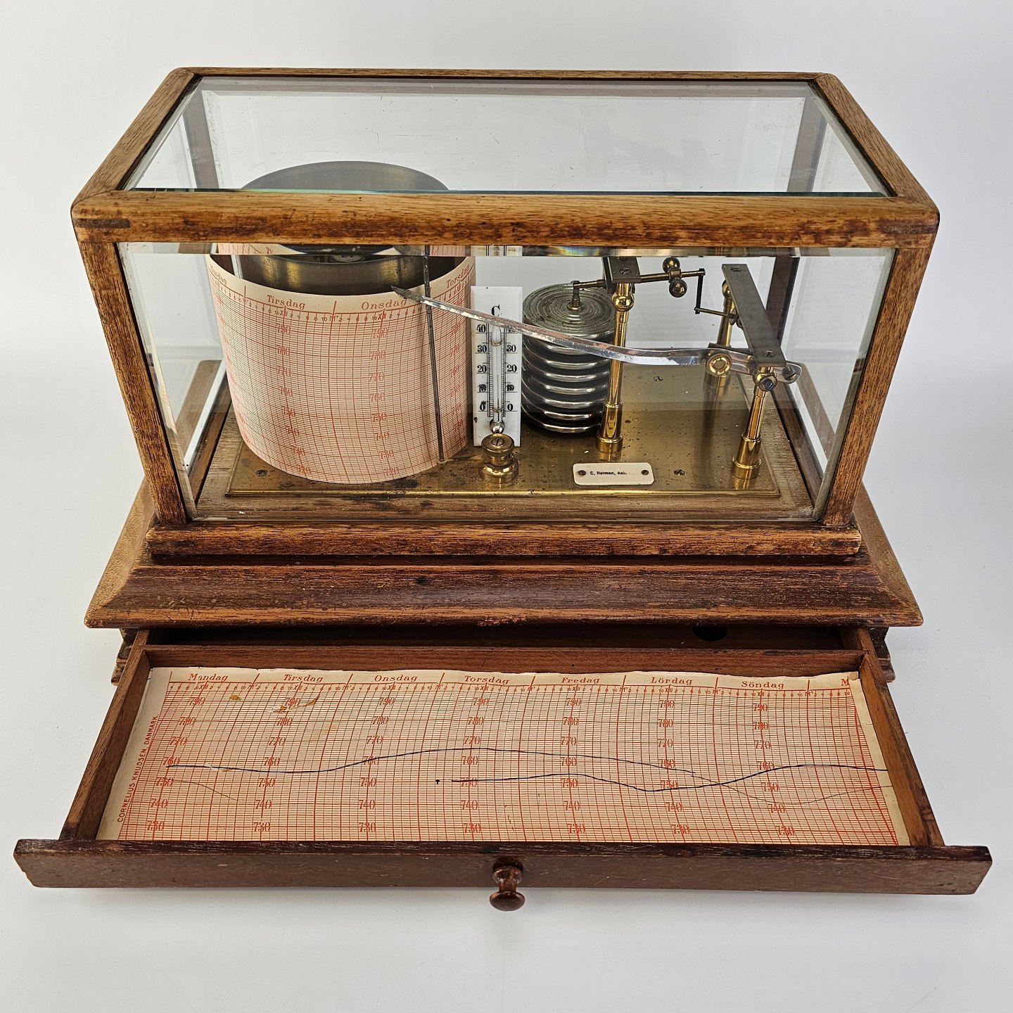 Barograf i kasse af træ og glas, med en skuffe i bunden