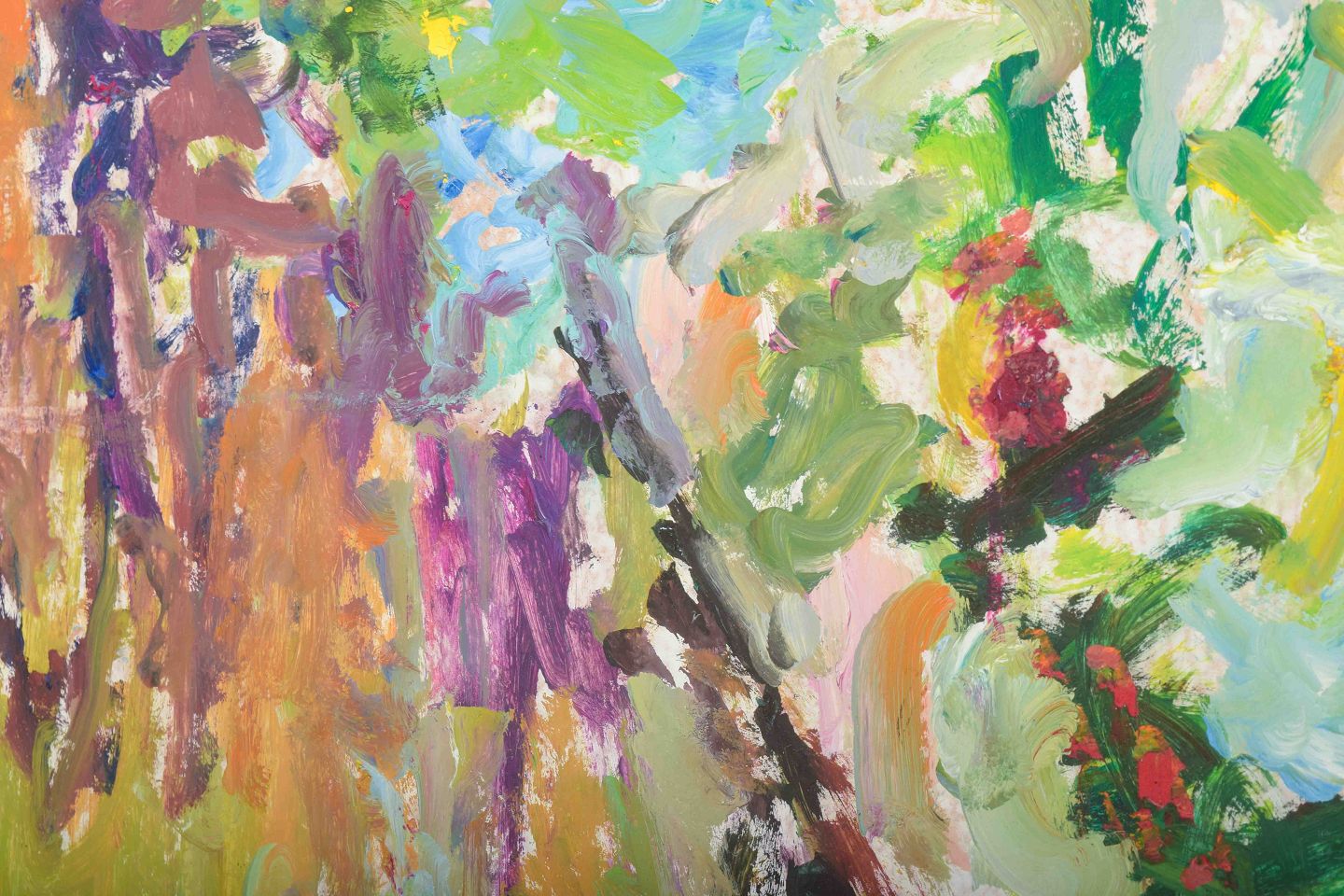 A colourful and expressive painting by the Swedish artist Inge Blomqvist. Executed with bold brushstrokes and a palette of greens, blues, purples and warm earthy tones, the work presents a vivid and decorative depiction of nature’s richness.