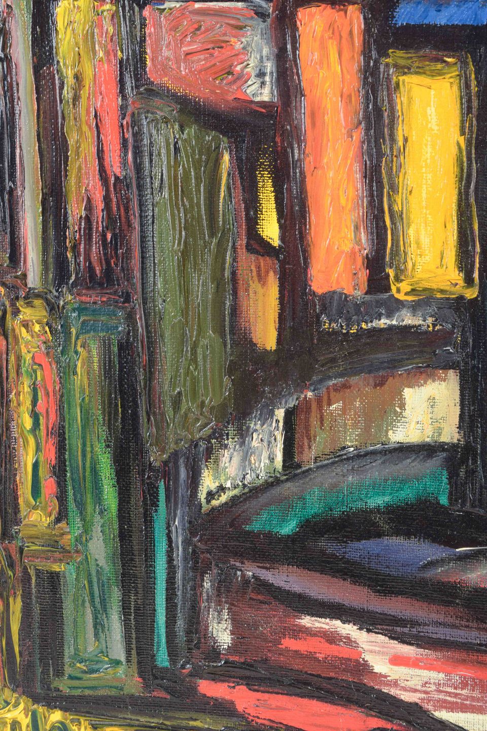 Et ekspressivt maleri af den svenske kunstner Tord Petter Berlin. Værket er udført med kraftige penselstrøg og en intens farvepalet i røde, gule, grønne og blå toner. Kompositionen er præget af geometriske former og arkitektoniske strukturer, der giver maleriet en dynamisk og rytmisk karakter.