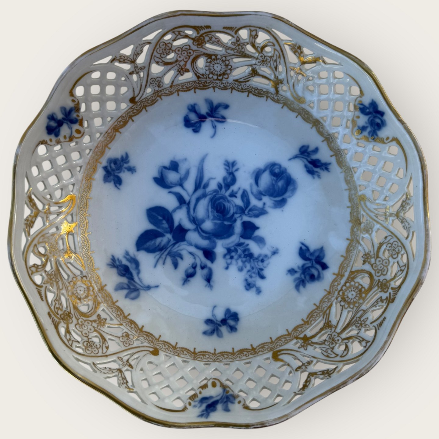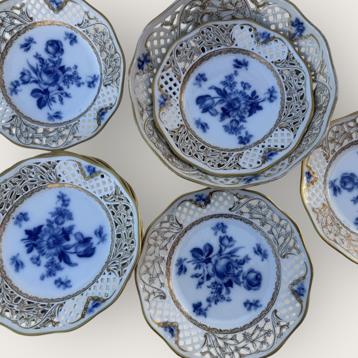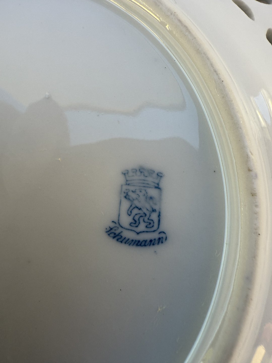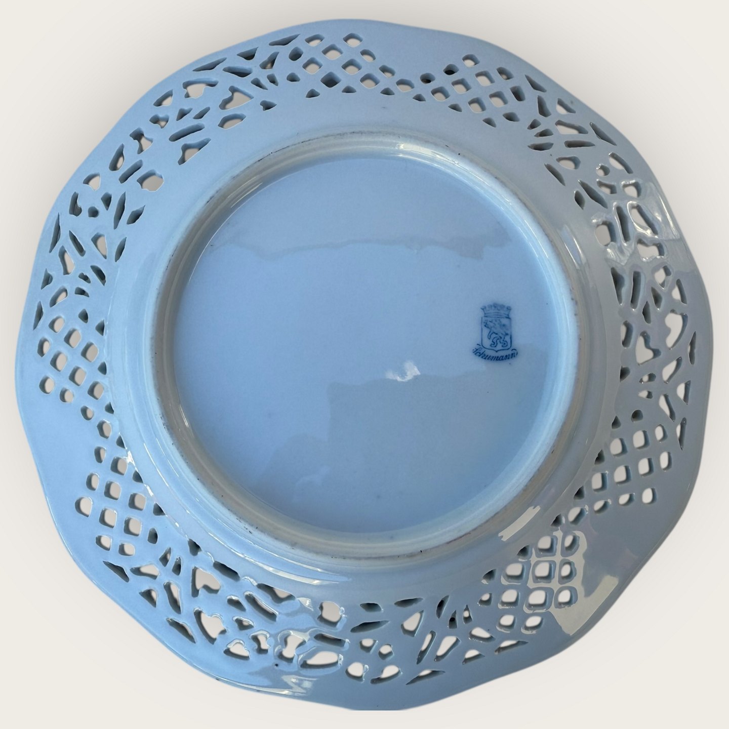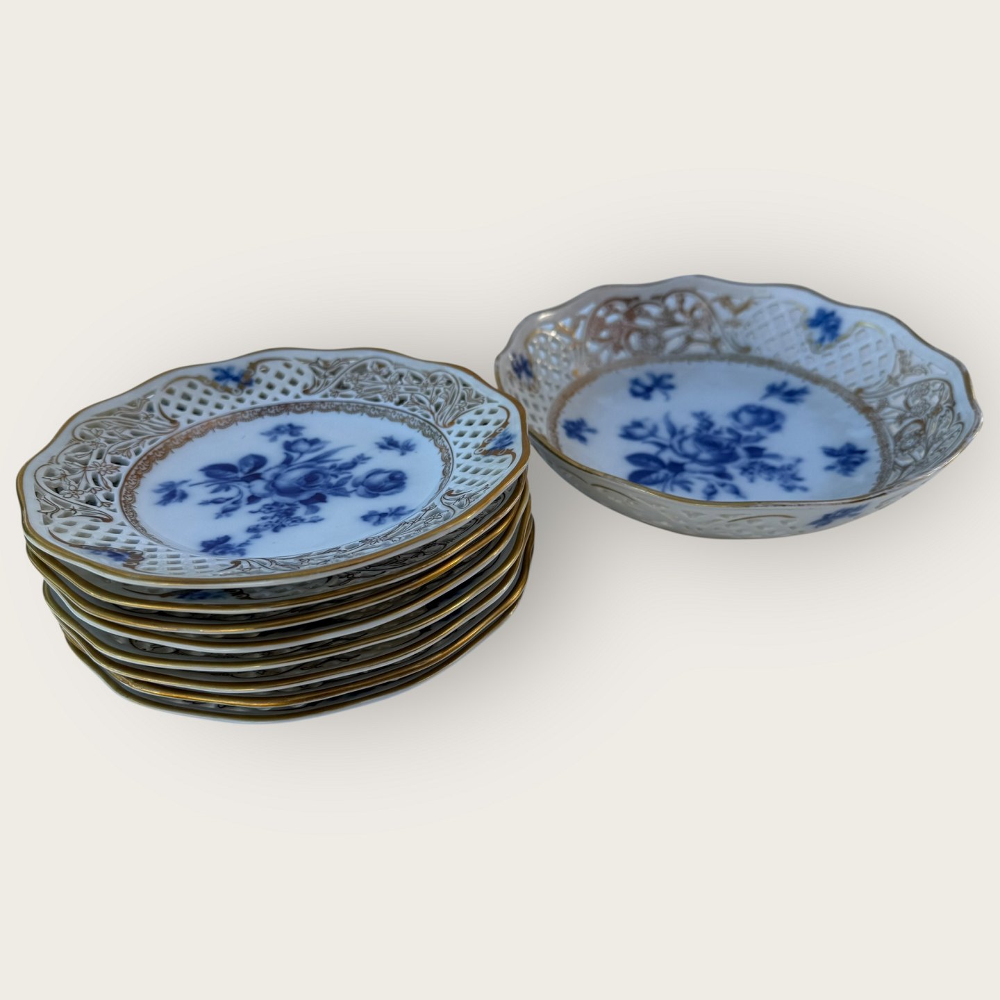 Schumann, Tyskland, Skål og 8 tallerkner med gennembrudt kant, lidt slid på skålens guldkant ellers pæn stand, Tallerken diameter 19cm, Skål diameter 23cm.