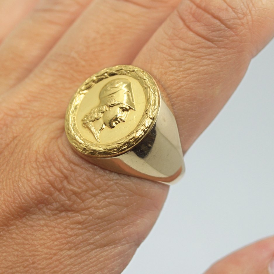 Frantz Hingelberg; Doktorring i 14 kt. guld. Plade i 23 kt. guld med motiv af Minervahoved omgivet af en laurbærkrans. Motivet at Athena/Minerva, den græsk-romerske gudinde for videnskab, har været brugt til doktorringe i Danmark siden 1866.