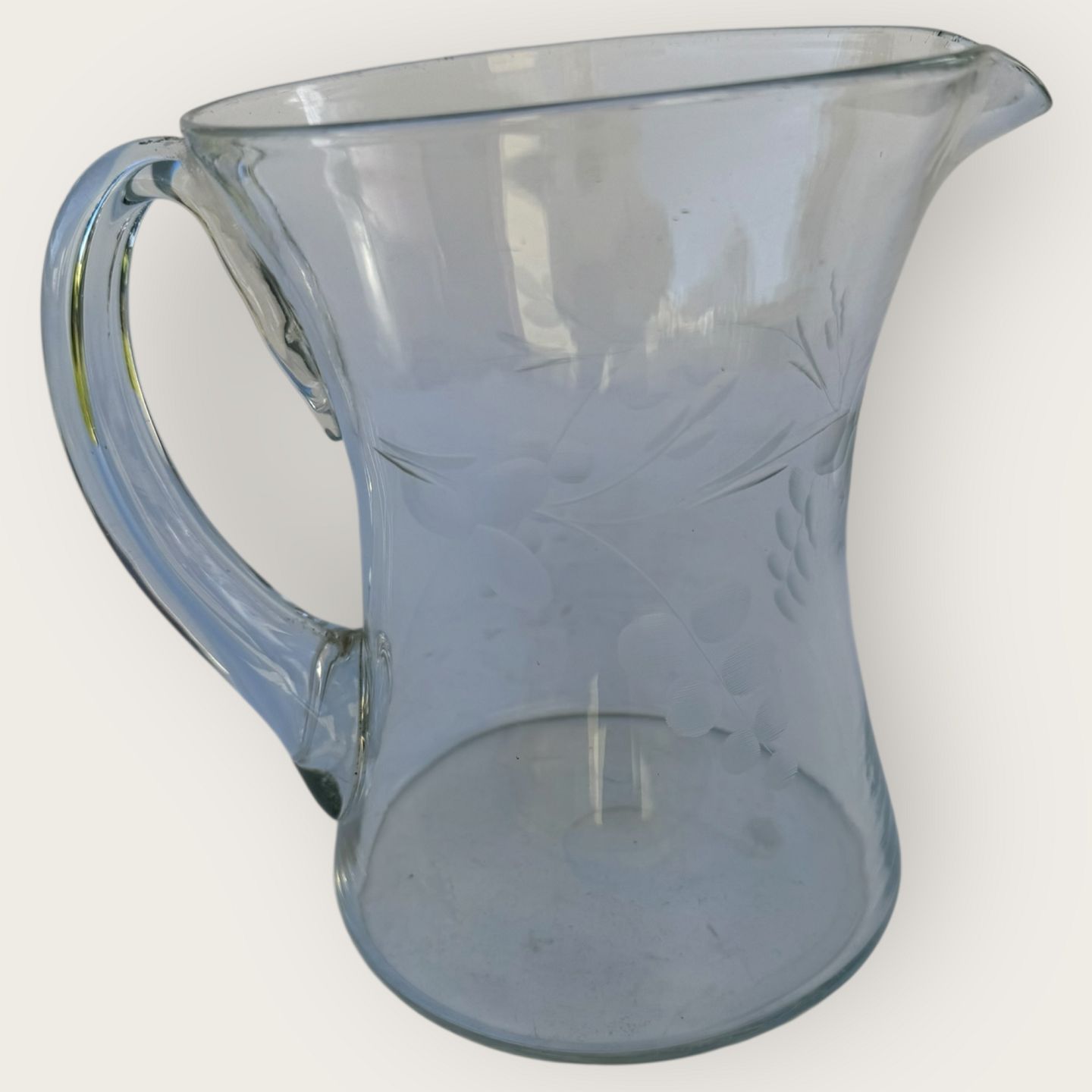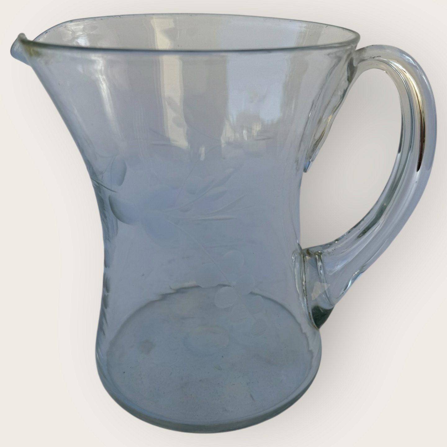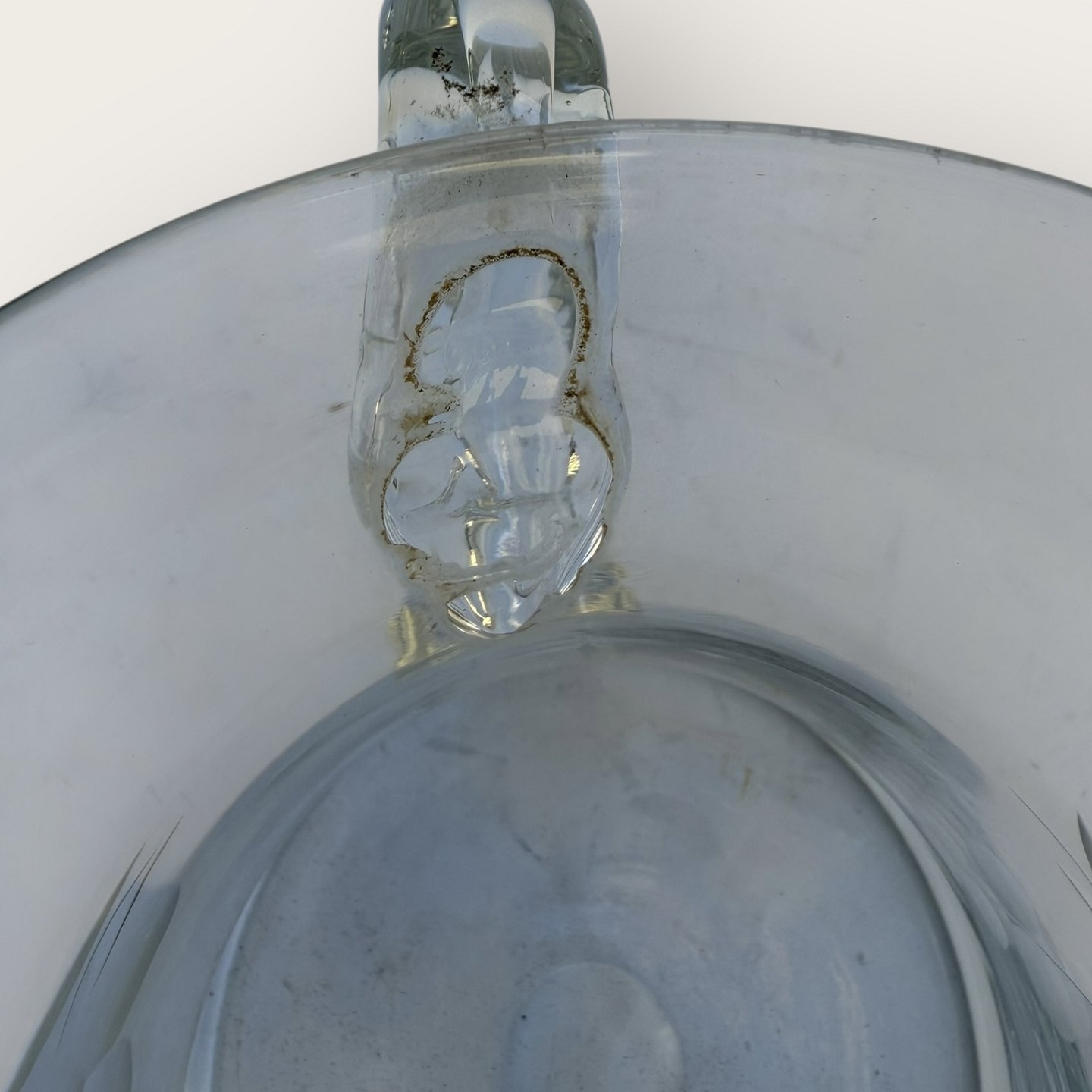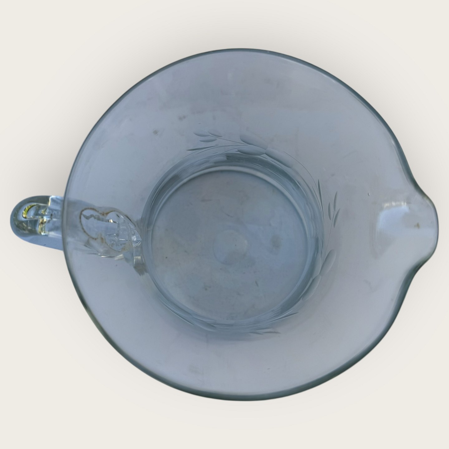 Bred glaskande med fine slibninger, Mål: HxBxD 17x19x13 cm, *Lidt kalk hvor hanken sidder fast på kanden(se foto) ellers pæn stand.