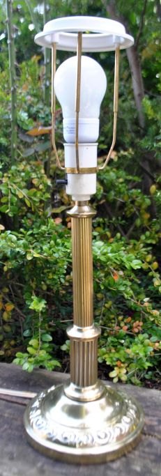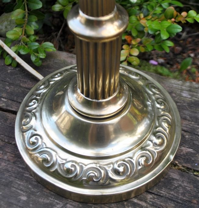 Messing bordlampe, 1920 - 1930, Danmark. Fodstykke med dekorationer. Kanneleret søjle. Højde uden el montering: 31 cm. Med montering: 50 cm.