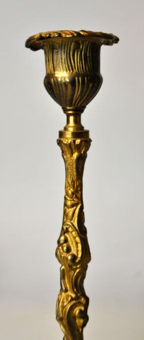 Par franske stager, 19. årh. Med udsmykninger af blomster og snoninger. På rund fod. H: 20 cm. Dia: 9,5 cm.
