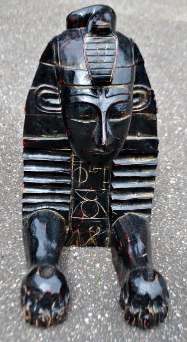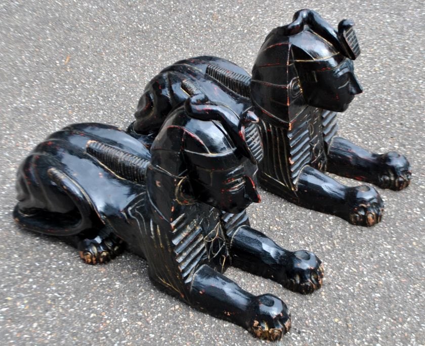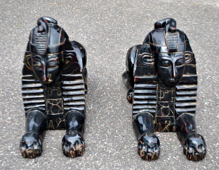 Paar große, dekorative, schwarz bemalte Sphinxen aus Holz, 20. Jahrhundert, Ägypten.