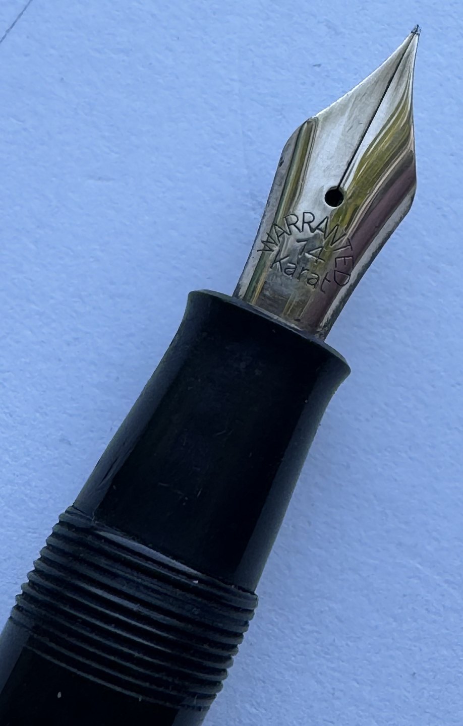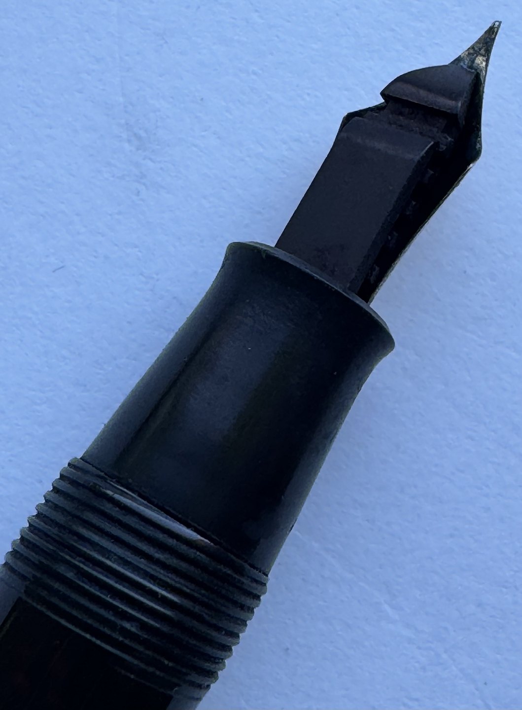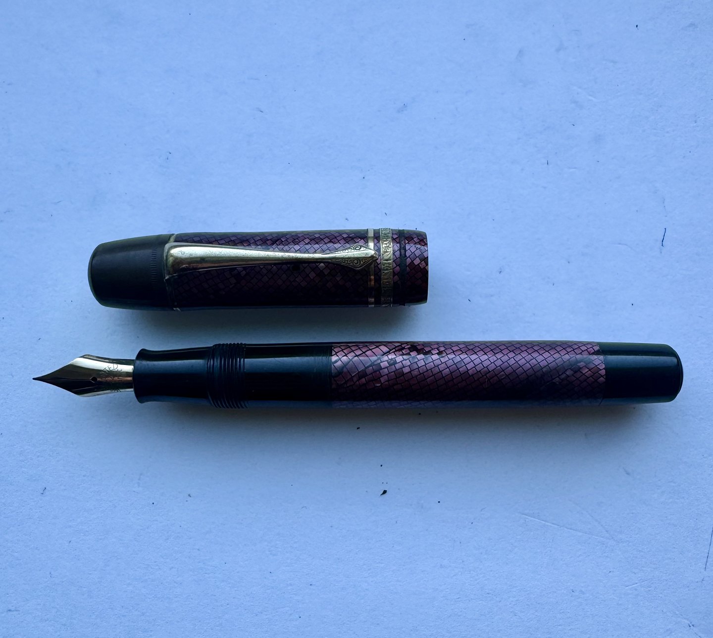 ART DECO STIL: Bordeaux slangeskind fyldepen fra omkring 1940. Fremstår i god stand uden skader eller reparationer. “Push button” blæk-påfylder. Fungerer ikke. Der skal isættes ny gummisæk før end den er funktionsdygtig igen. Ny gummisæk isættes mod en betaling på kr. 250,- Denne fyldepen er 12,5 cm lang.