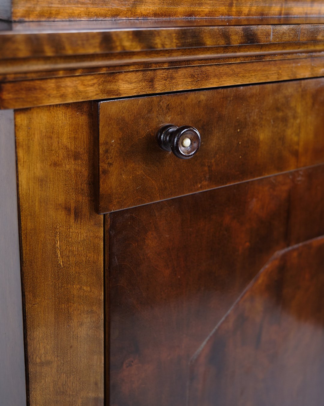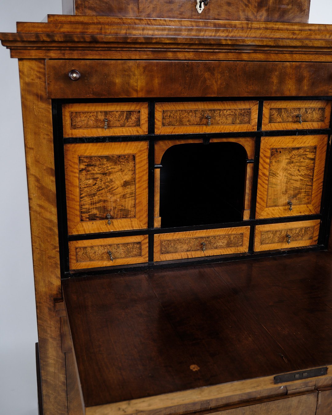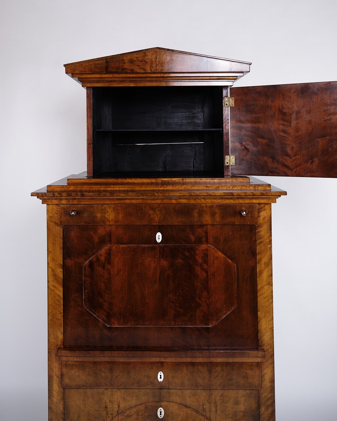 Text zugänglich auf Dänische: antik sekretær fra 1840’erne, udført i håndpoleret birketræ med smukke intarsia-detaljer. Møblet er indrettet med to skuffer og fremstår som et fint eksempel på 1800-tallets klassiske snedkerhåndværk, hvor funktionalitet og dekorativt udtryk blev forenet.