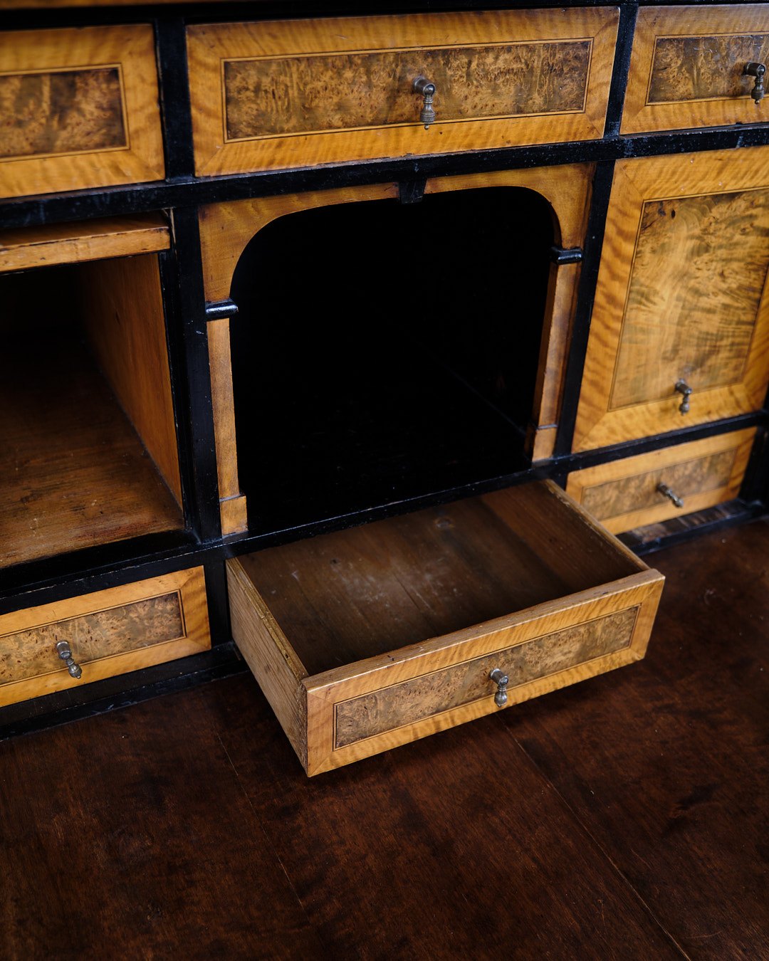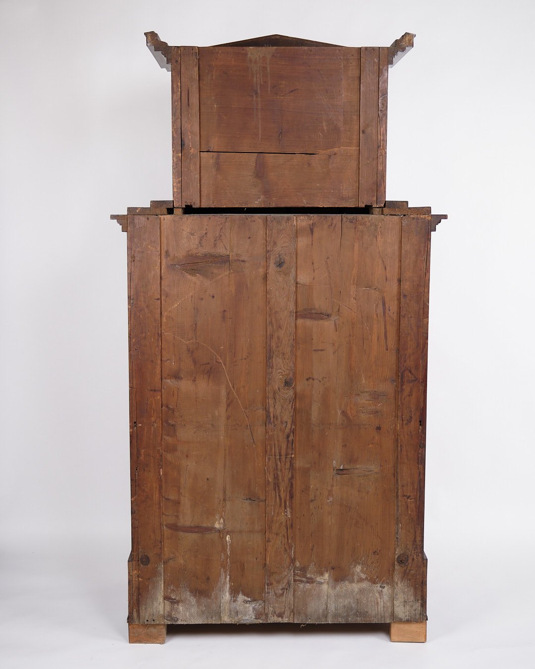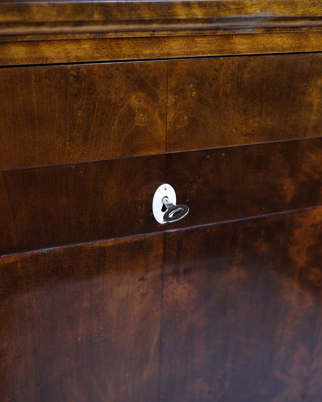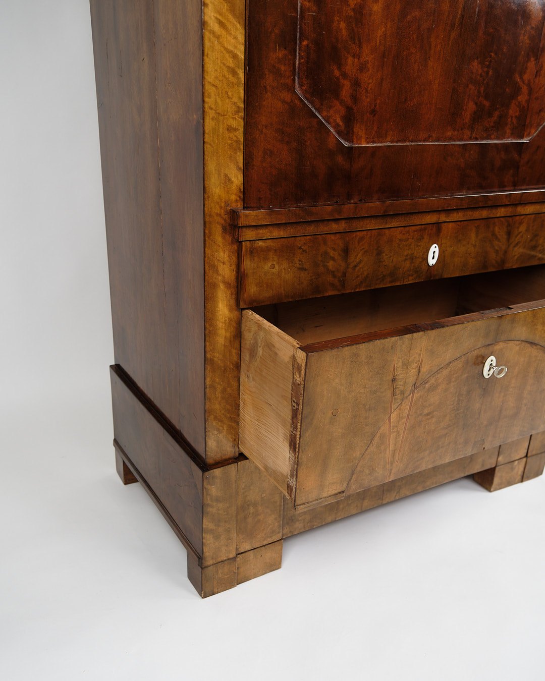 Text zugänglich auf Dänische: antik sekretær fra 1840’erne, udført i håndpoleret birketræ med smukke intarsia-detaljer. Møblet er indrettet med to skuffer og fremstår som et fint eksempel på 1800-tallets klassiske snedkerhåndværk, hvor funktionalitet og dekorativt udtryk blev forenet.